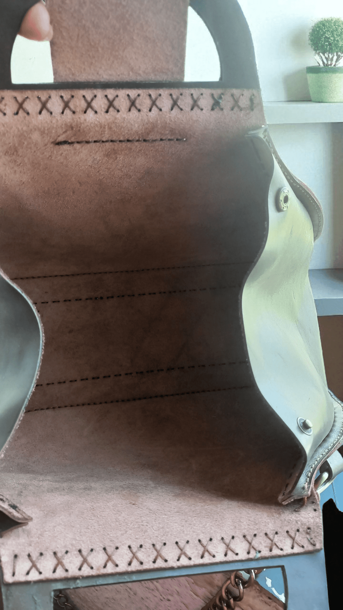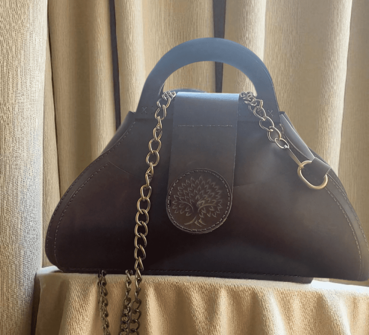 شنطه حريمى جلد طبيعى هاندميد لون بنى موديل مميز أبعاد ٣٨ × ٣٠ جلد طبيعى بولاب يد خشب مكسوه جلد خياطه يدوى سعه كبيره سلسله اكسوداى