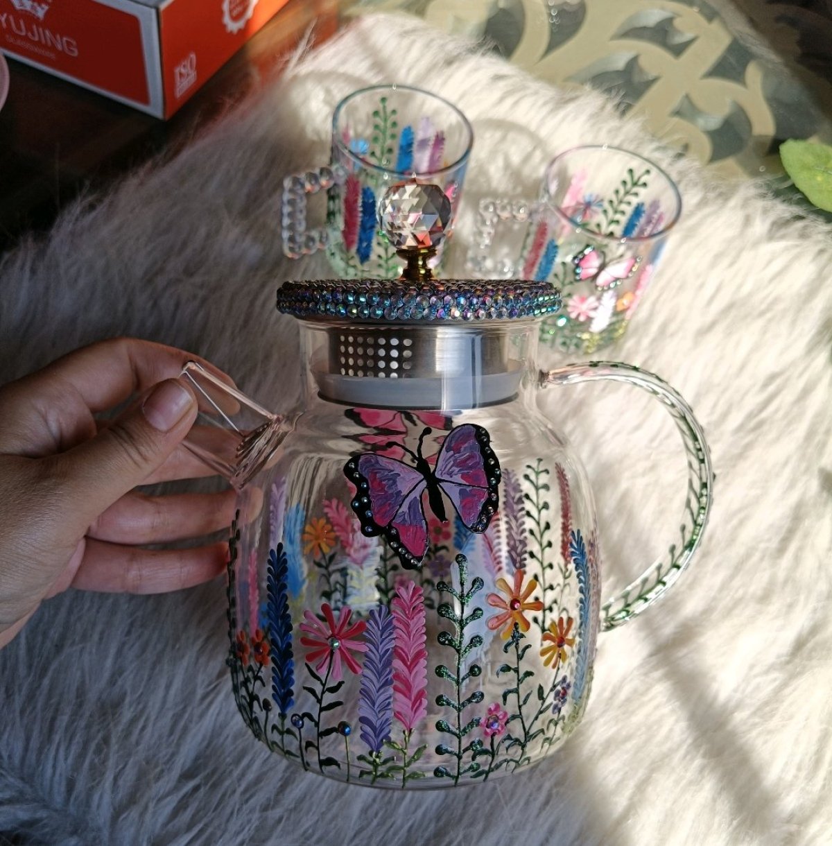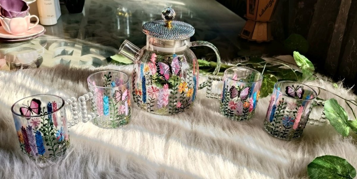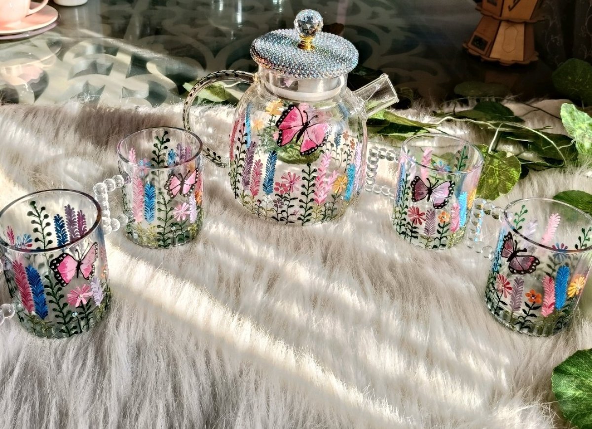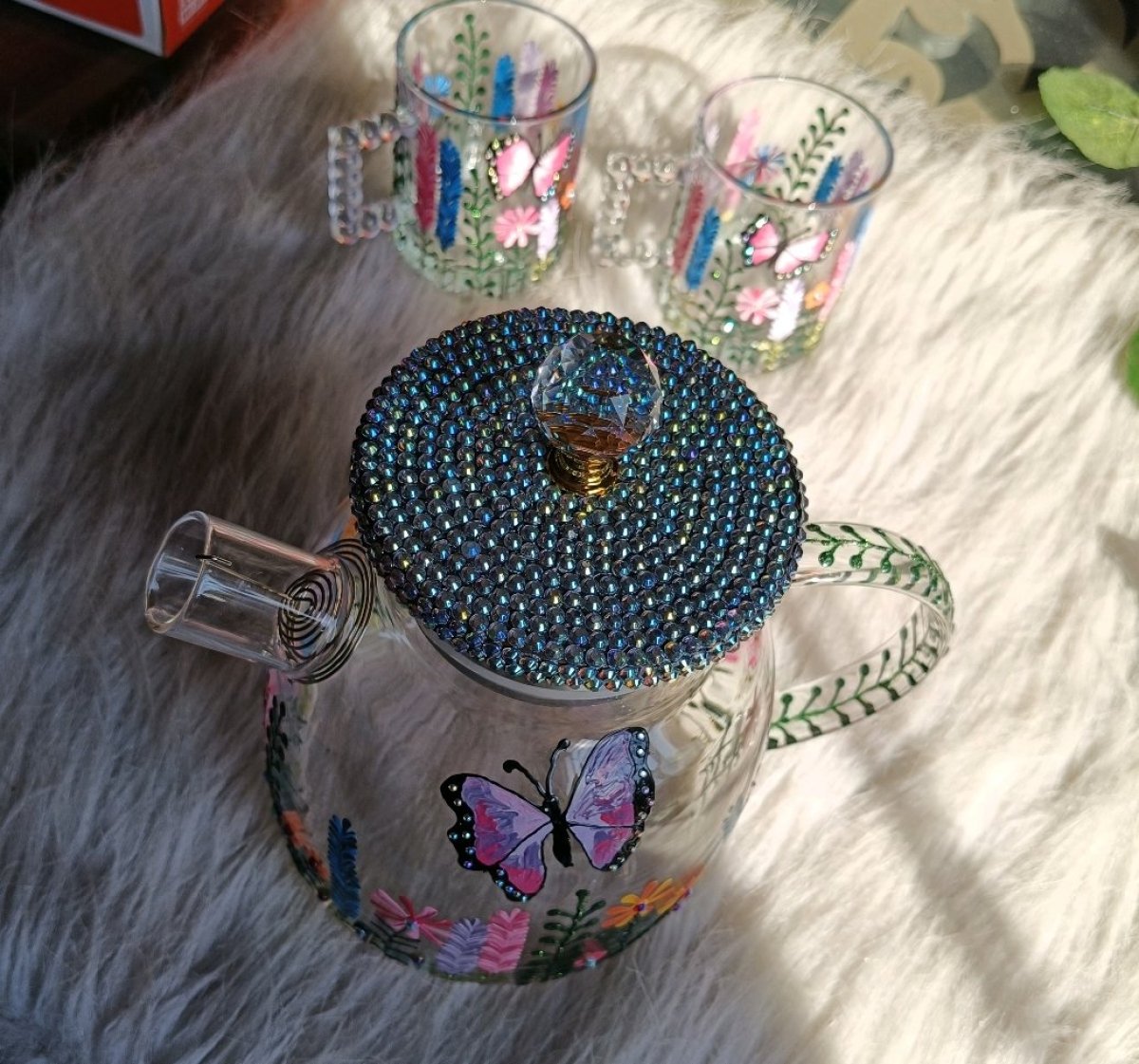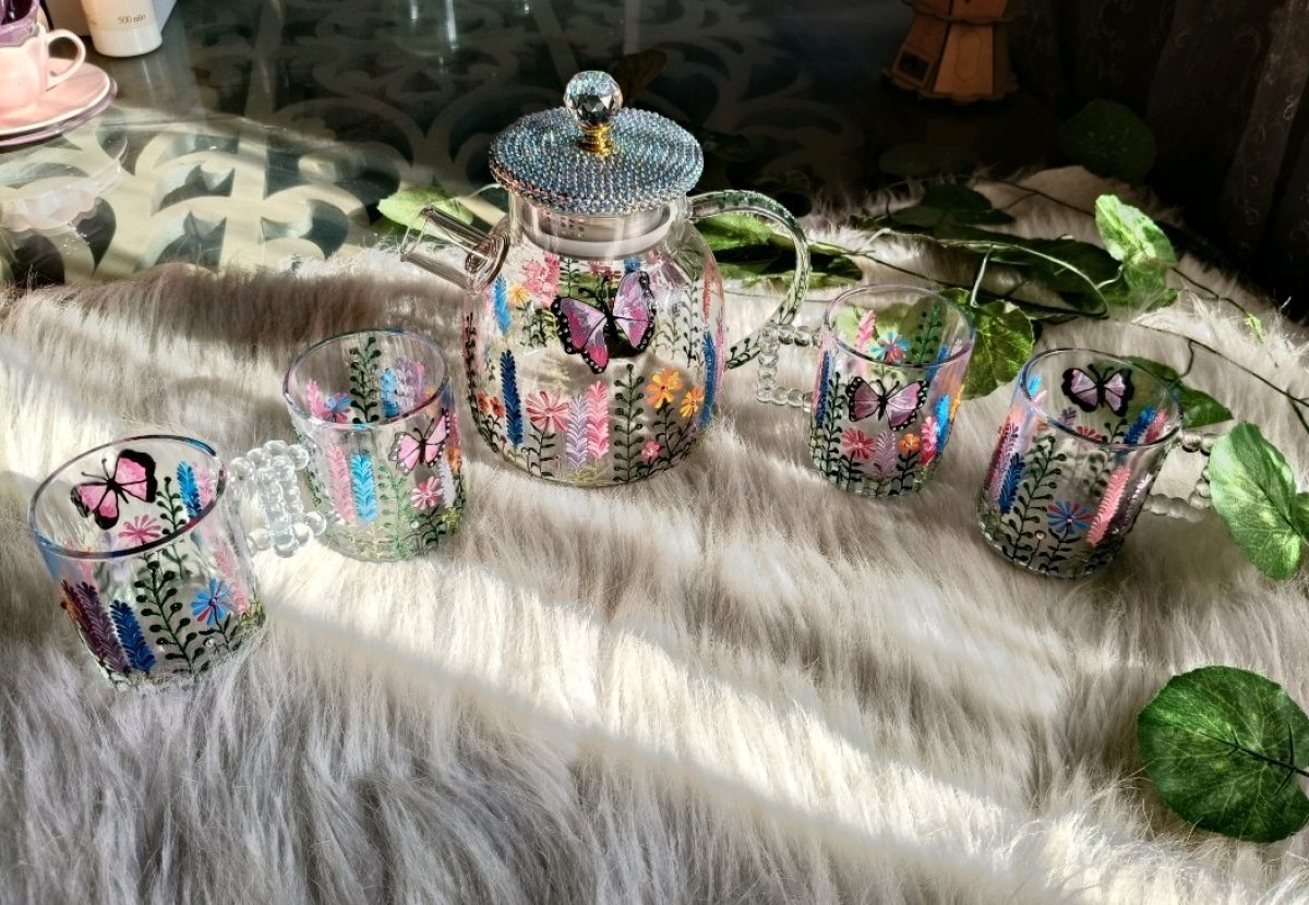 طقم شاي من الزجاج البايركس * براد حجم ٢ لتر يمكن وضعه على النار * ٤ اكواب حجم ٢٥٠ مل