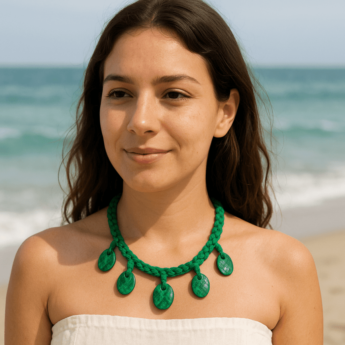 Handmade crochet necklace featuring natural wooden beads in a vibrant green finish. Lightweight, eco-friendly, and stylish — perfect for adding a touch of bohemian charm to your beach or casual look.