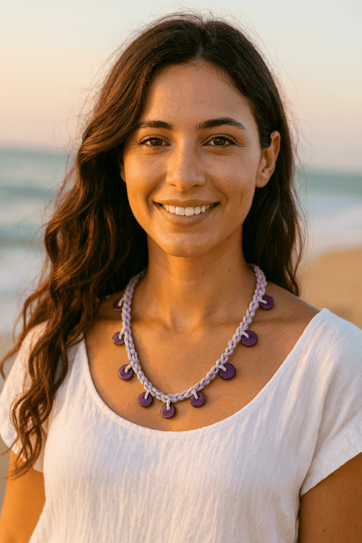 A handmade lavender crochet necklace accented with smooth, round purple wooden beads. Lightweight and bohemian, it adds a playful yet elegant touch, perfect for beach outings or casual summer looks.