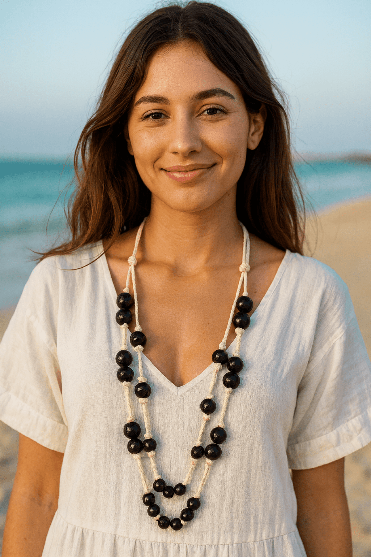 A handcrafted double-layer necklace featuring glossy black wooden beads strung on natural beige macramé cord. Lightweight and versatile, this bohemian-inspired piece adds a touch of elegance and earthy charm, perfect for casual beach days or chic everyday styling.