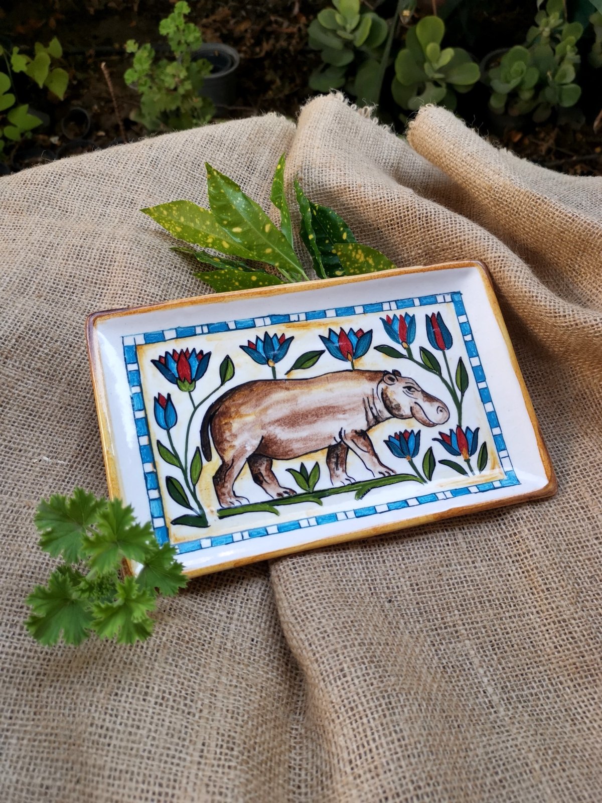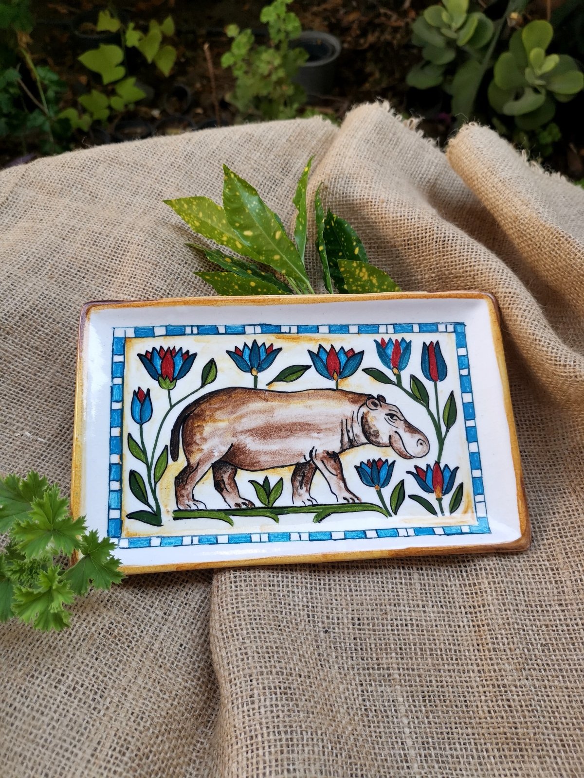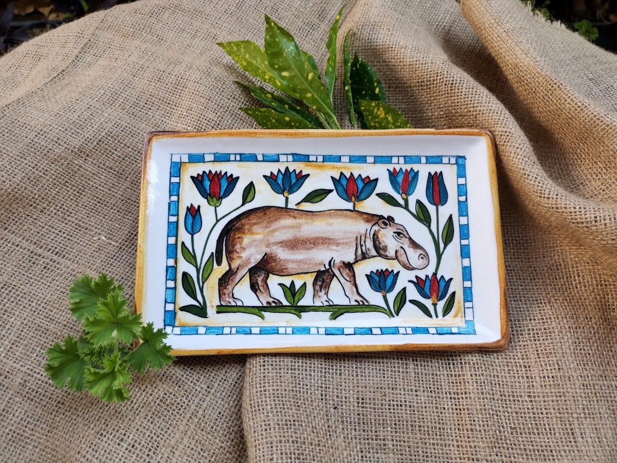 طبق خزفى مستطيل الشكل مقاس 15×25 سم، مرسوم يدويا بزخارف مستوحاه من الفن المصرى القديم لحيوان فرس النهر وزهرة اللوتس، تم صناعته فى أفران خاصة تضمن ثبات الطبقة اللونية، والطبق قابل للاستخدام اليومى فى الطعام ويمكن تنظيفه بالمنظفات دون أى تأثير على لمعان الألوان كما يمكن دخوله للميكرويف