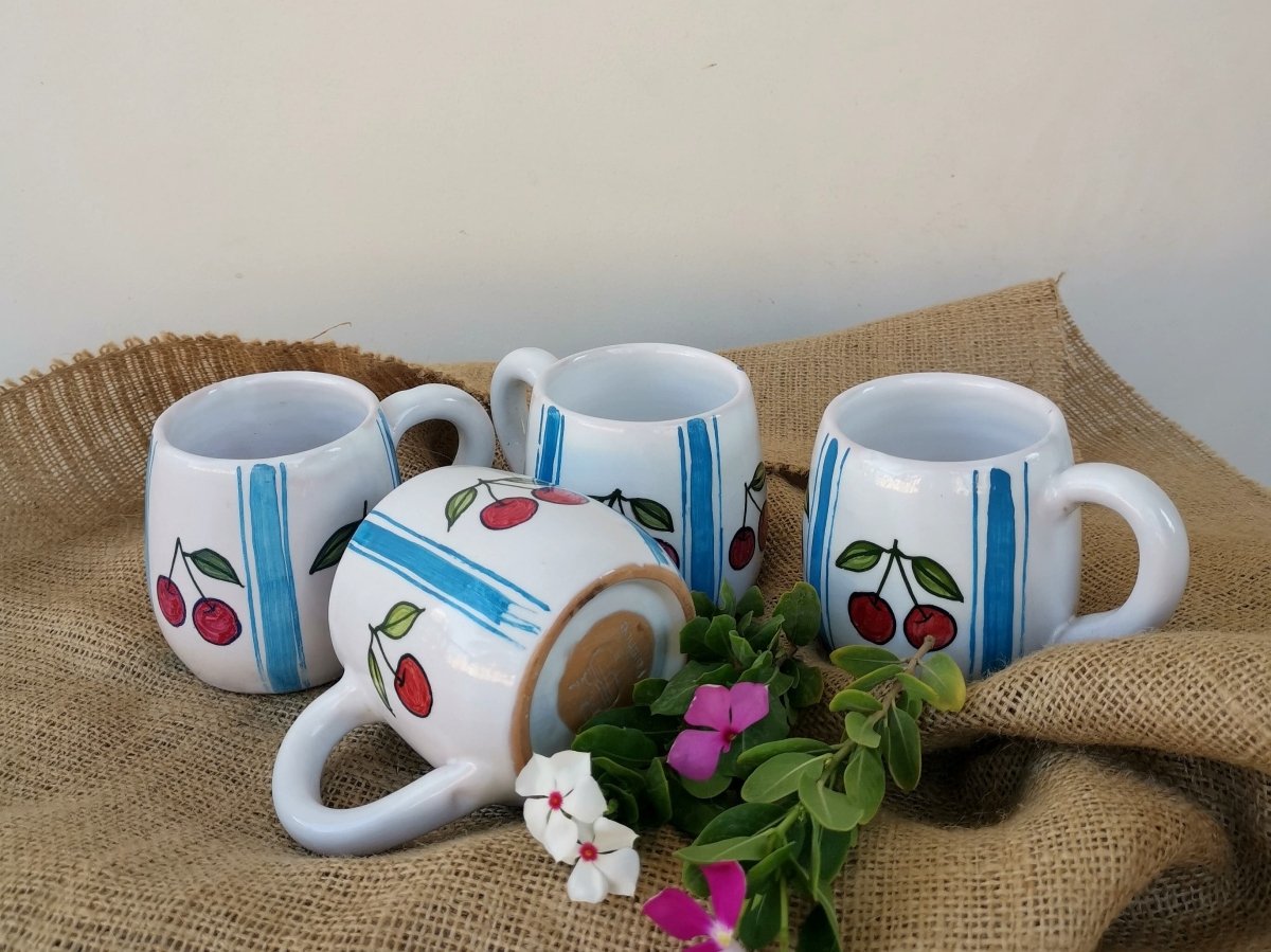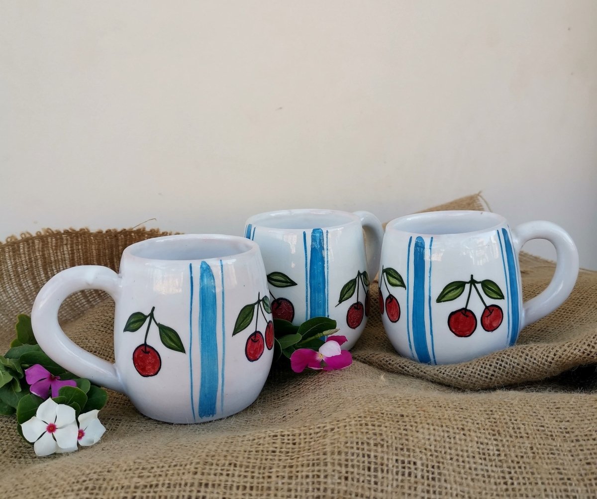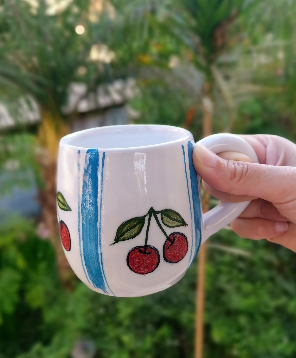 مج خزفى سعة 300 مل تقريبا، مرسوم يدويا بثمار الكريز تم صناعته فى أفران خاصة تضمن ثبات الطبقة اللونية، ويمكن تنظيفه بالمنظفات دون أى تأثير على لمعان الألوان كما يمكن دخوله للميكرويف