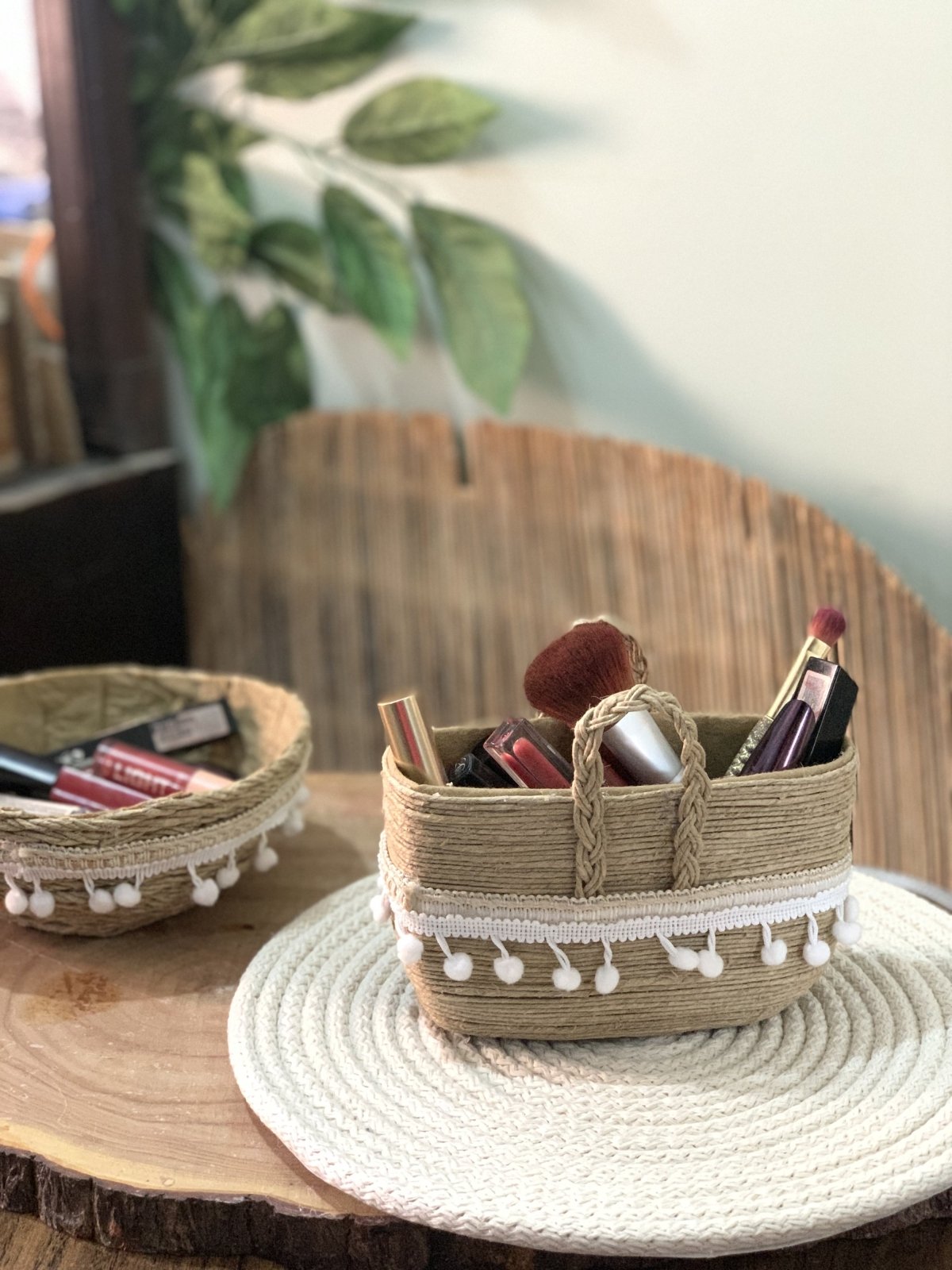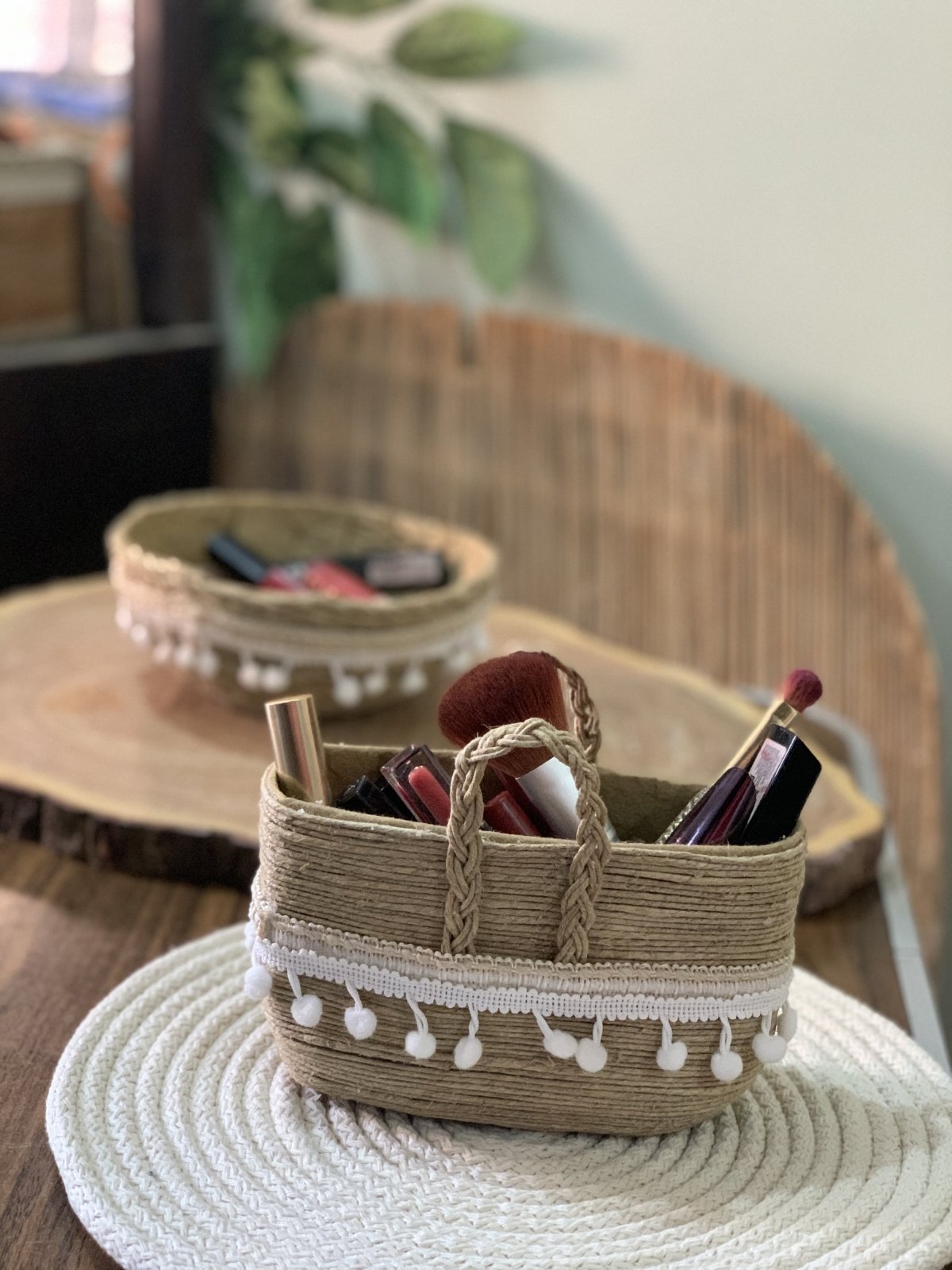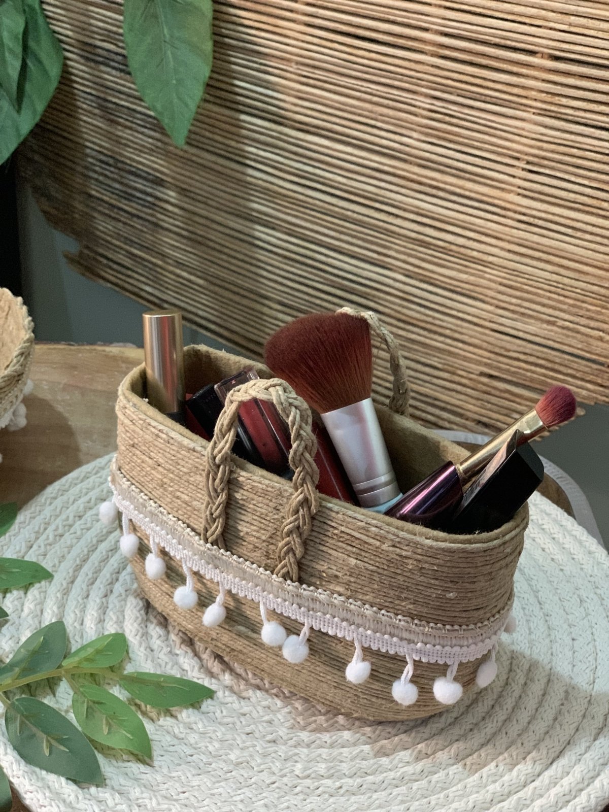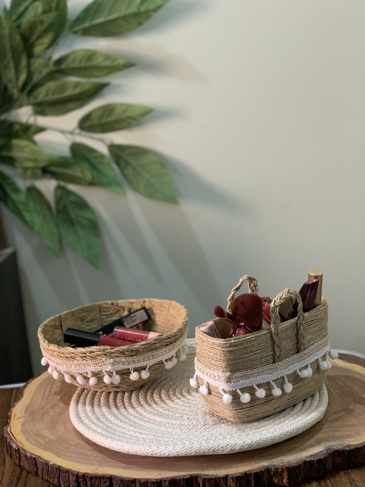 شنطة من الخوص ارتفاعها ٨سم وعرضها ١٨سم طبق من الخوص قطره ١٦سم وارتفاعه ١٠سم