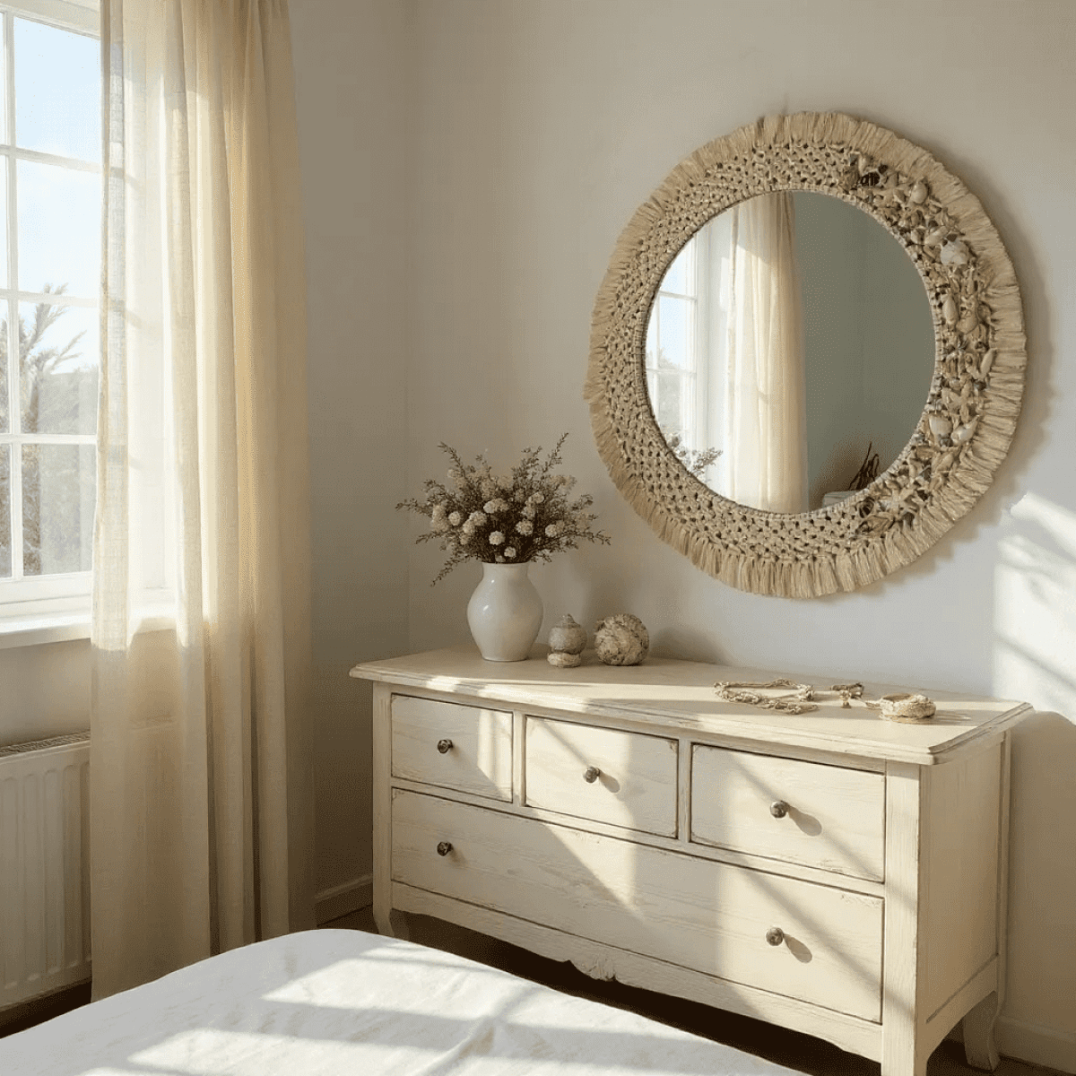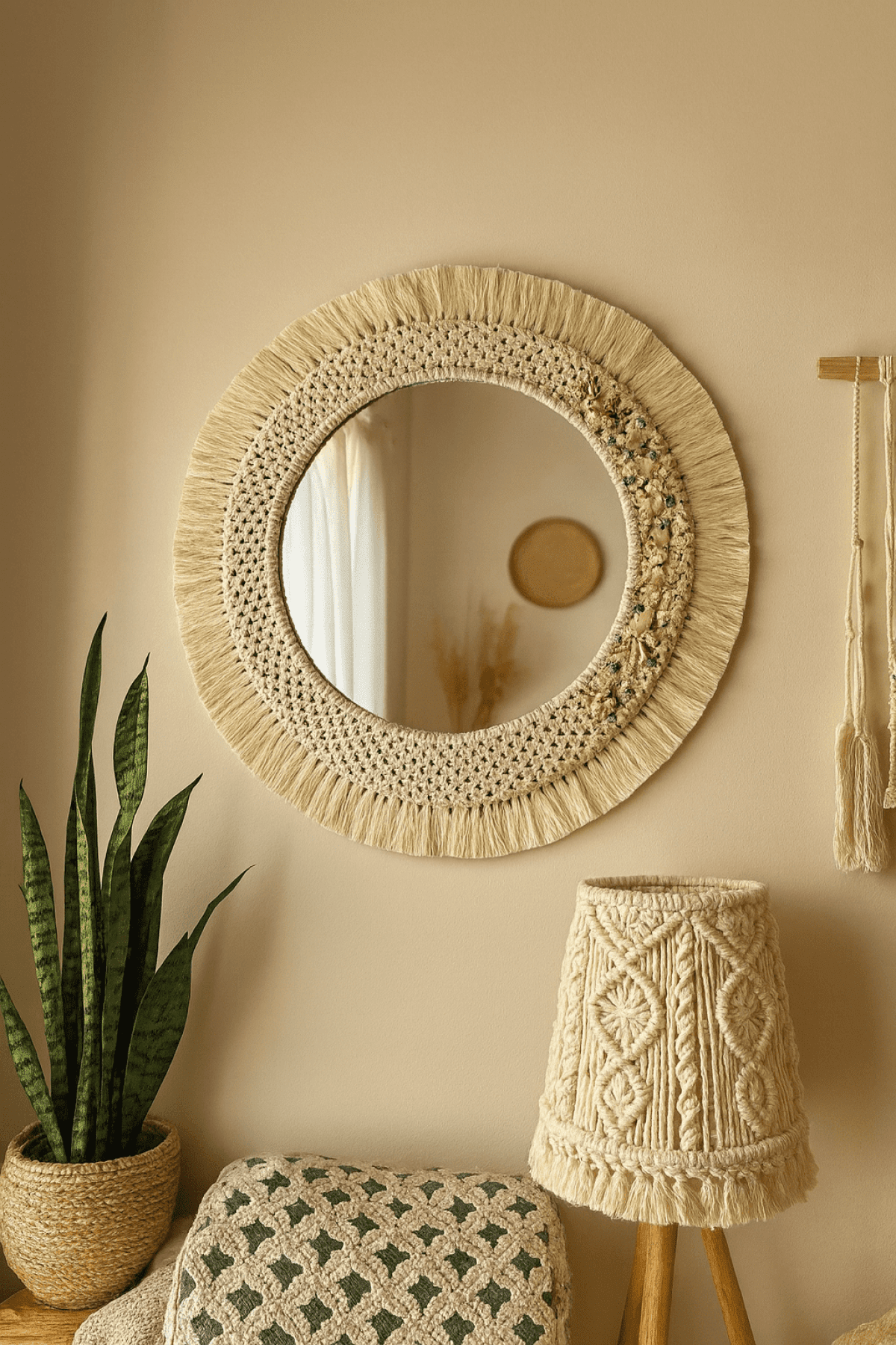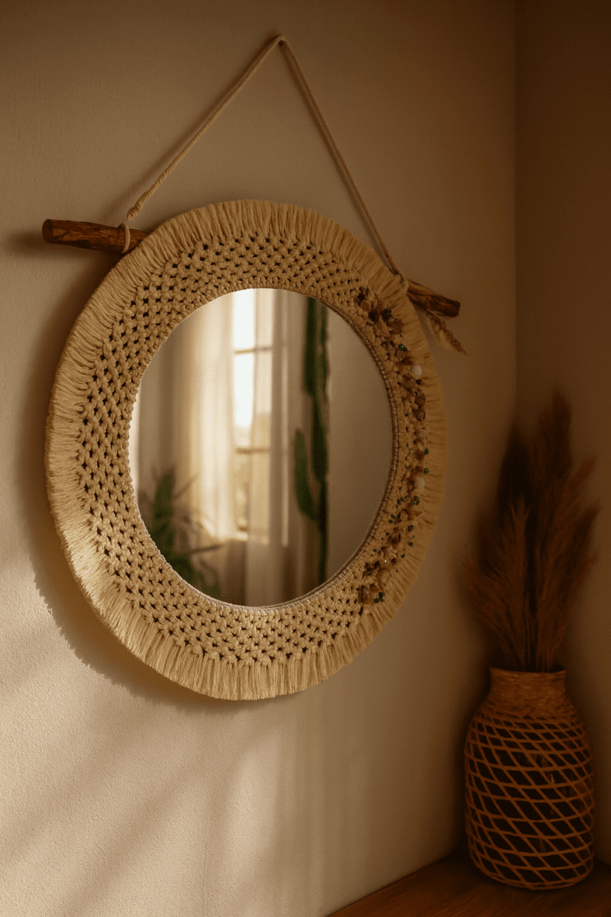 مراية مكرمية – 80 سم مصنوعة يدويًا من خيوط قطن 100% متاح تغيير المقاس والألوان . مدة التنفيذ: من أسبوعين إلى 3 أسابيع.