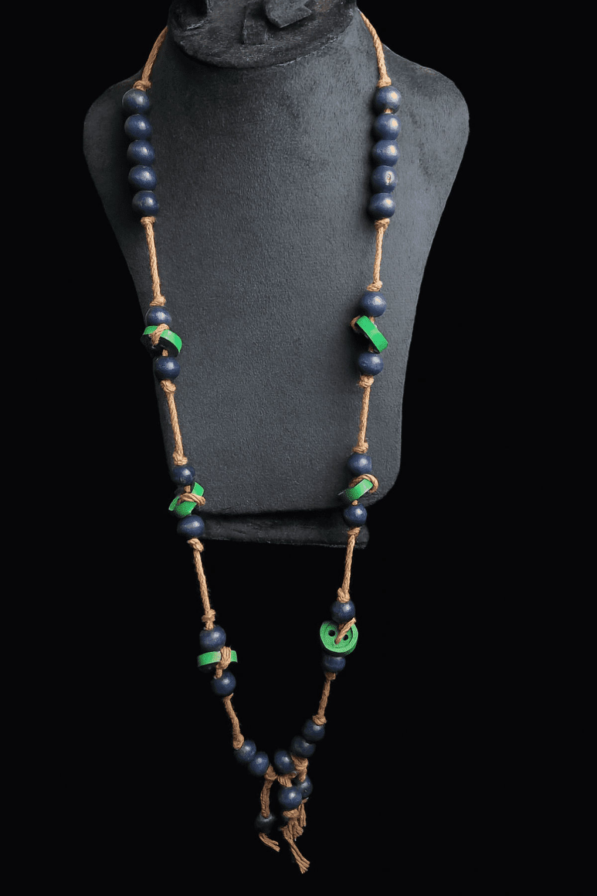 A handcrafted boho-style necklace featuring large navy wooden beads paired with bright green accents, strung on a thick natural cord. Its long design with tassel detail adds a bold and earthy touch, perfect for beach days or casual chic looks.