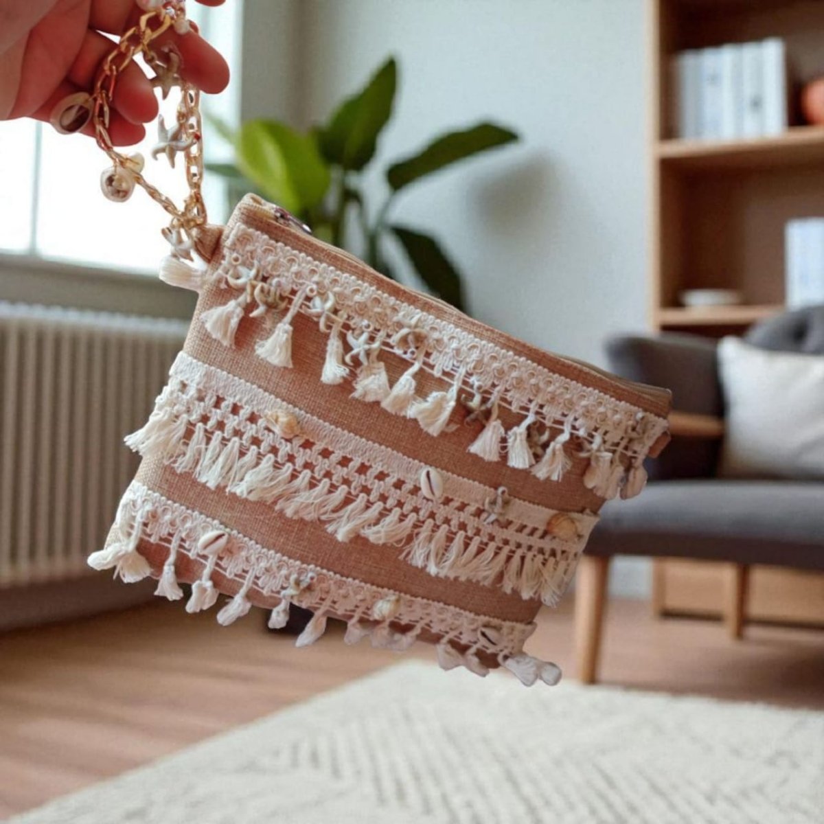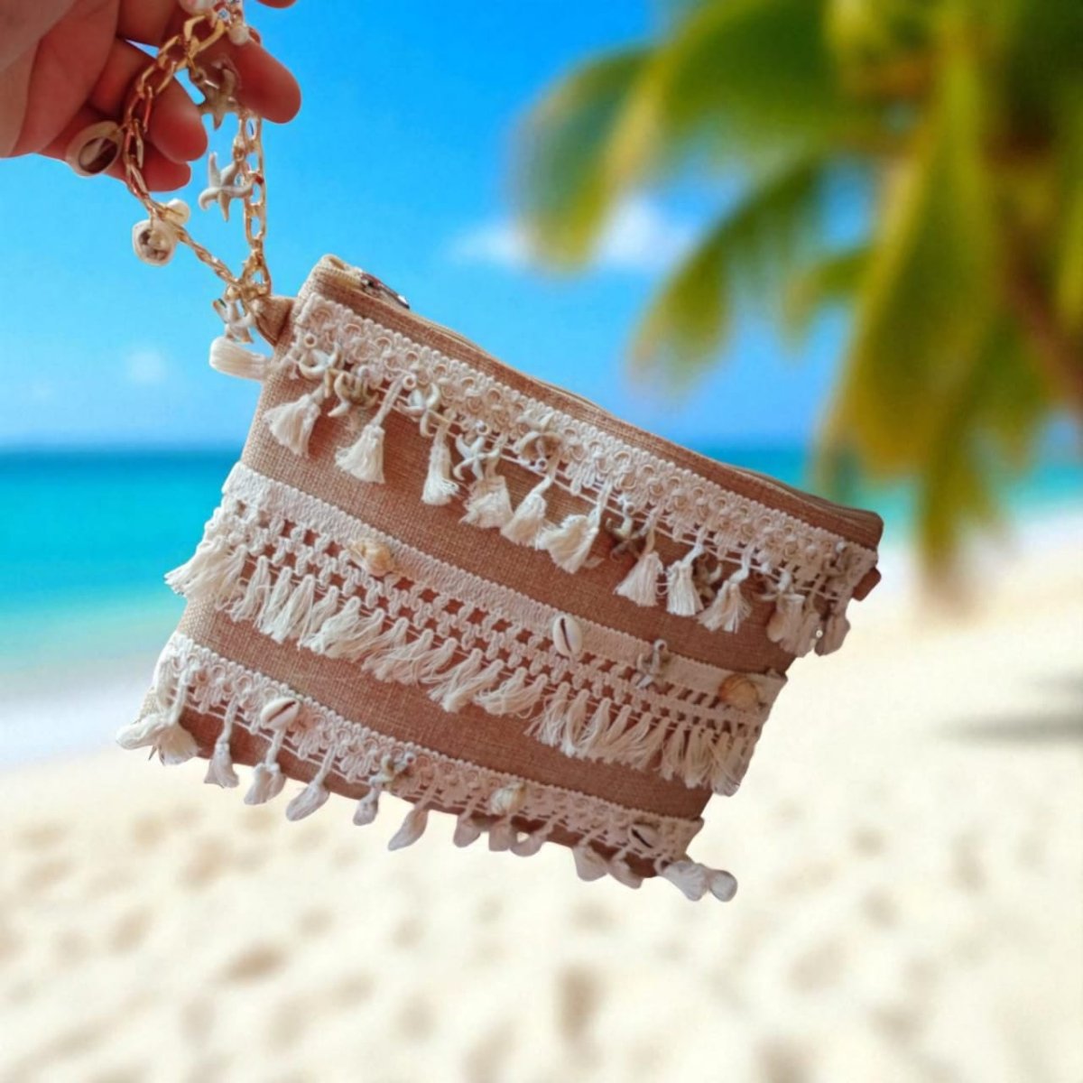 كلاتش من الكتان صنع يدويا مزين من شرائط التزين مزود بصدف طبيعي وننجوم للبحر مقاس ٣٠ في ٢٠