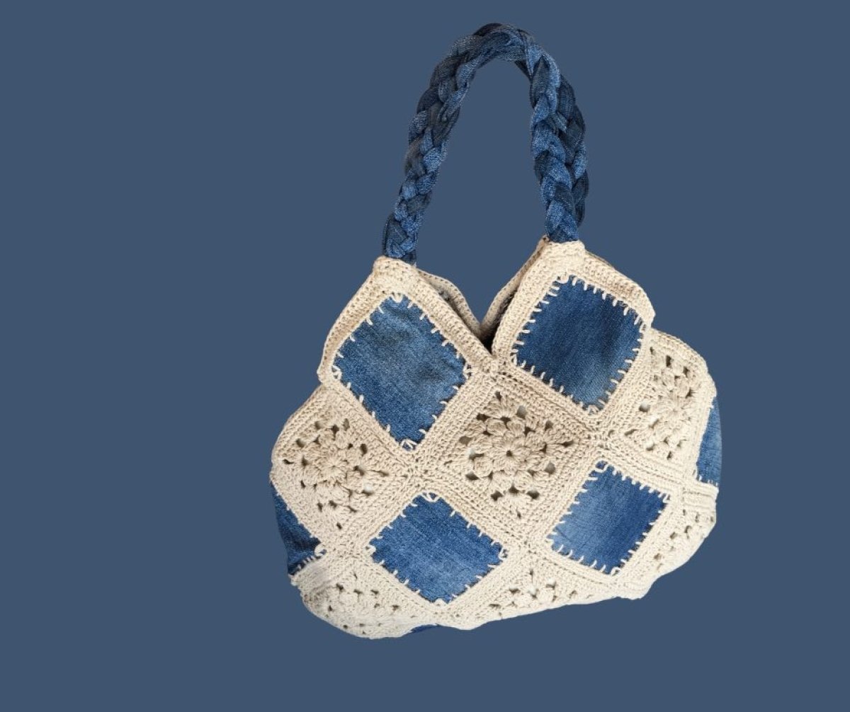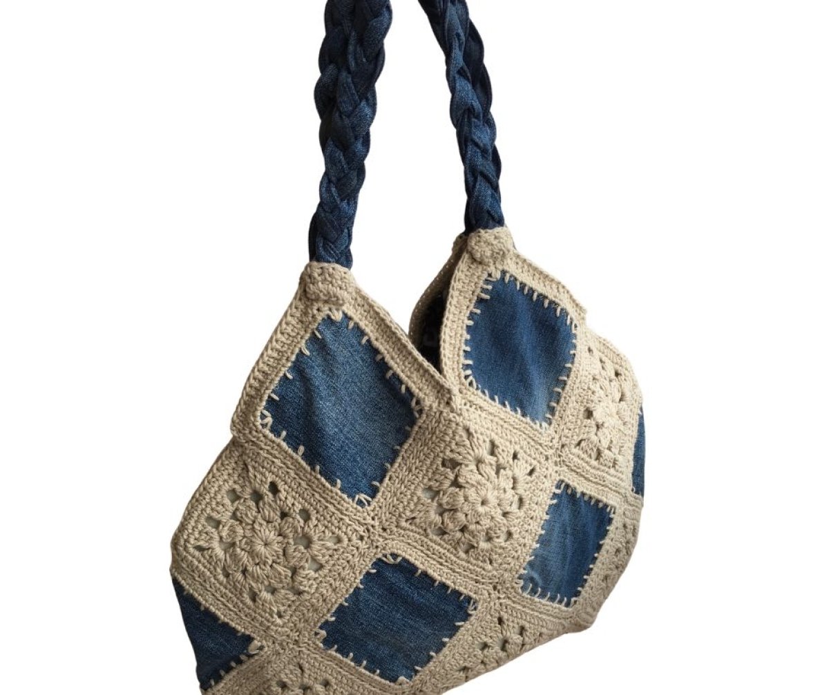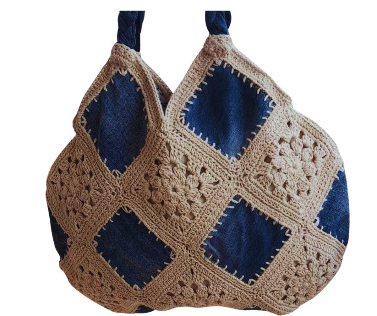 حقيبة كاجوال من الكروشيه ممزوجة برقع الجينز بطانة داخلية مزودة بجيوب وسحاب الأبعاد: 45 × 40 سم
