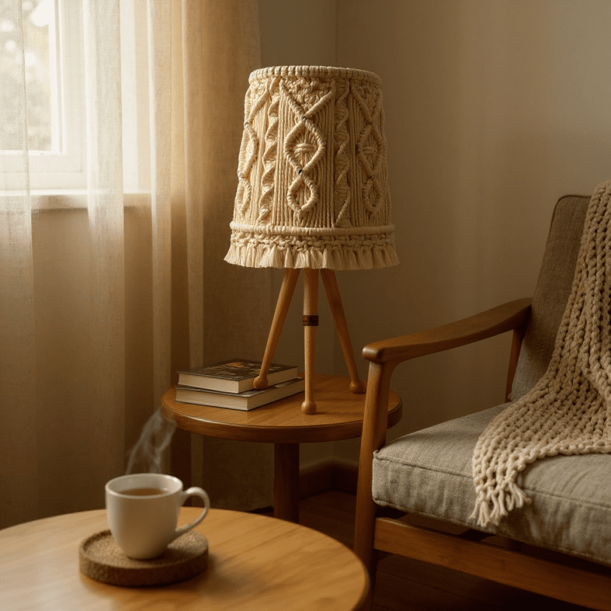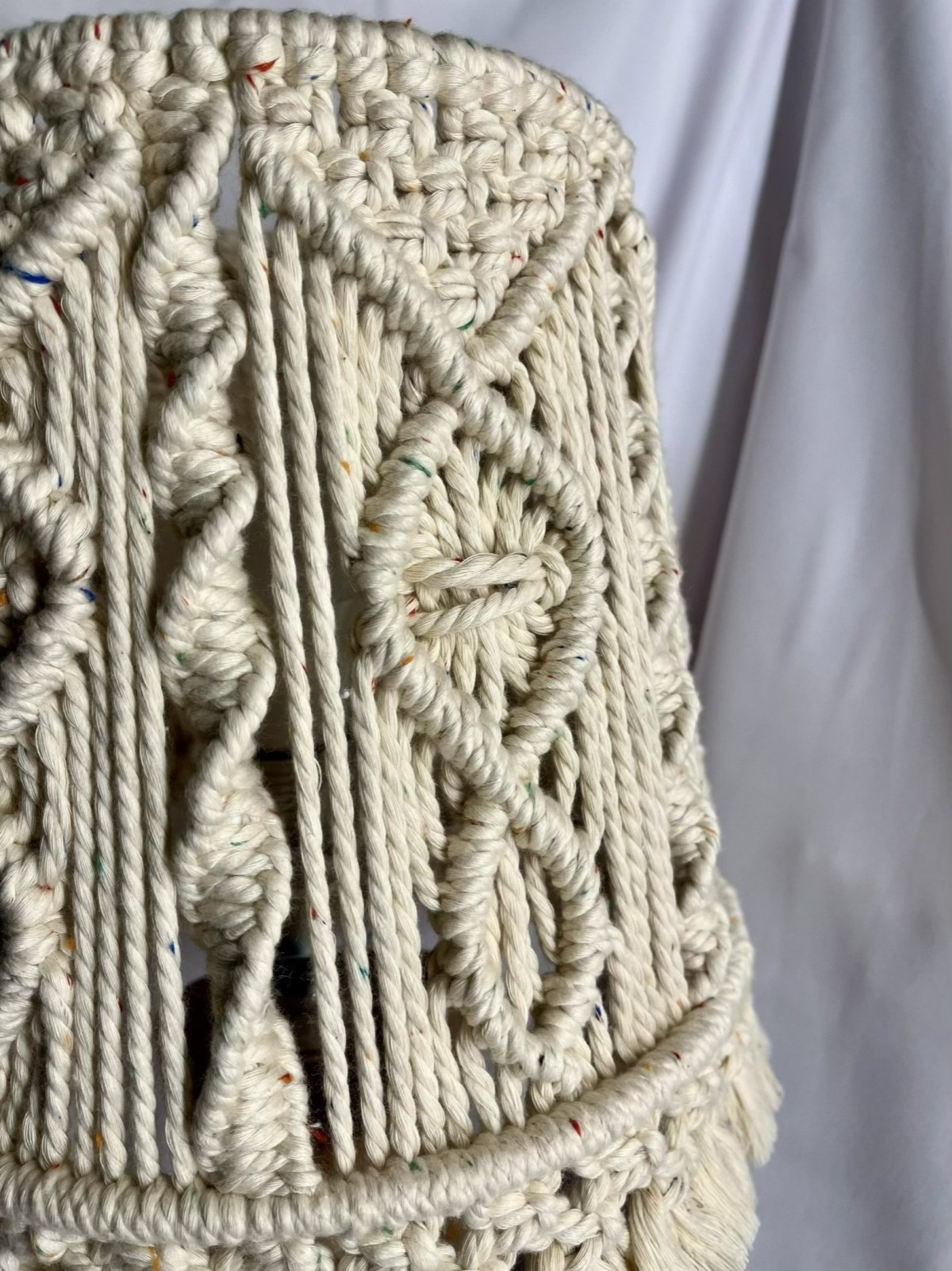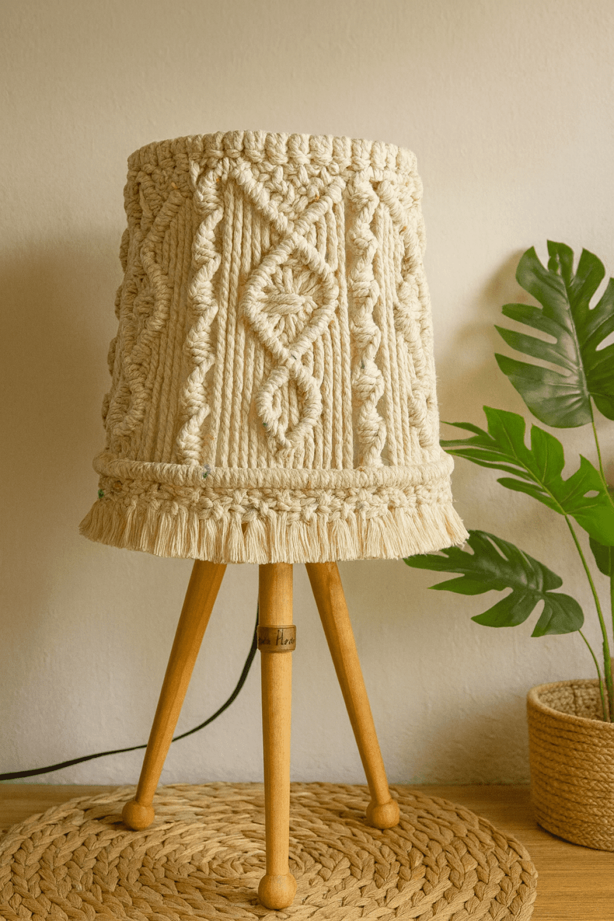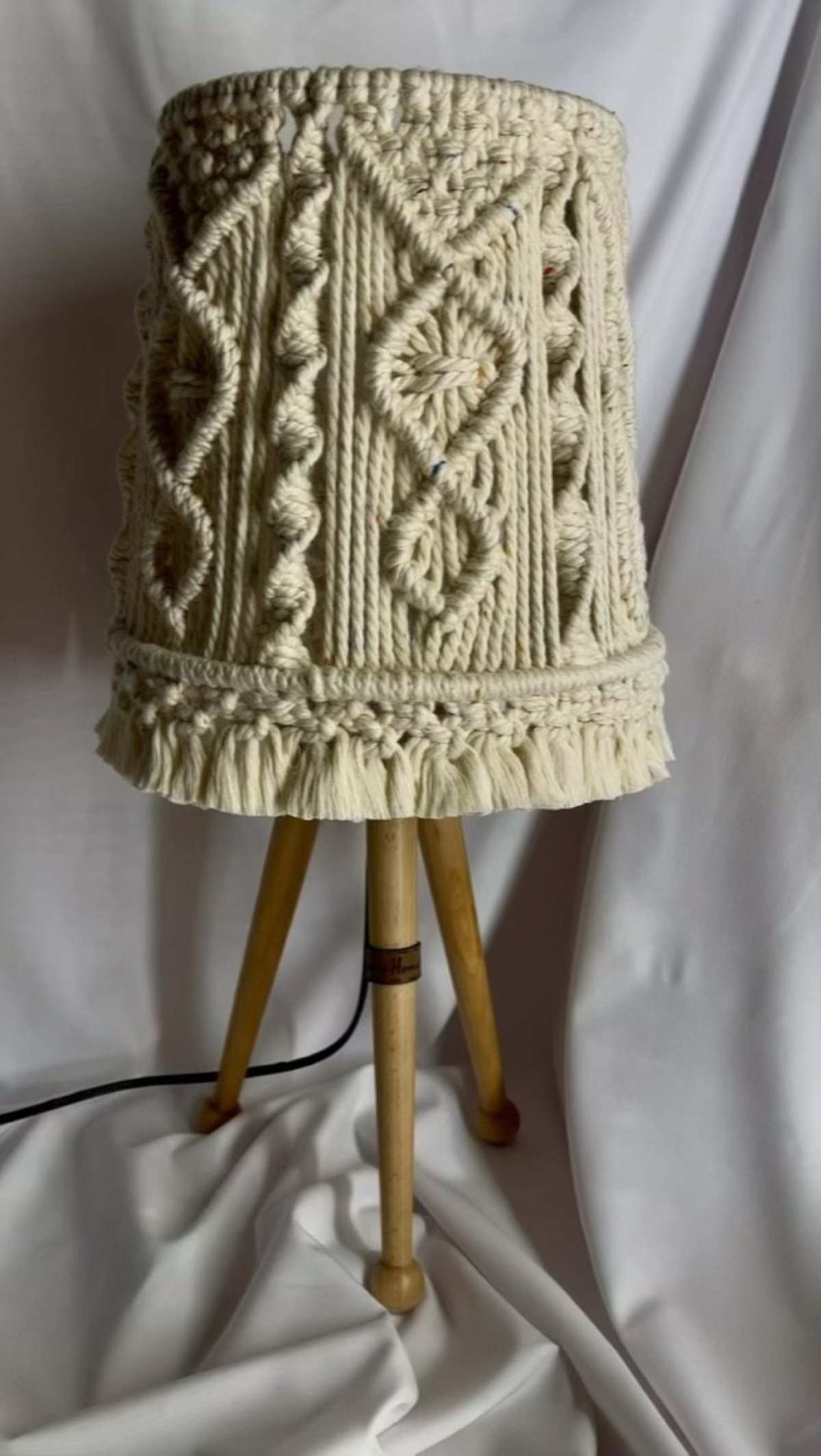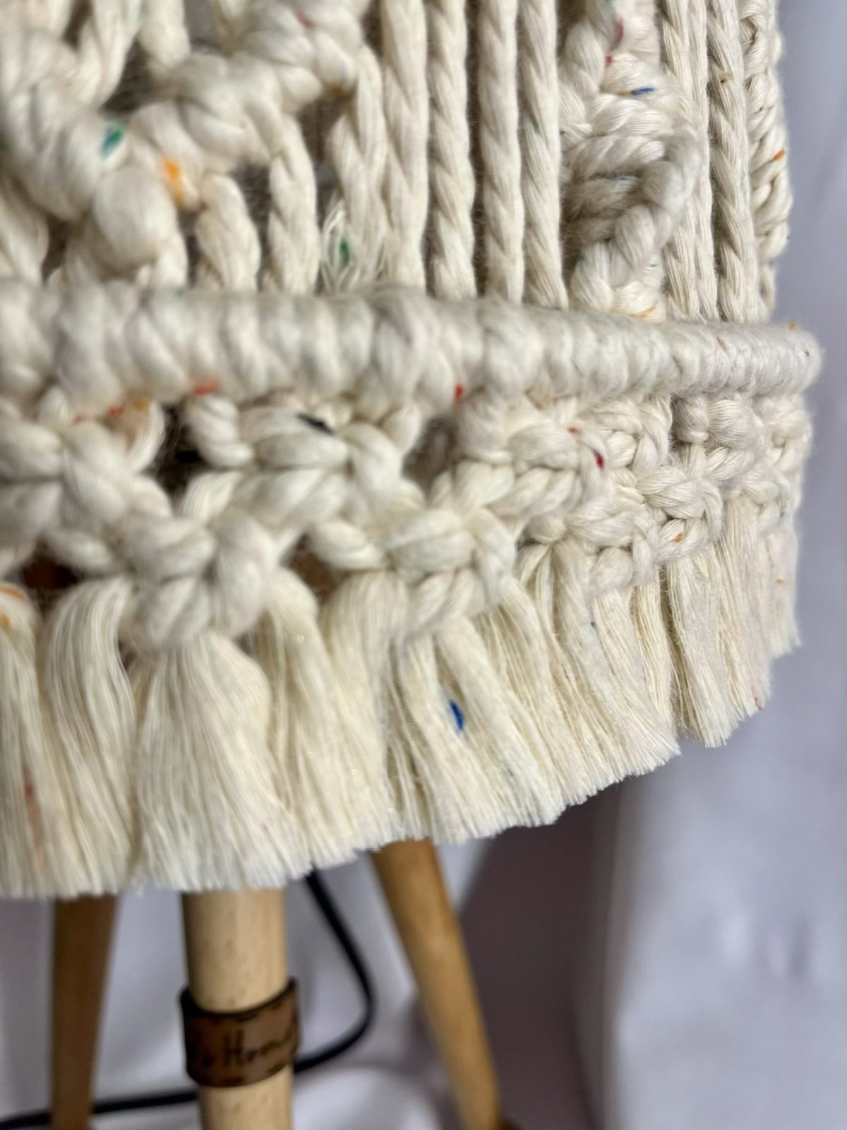 أباجورة مكرمية مصنوعة يدويًا من خيوط قطن 100% مع قاعدة خشبية أنيقة متاحة بجميع الألوان و الاشكال حسب الطلب. وقت التنفيذ: من 10 إلى 15 يوم.