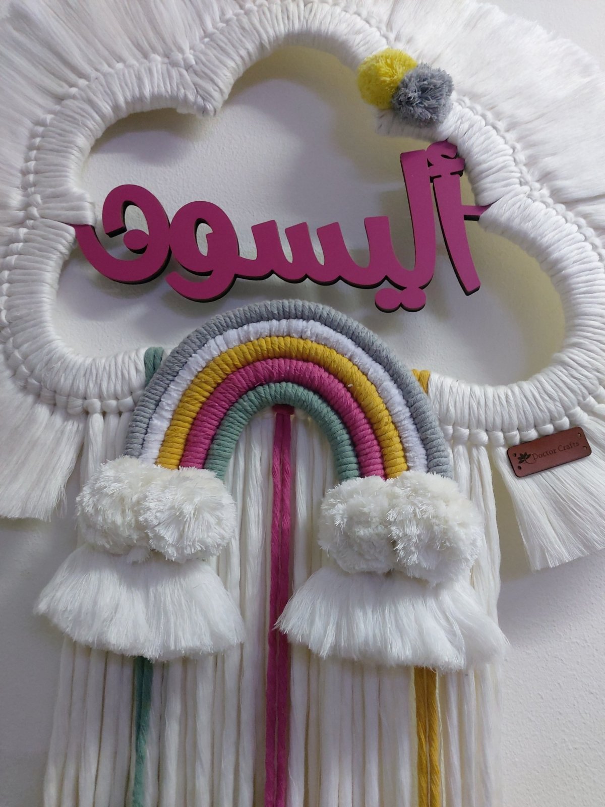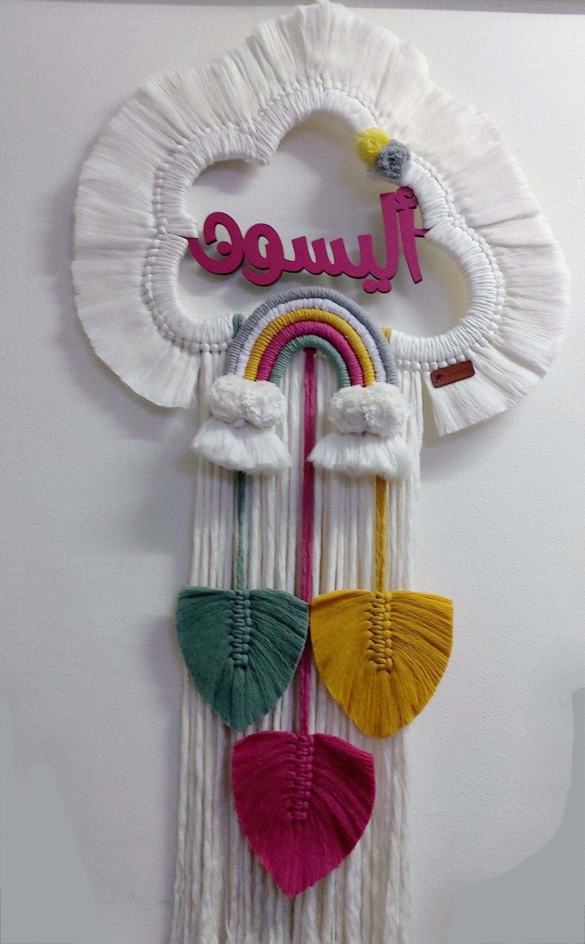 معلقة حائط سحابه مخصصه بالاسم للديكور مصنوعه من خيوط المكرميه القطن الناعم المقاس مقاس القطعه الخشبيه ٤٠ سم العرض الكلى ٥٠ سم الطول الكلى ١٣٠ سم يمكن تغيير الاسم والمقاس والالوان حسب الطلب