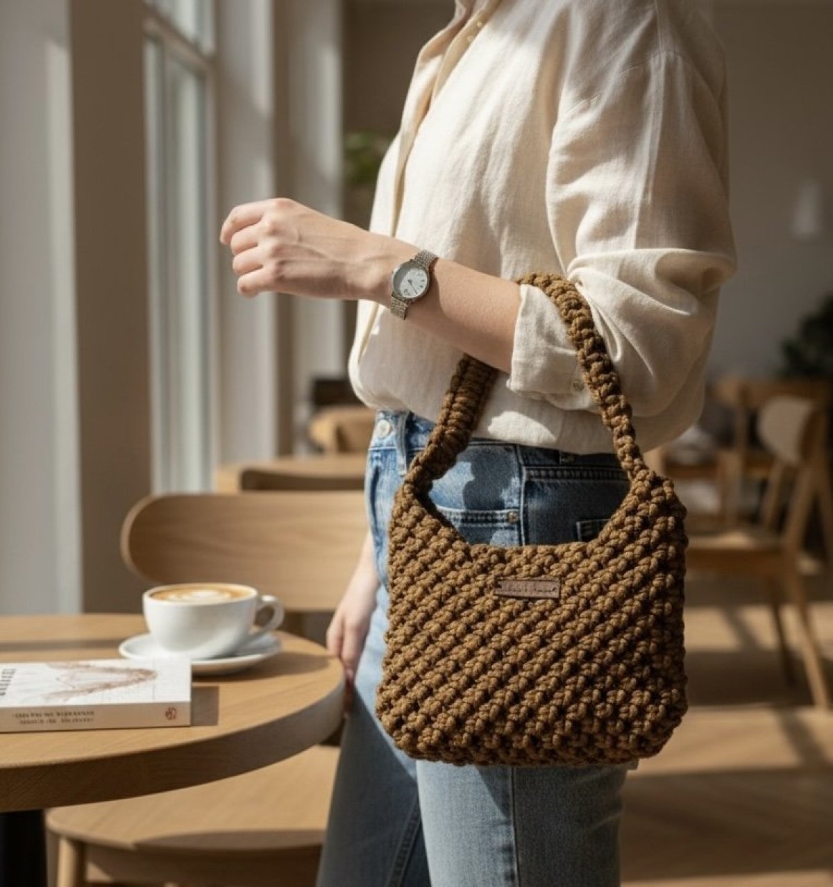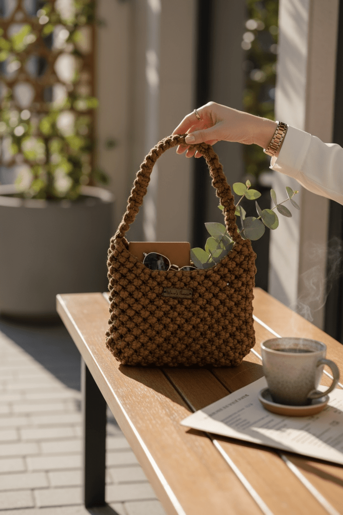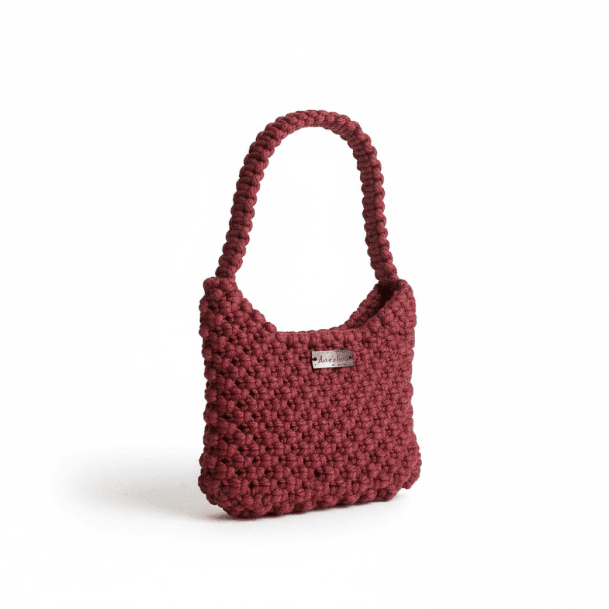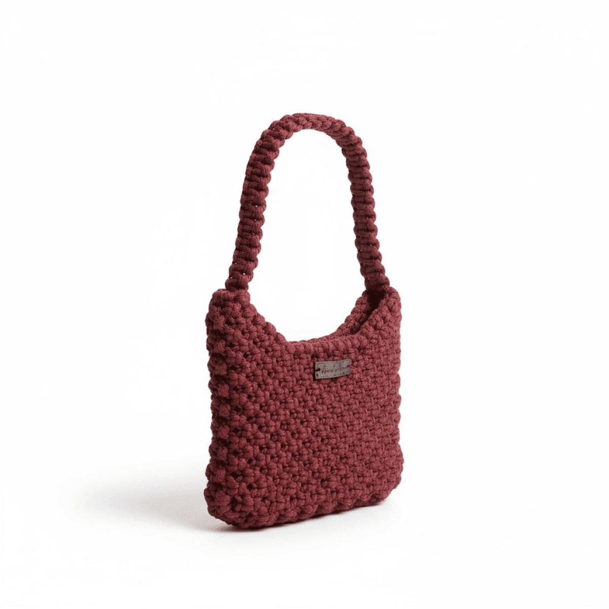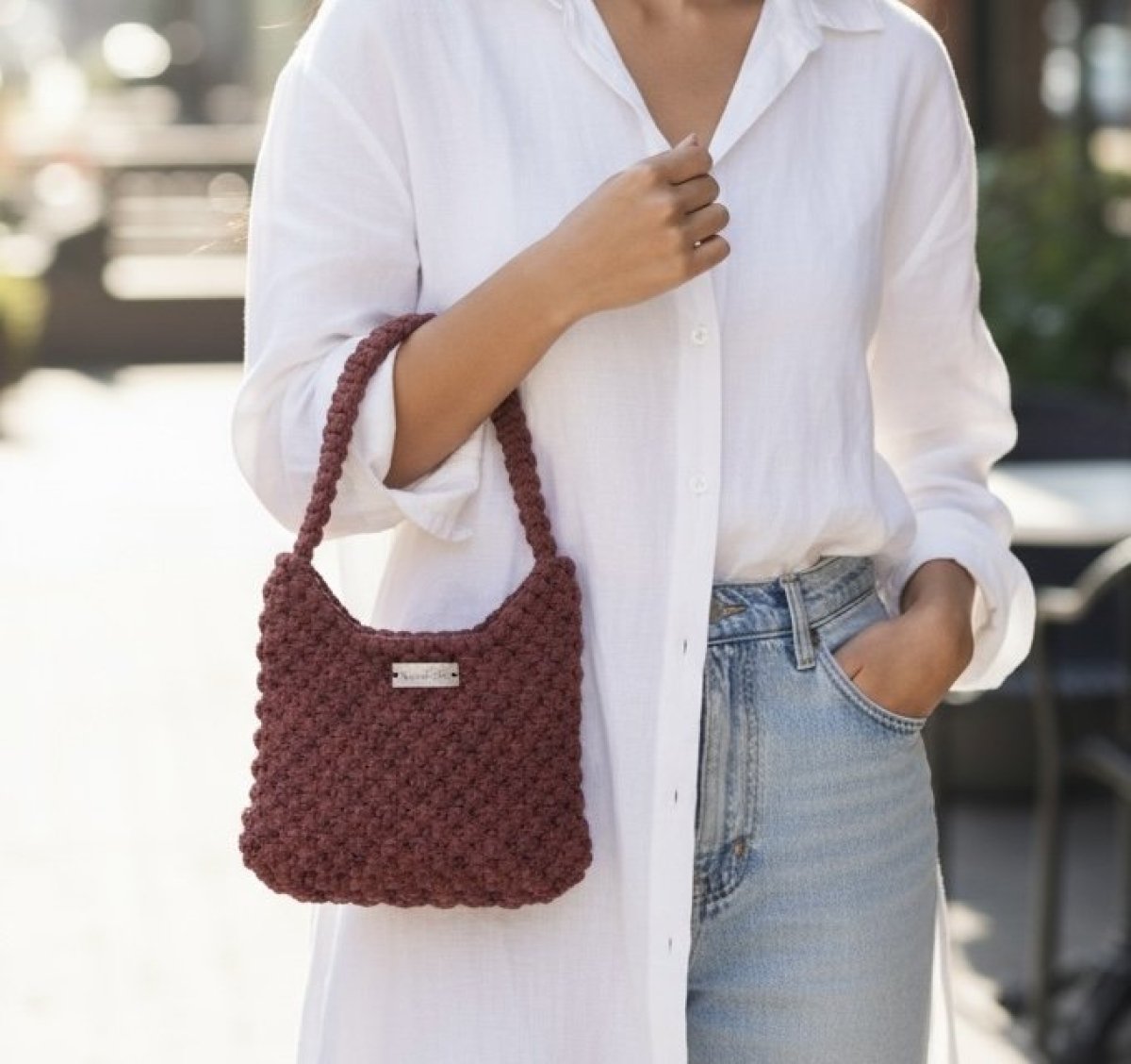 شنطة مكرمية – طول: 19 سم، عرض: 22 سم، مصنوعة يدويًا من خيوط قطن 100%، متاحة بجميع الألوان، وقت التنفيذ: من 10 إلى 15 يوم.