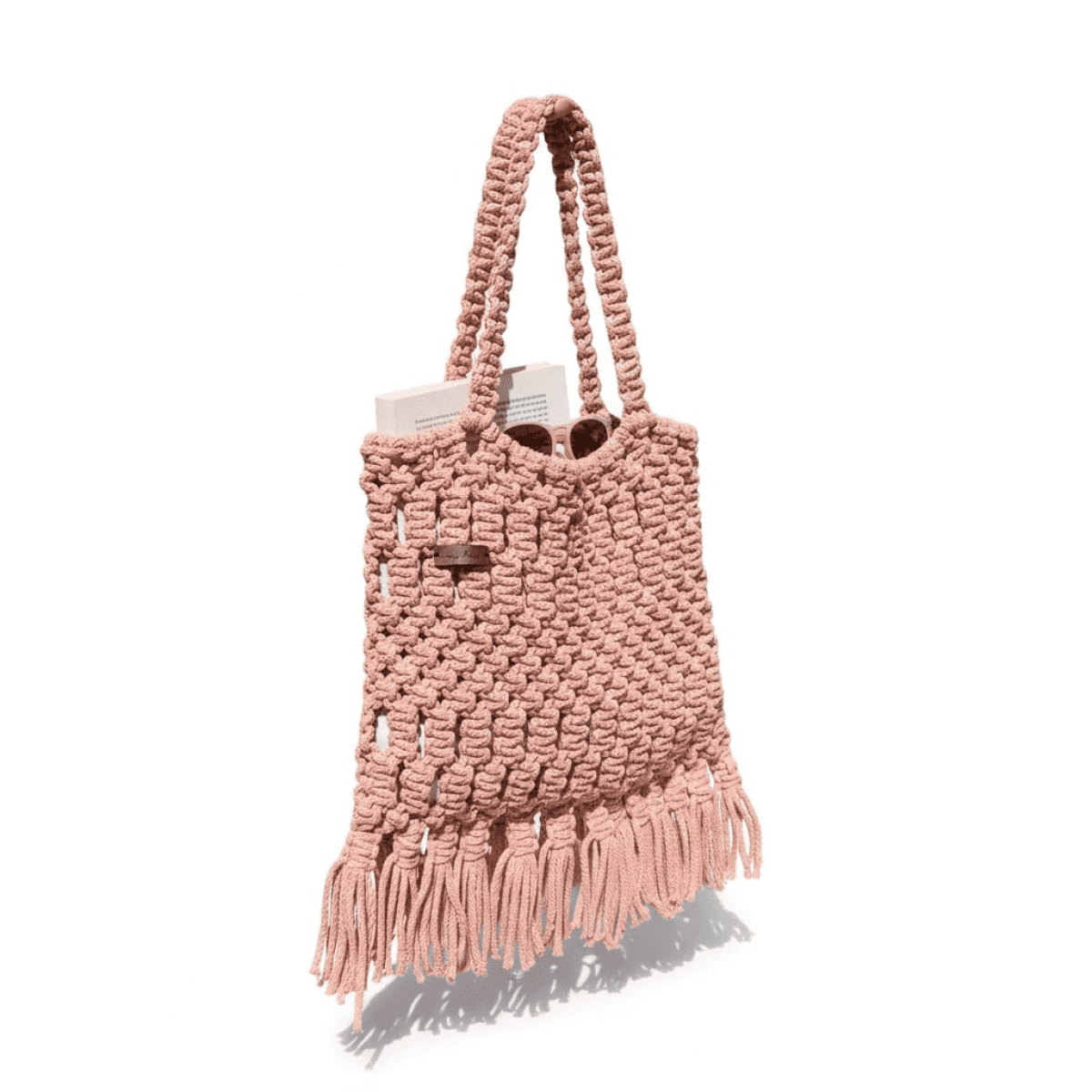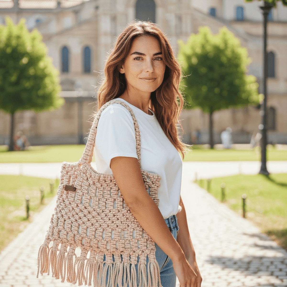 شنطة مكرمية, الطول: 29 سم، العرض: 31 سم، خيوط قطن 100%، متاحة بجميع الألوان. وقت التنفيذ: من 10 إلى 15 يوم.