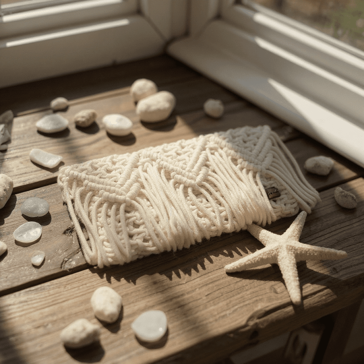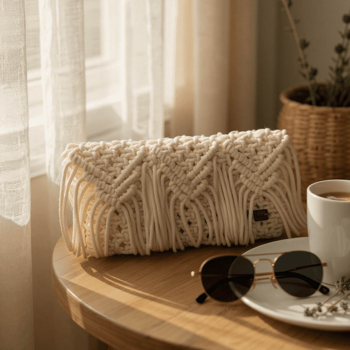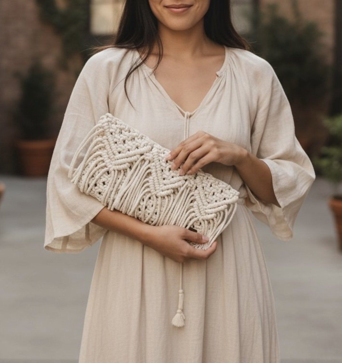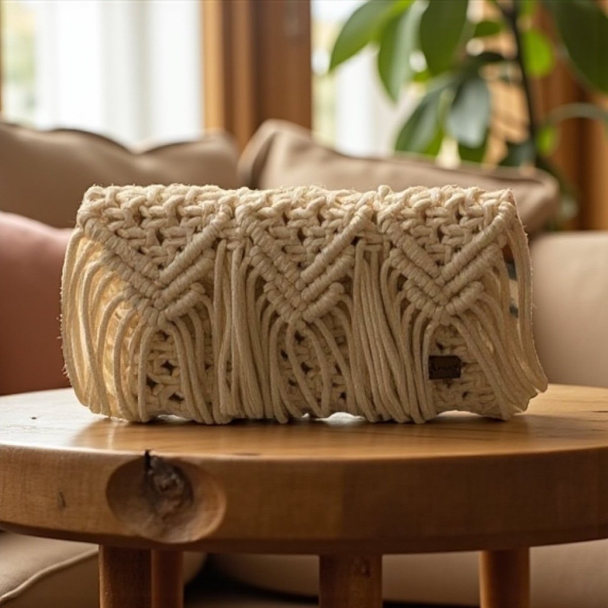 شنطة مكرمية الطول: 15 سم، العرض: 30 سم، خيوط قطن 100%، متاحة بجميع الألوان، وقت التنفيذ: من 10 إلى 15 يوم.