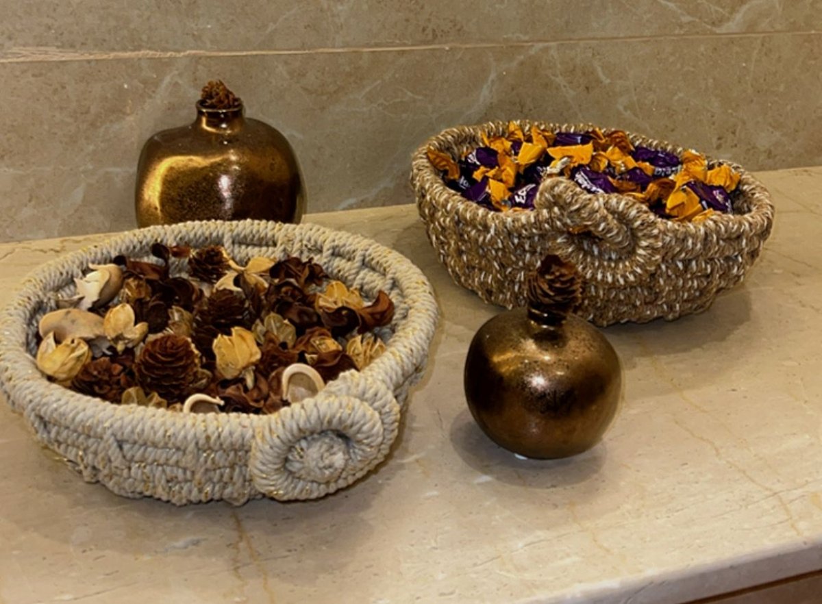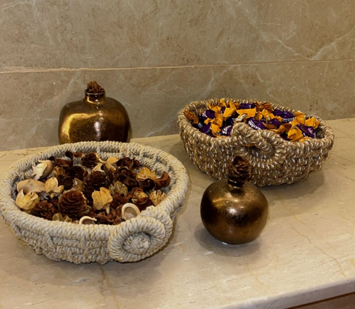 سلال (أو أطباق) يدوية بخامة طبيعية (مكرمية/خيش/خيوط سميكة) قطر ٢٥سم تصلح للديكور أو التقديم. بونبونيره متاح تعديل المقاس والالوان حسب رغبه العميل