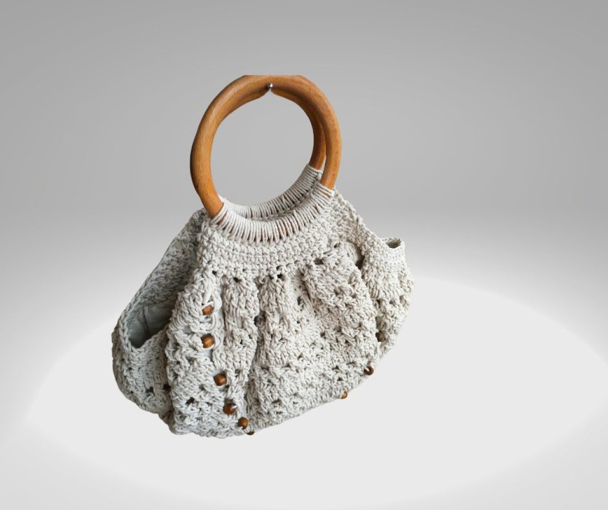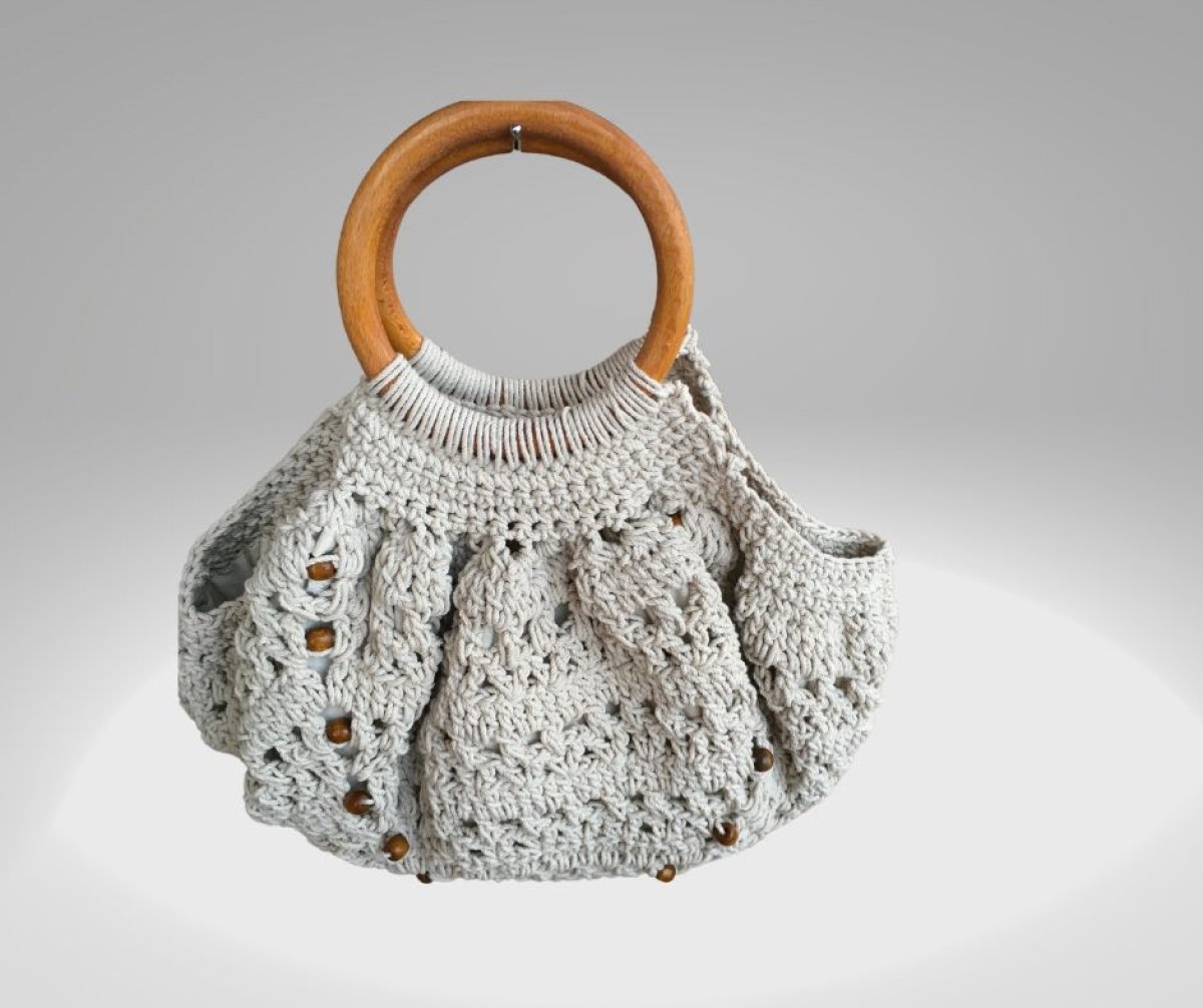حقيبة كروشيه مصنوعة يدوياً من خيوط المكرامي الأبيض ومزينة بالخرز الخشبي البني. مقابض خشبية دائرية، بطانة داخلية مزودة بجيوب وسحاب. الأبعاد: 32 × 45 سم