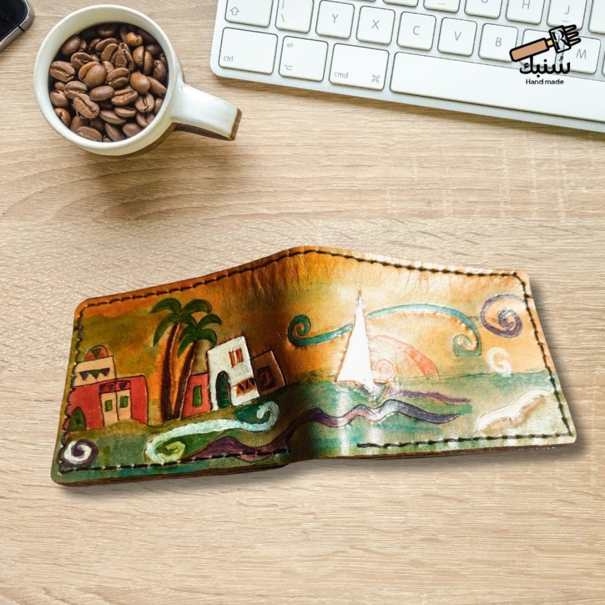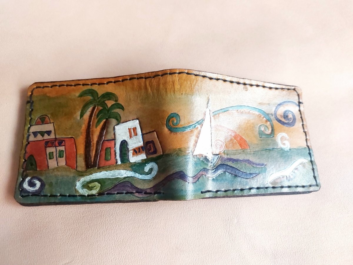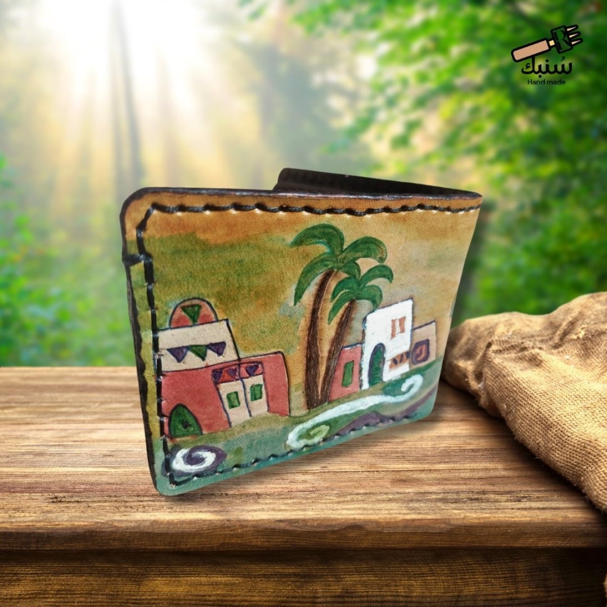 محفظه جلد طبيعي برسم مصرى لبيوت النوبه الجميله مصنوعه من اجود انواع الجلود المصريه رسم وتلوين يدوى بالكامل خياطه وتخريم يدوى متاح تغيير الالوان والرسم طبقا للاحتياج