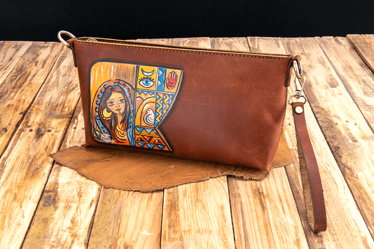 Pull-up leather clutch Hand drawn from Egyptian folklore Copper zipper Copper logo Dimensions 30*16*5 Color havan