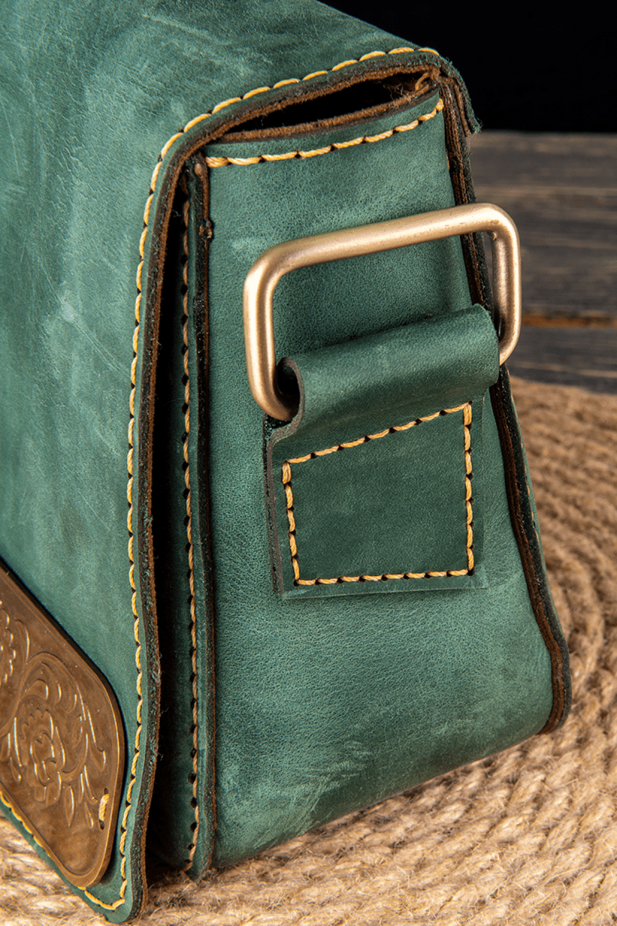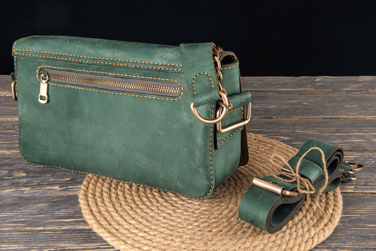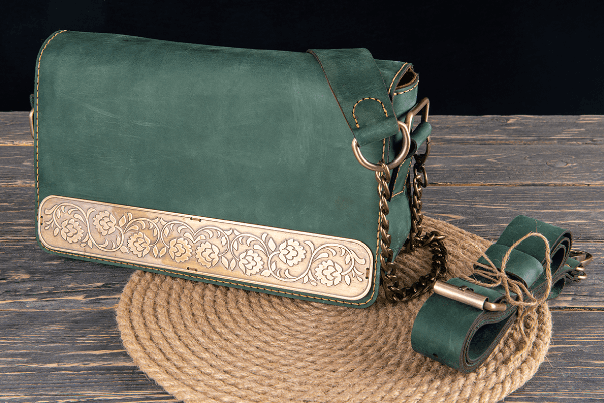 Islamic crossbody bag Pull-up cowhide leather Fabric lined Copper ornament, Islamic decoration Dimensions: 25*18*7 Color: green Open pocket on the inside Front zipper pocket