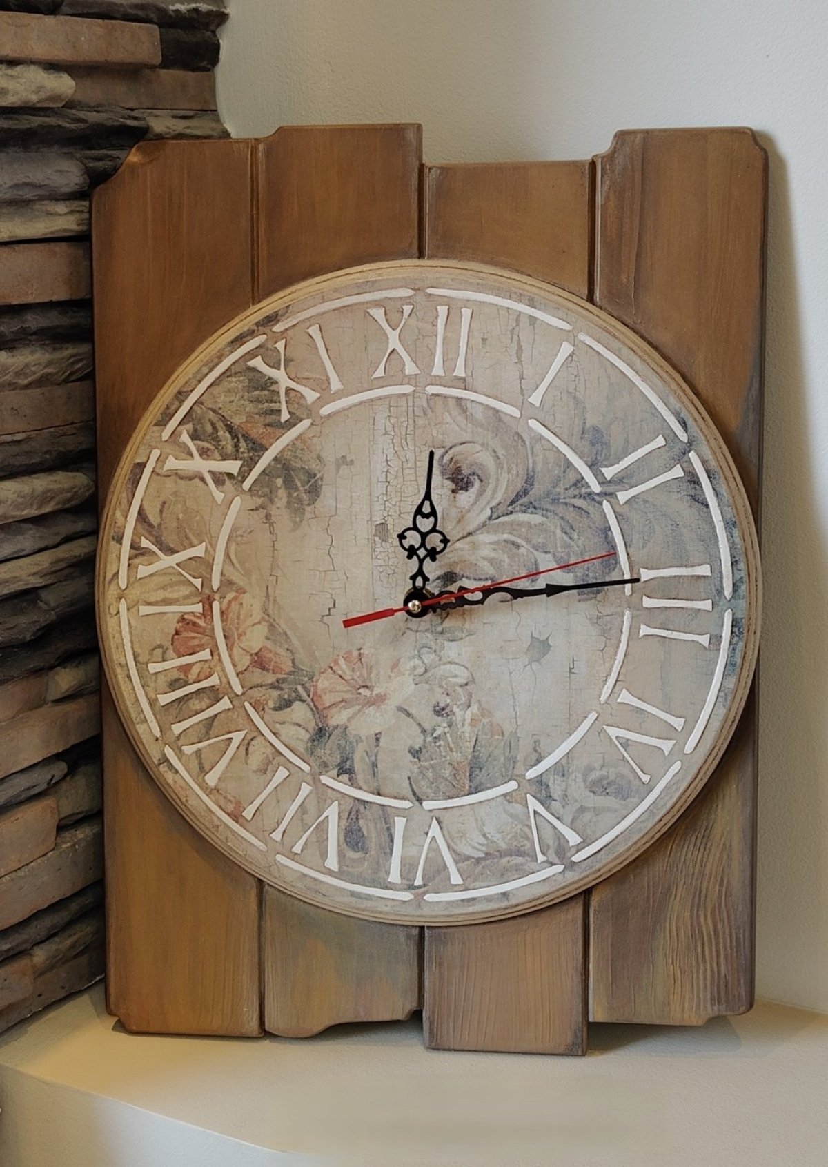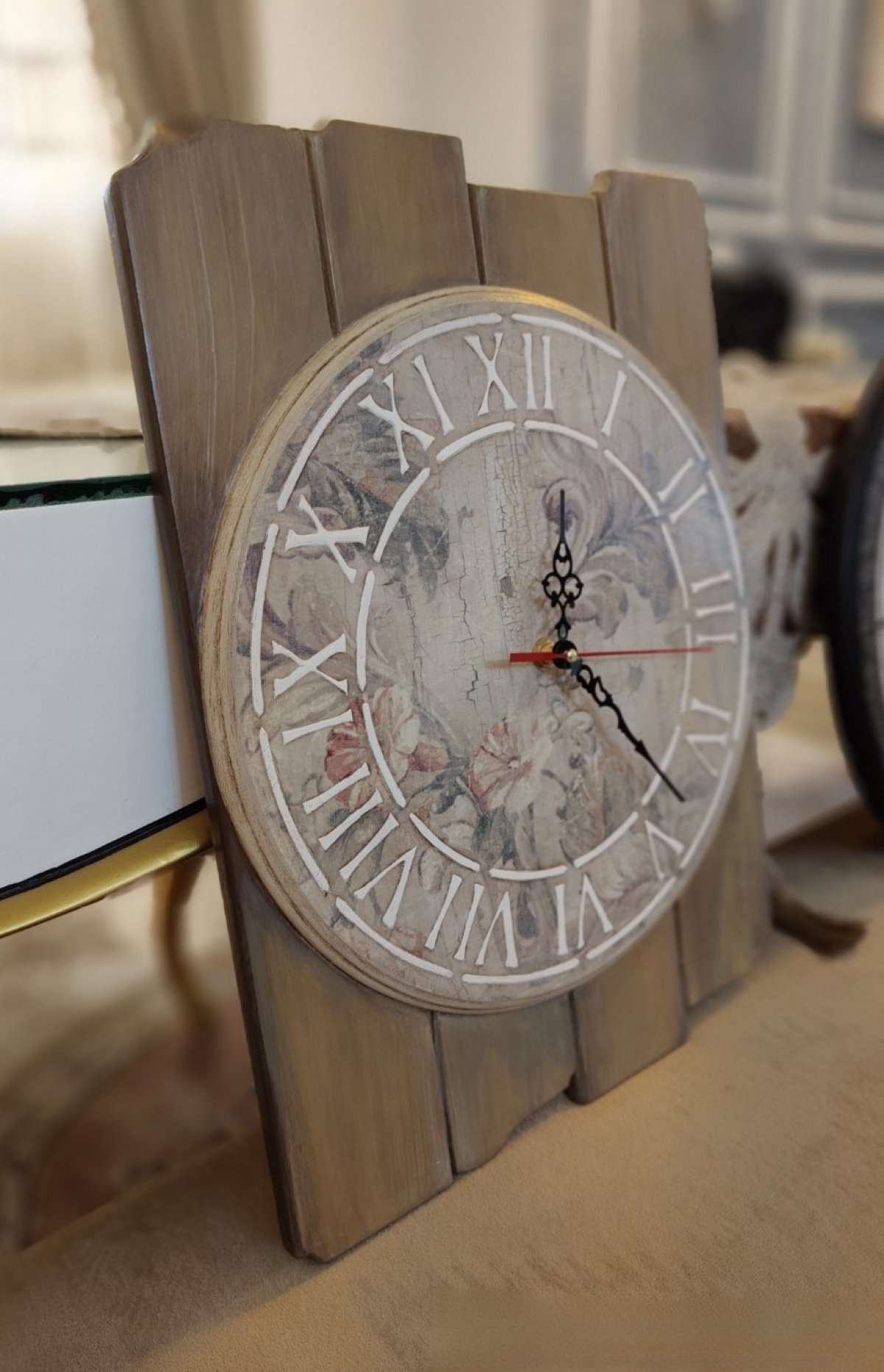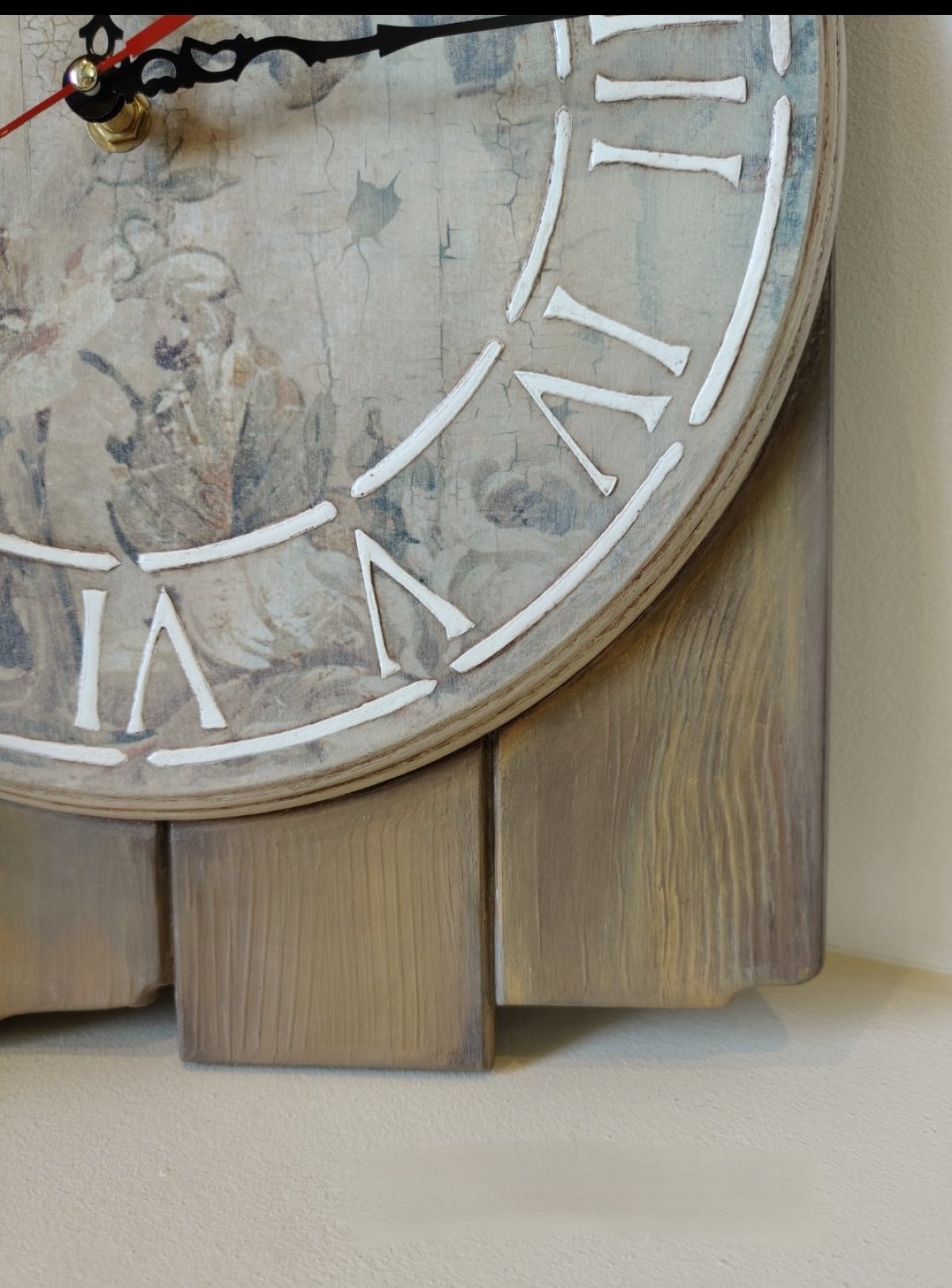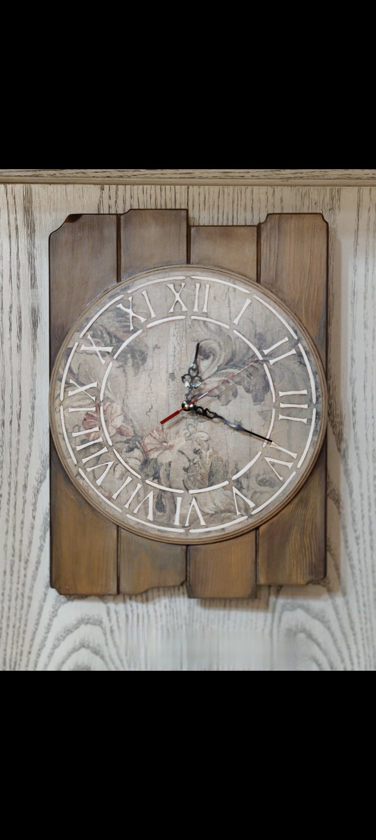 ساعة هاند ميد بتصميم كلاسيكي مُعتق ،يظهر جمالها في تفاصيل الخشب والخلفية المدمجة بألوان هادئة ملائمة معها. طول الساعة 41cm عرض الساعة 20cm جميع الخامات المستخدمه خامات عالية الجودة