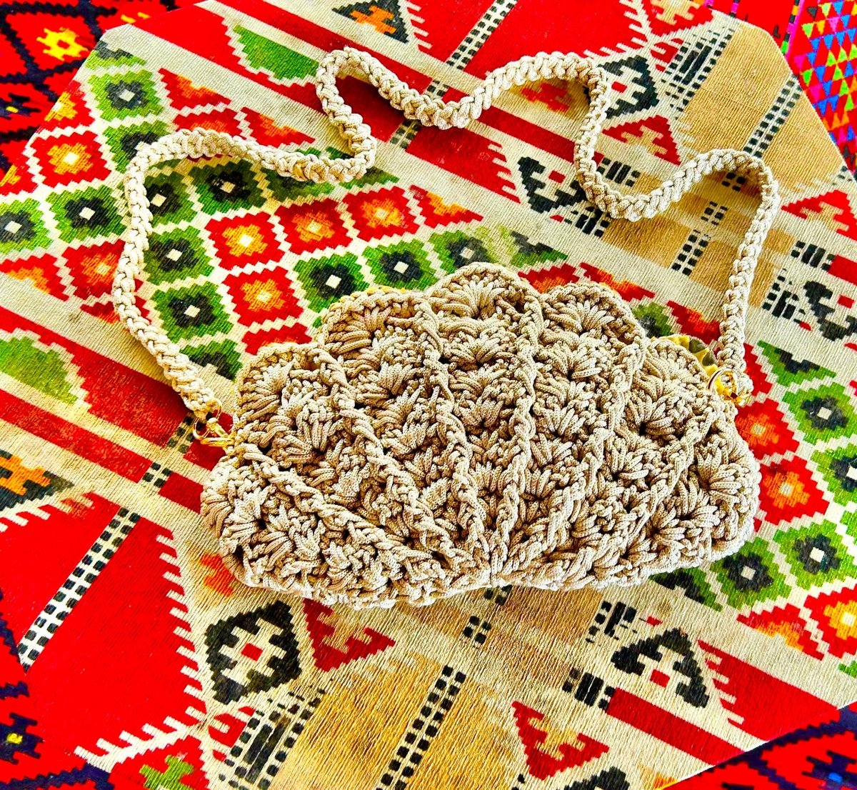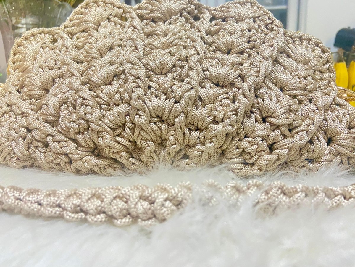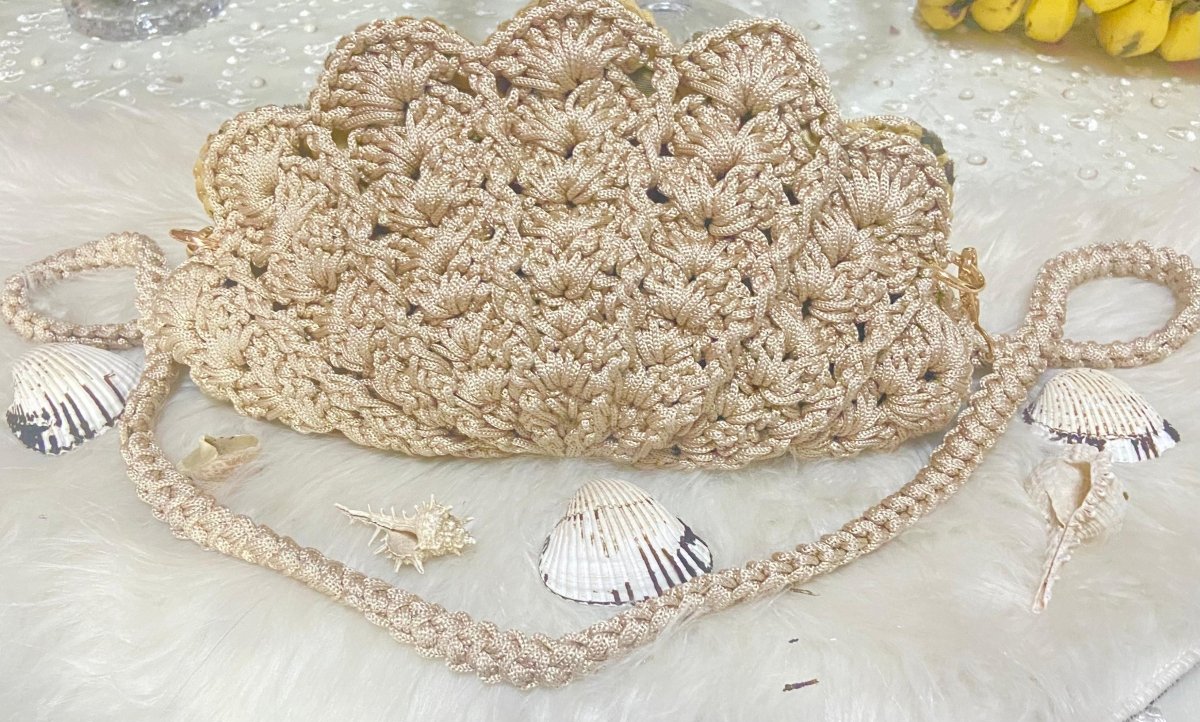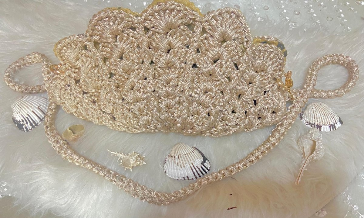 شنطة كروشيه شكل الصدفه بشكل تحفه مناسبه للسفر واجواء الصيف مطبنه بالكامل من الداخل وسوسته وحزام سهل الفك