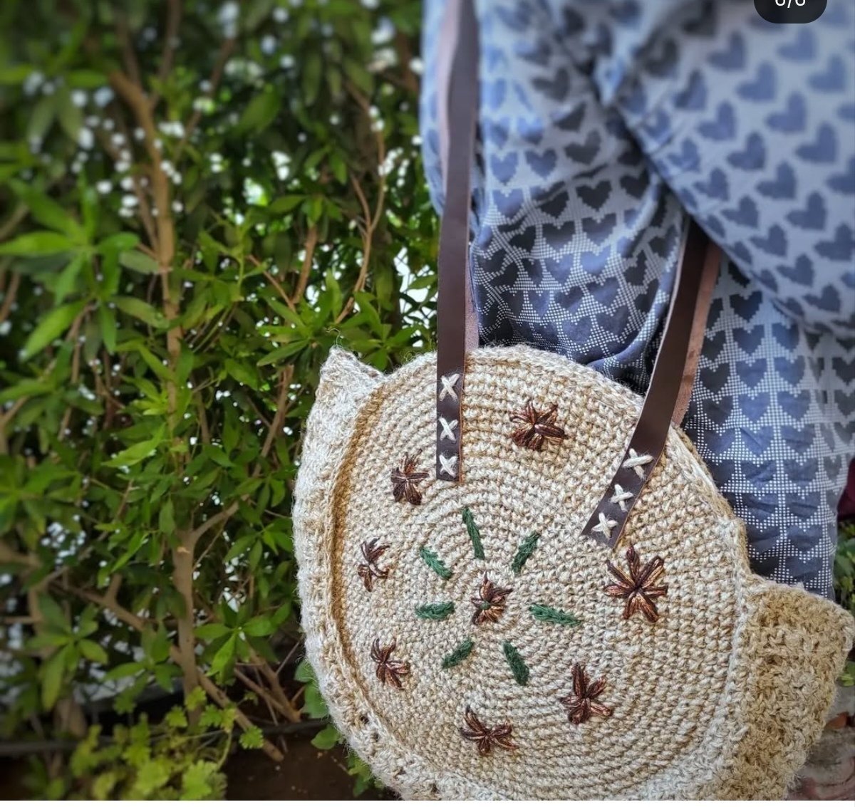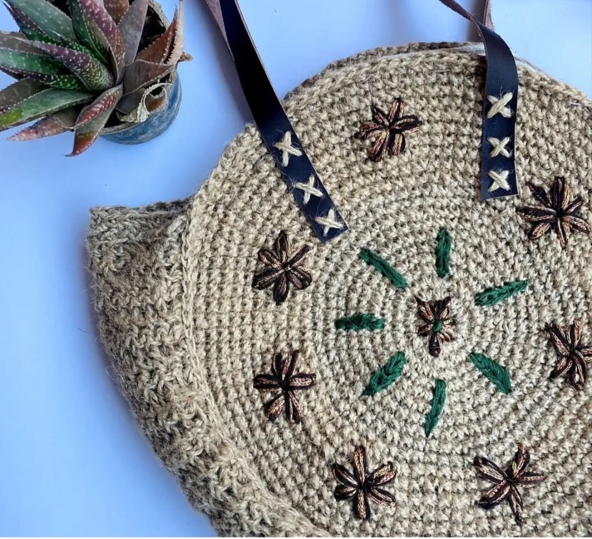 شنطة كروشيه مدورة خيط خيش ناعم تطريز يدوى اليد جلد طبيعي مبطنة من الداخل و يوجد جيب داخلى المقاس ٣٥ ،٣٥ سم