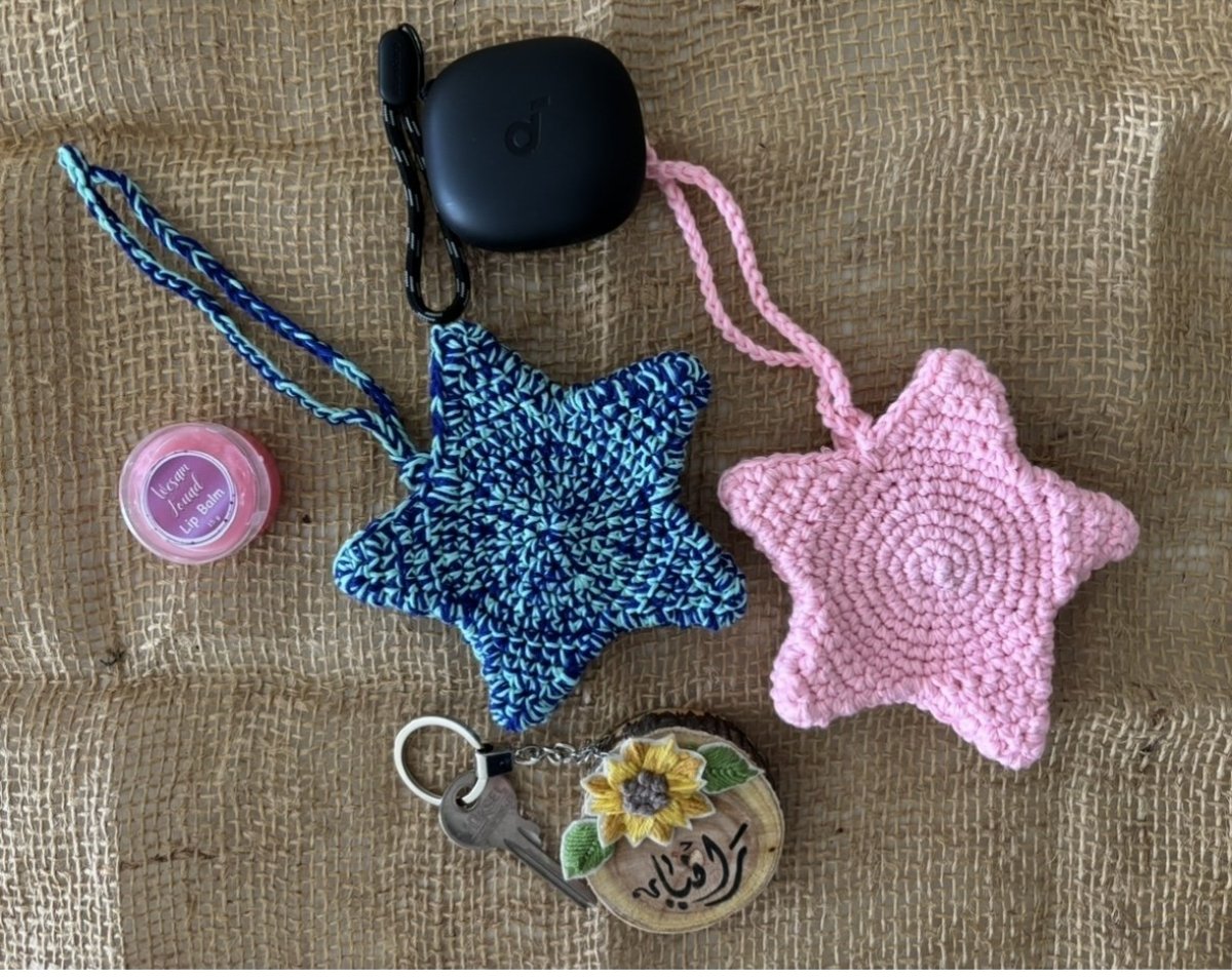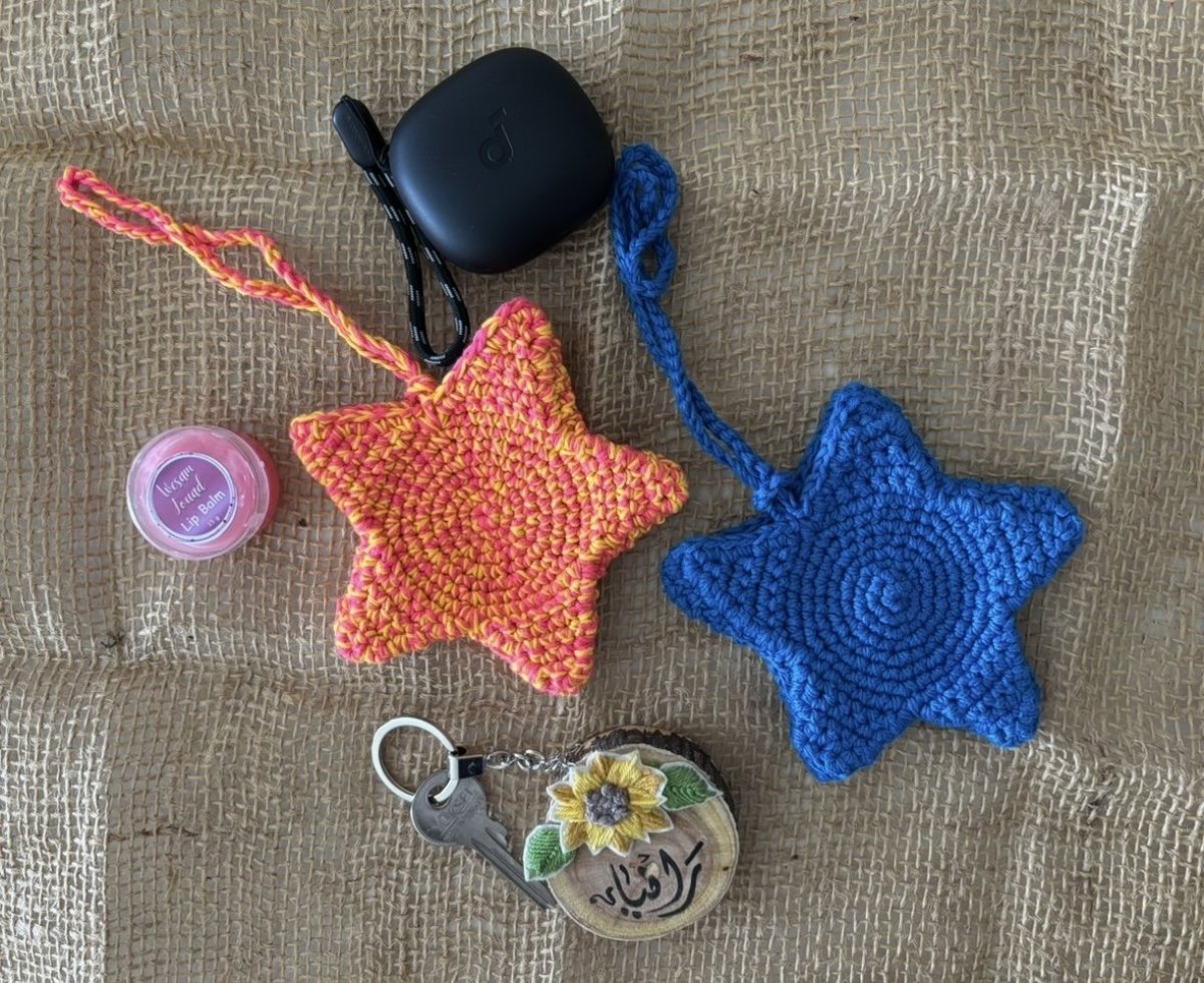 عليقة شنطة علي شكل نجمة مصنوعة من خيط قطن مصري مناسبة لحمل سماعات الأذن ، المفاتيح اللون : أزرق ، درجات أزرق متاحة فوري