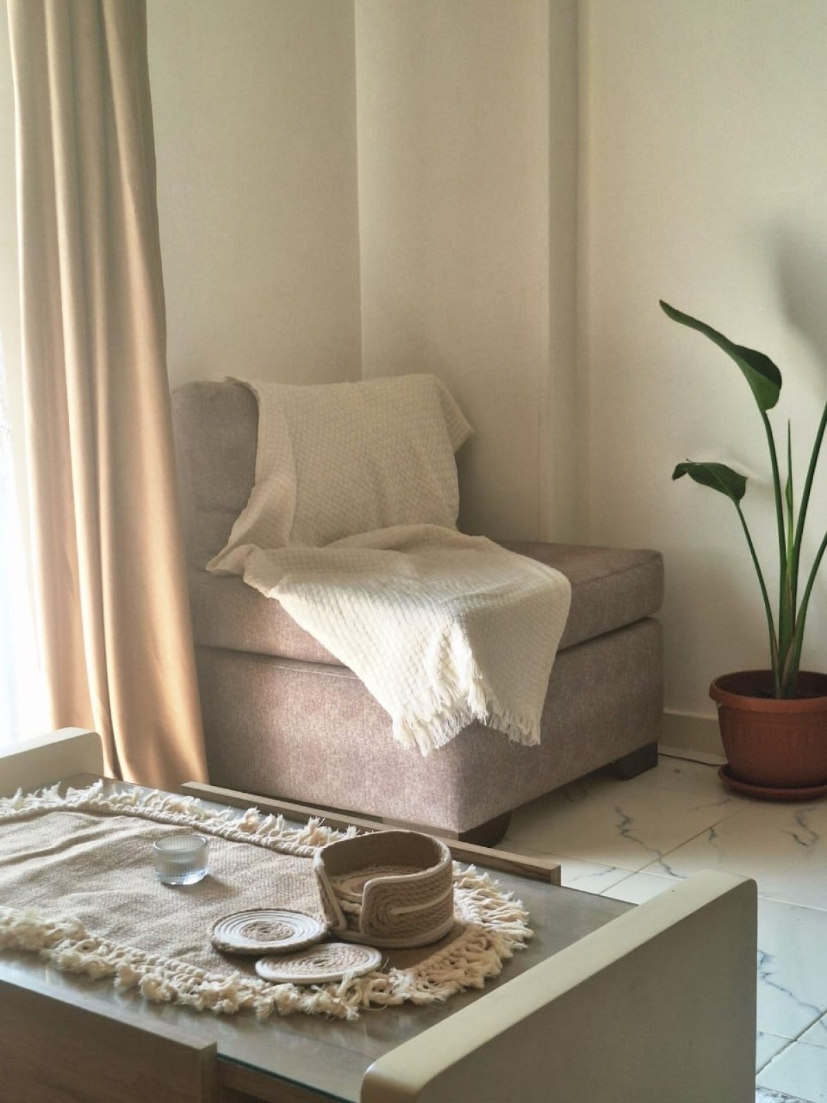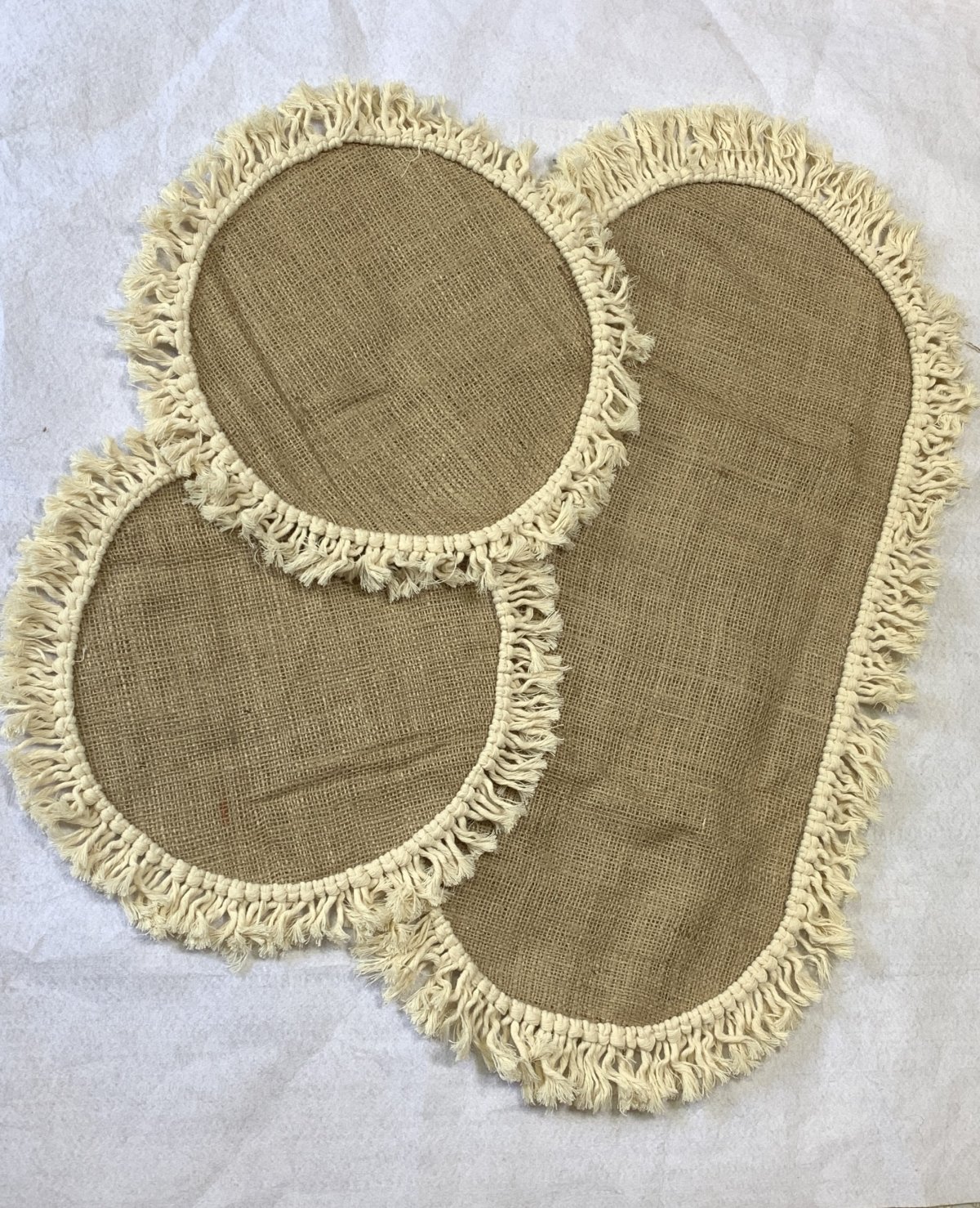 كفر ترابيزة طبقتين من قماش الخيش وشراشيب مكرمية الكفر طوله ٦٥سم عرضه ٣٥سم قطر الكوستر ٣٥ سم