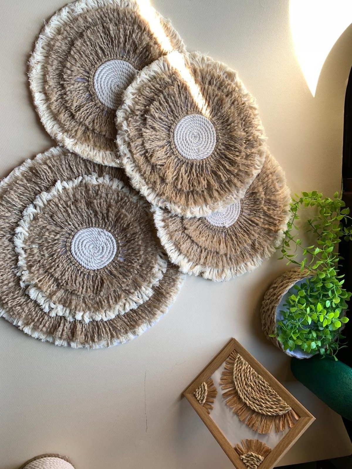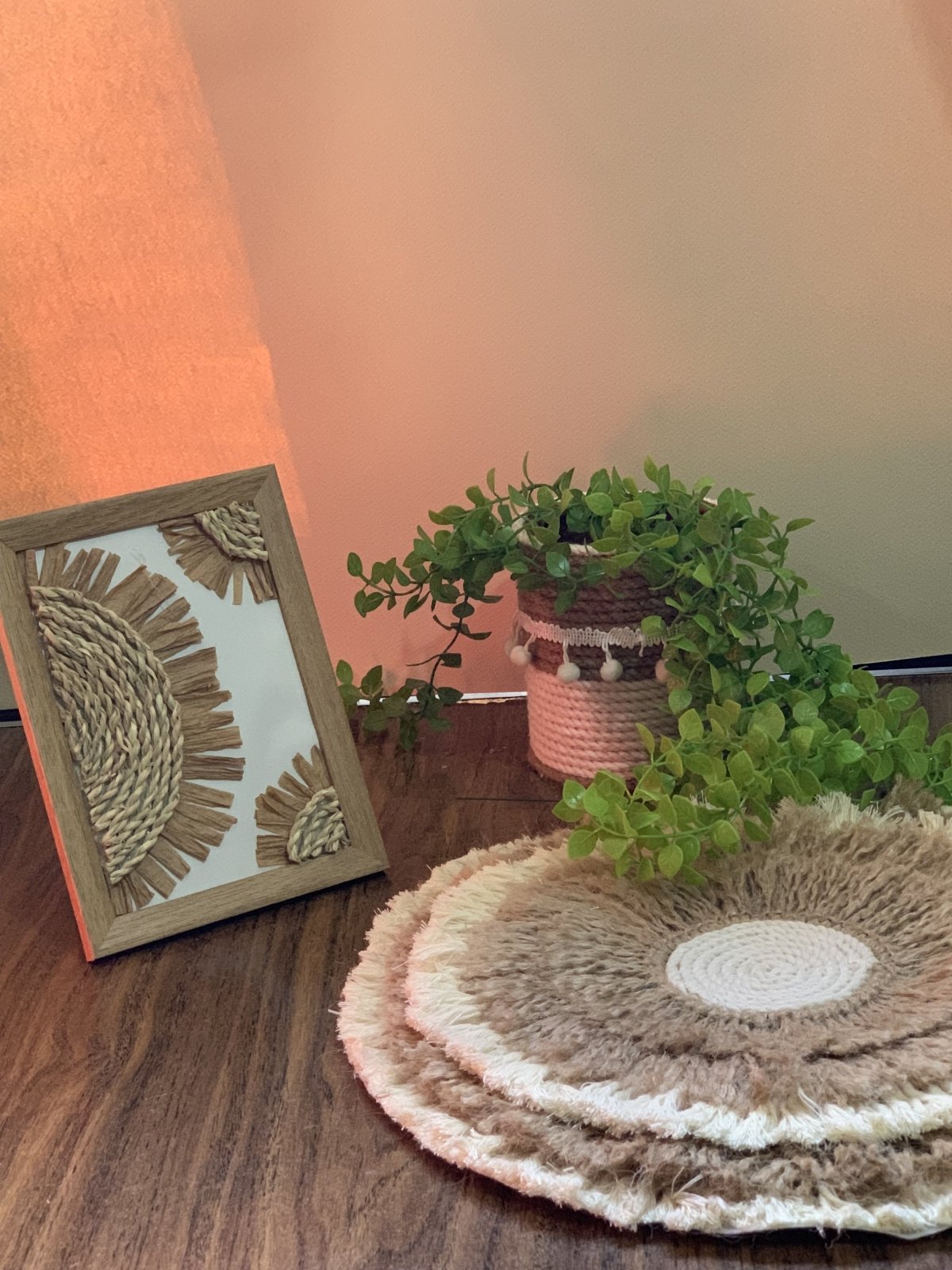 مجموعة من ٤ مفارش ترابيزة الكبير: ٣٥سم الصغير: ٢٨ سم من الخيش والمكرمية