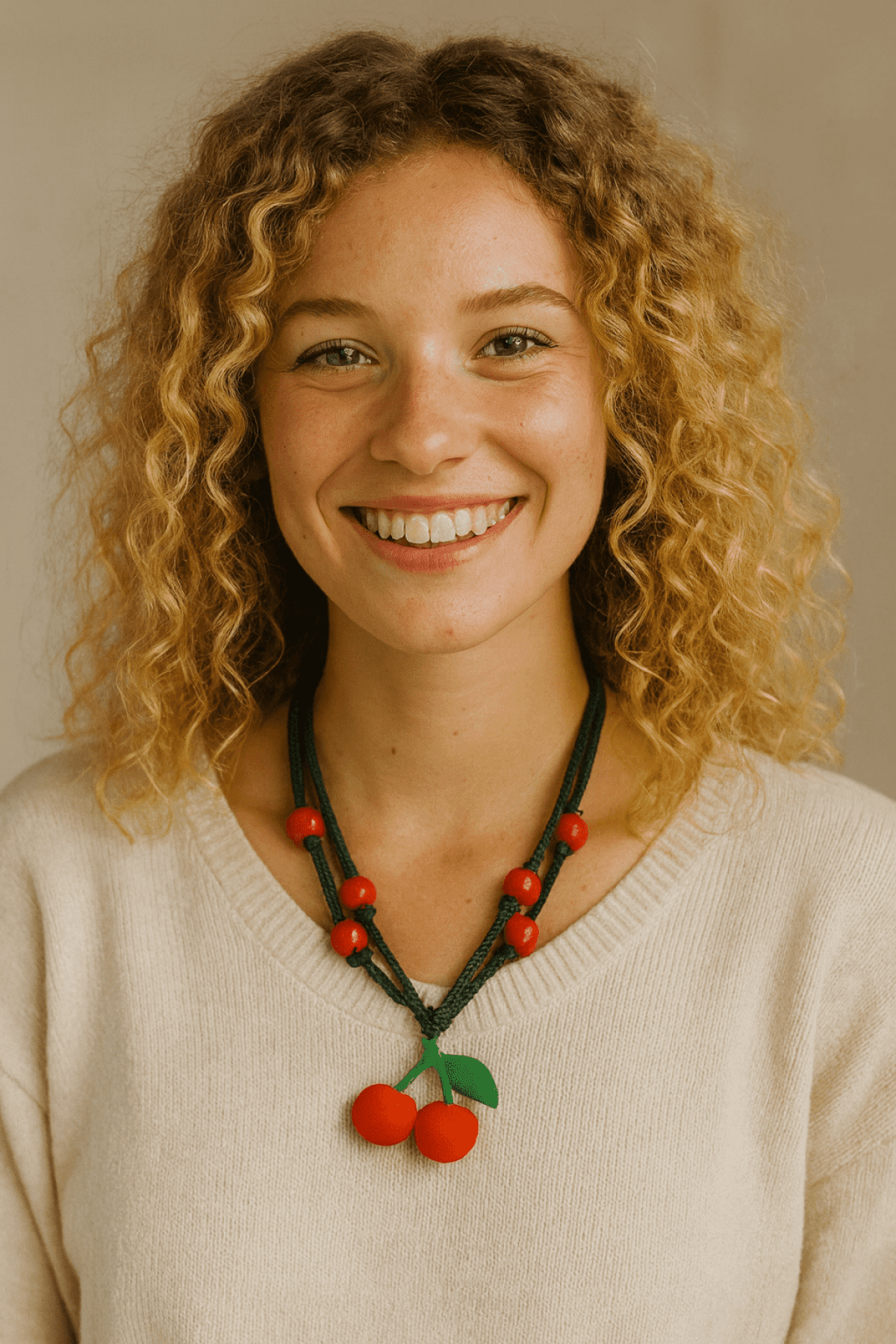 A playful handcrafted necklace featuring bright red wooden beads on dark green braided cords, finished with a bold cherry pendant and leaf accent. A cheerful, statement piece that adds a touch of fun and freshness to any outfit.