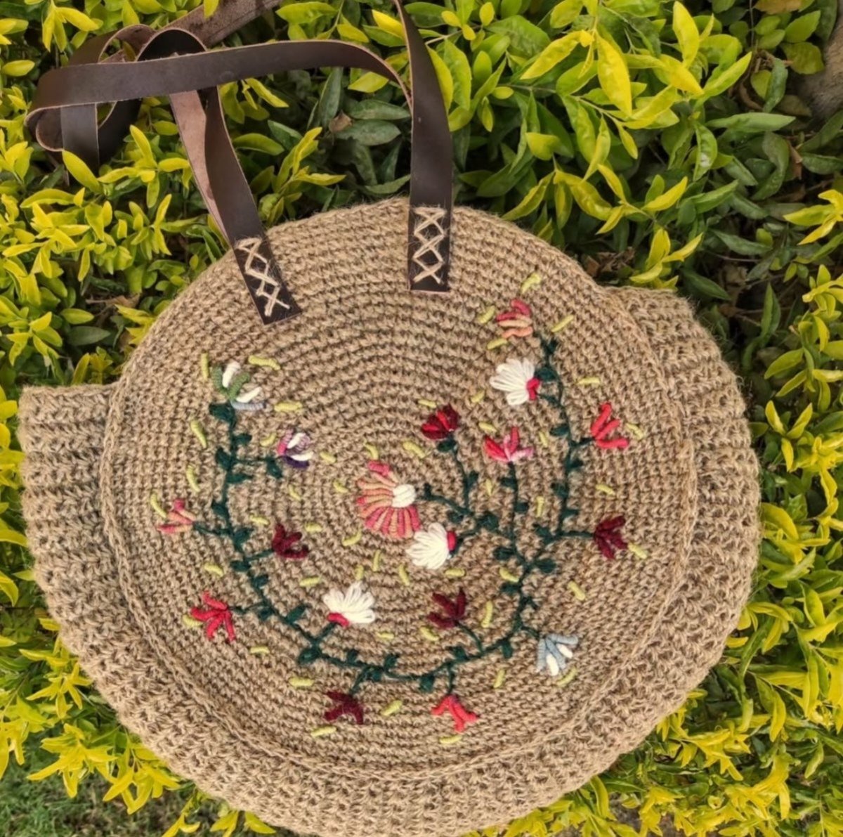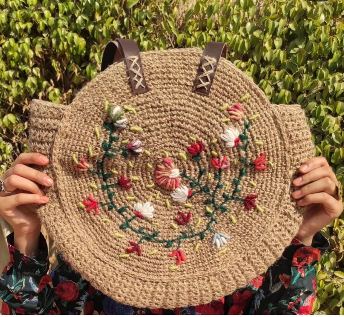 شنطة كروشية مدورة من خيط الخيش قطر الشنطة ٤٠ سم تطريز يدوى مبطنة من الداخل ويوجد جيب داخلى اليد جلد طبيعي