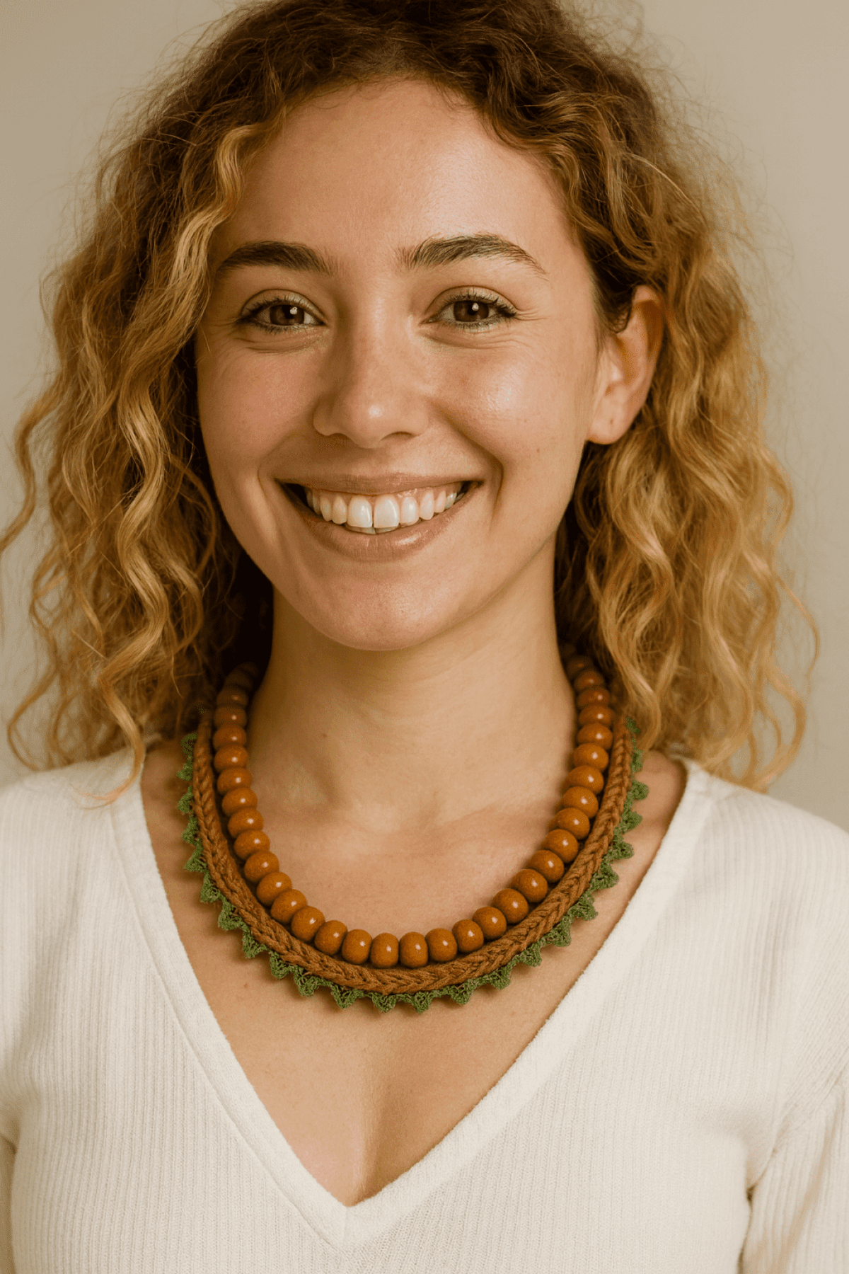 A handcrafted statement necklace featuring smooth wooden beads paired with delicate crochet details in earthy tones. The perfect blend of natural wood and artisanal crochet, offering a unique boho-chic look for any outfit.