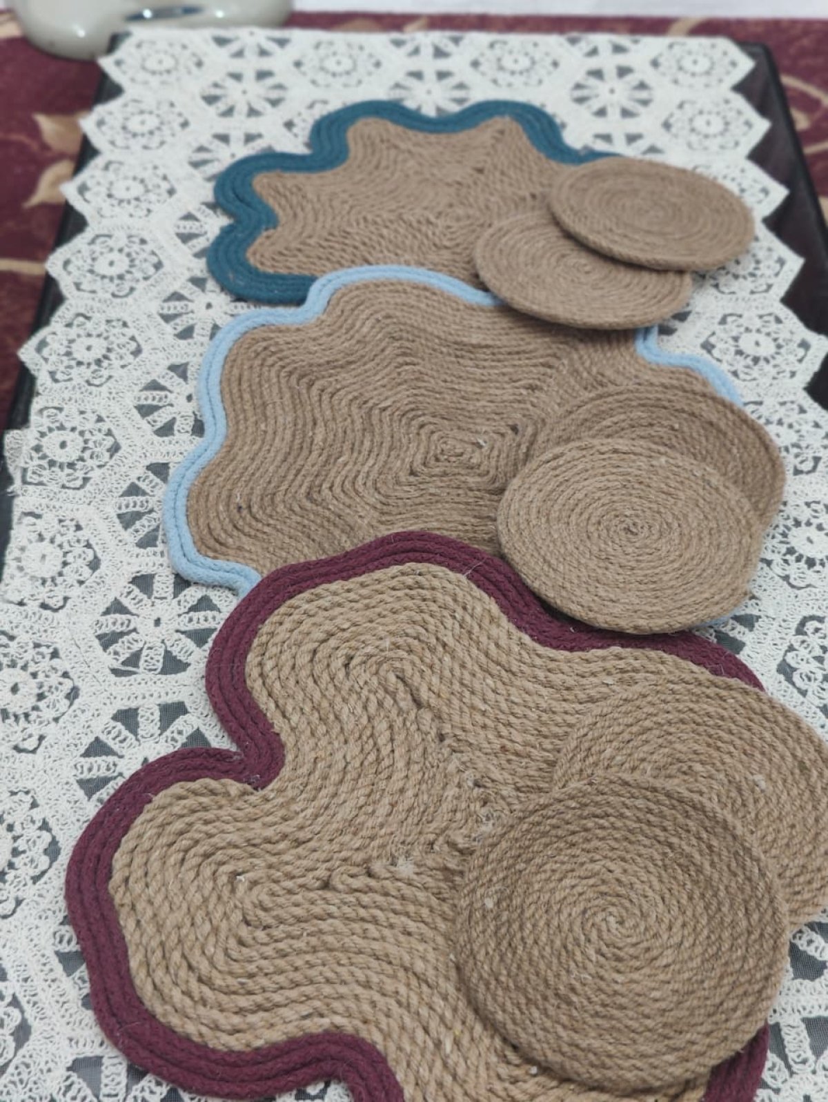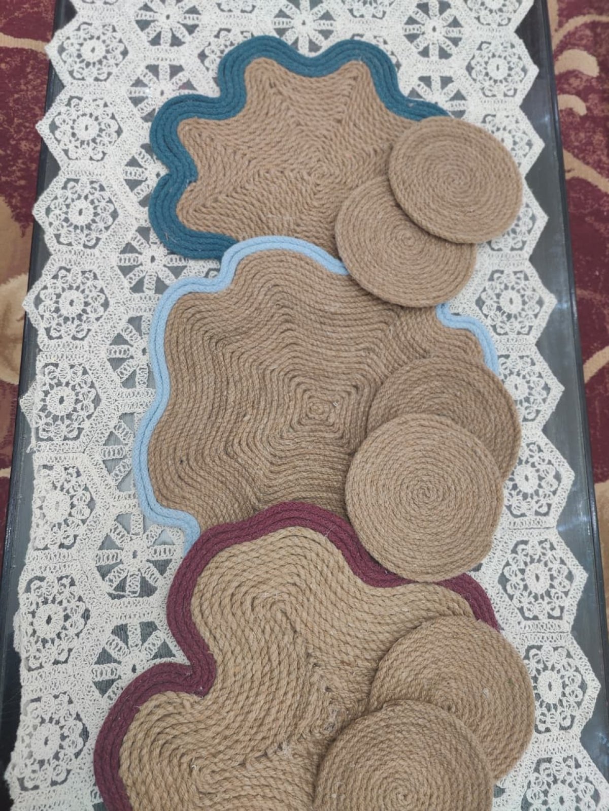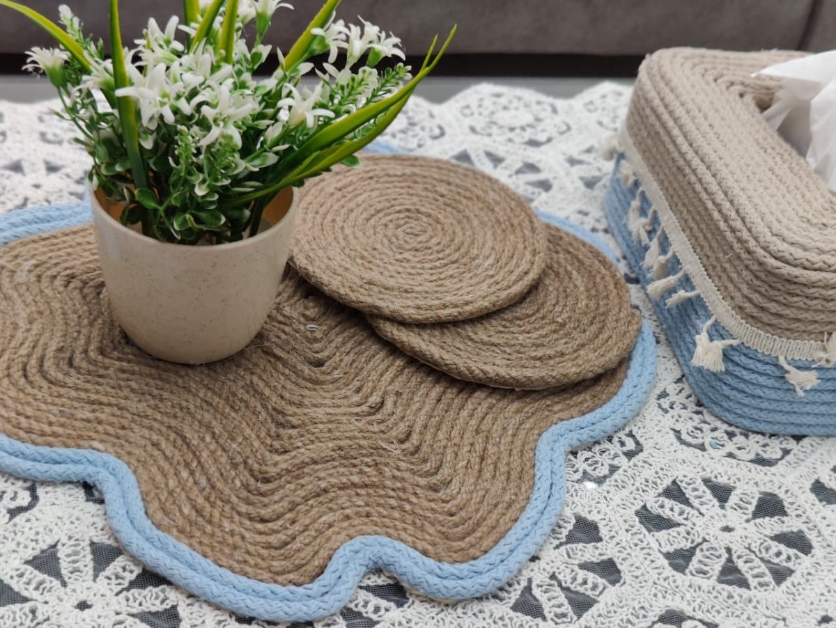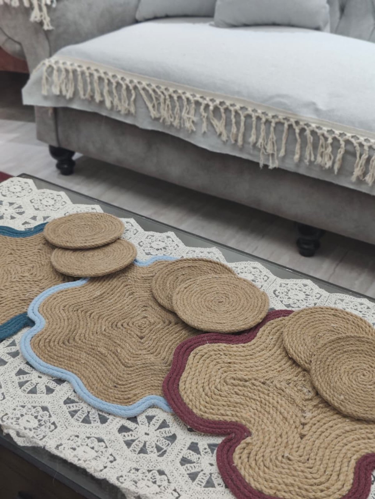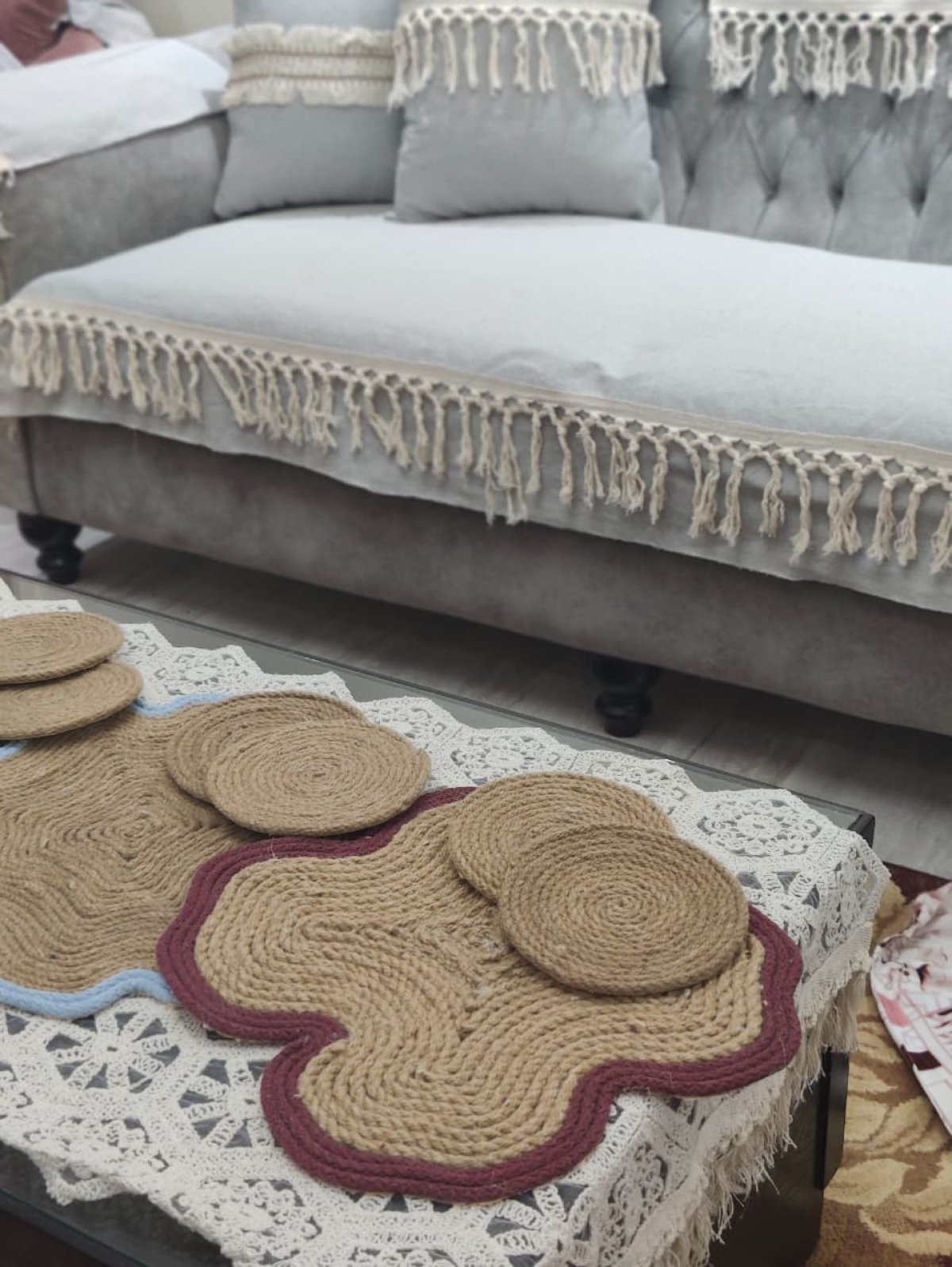 جددي غرفة المعيشة بلمسة من الدفء والأناقة مع طقم الكوسترات اليدوي من العزيزة هاند ميد. مصنوع من قماش ناعم بألوان محايدة ومزين بشرابات ماكرمية رقيقة، ويشمل الطقم كوستر كبير مع قطعتين صغيرتين للأكواب ليمنحك إطلالة طبيعية وعصرية. مثالي لحماية أثاثك وإضافة لمسة بوهيمية أنيقة لمنزلك.