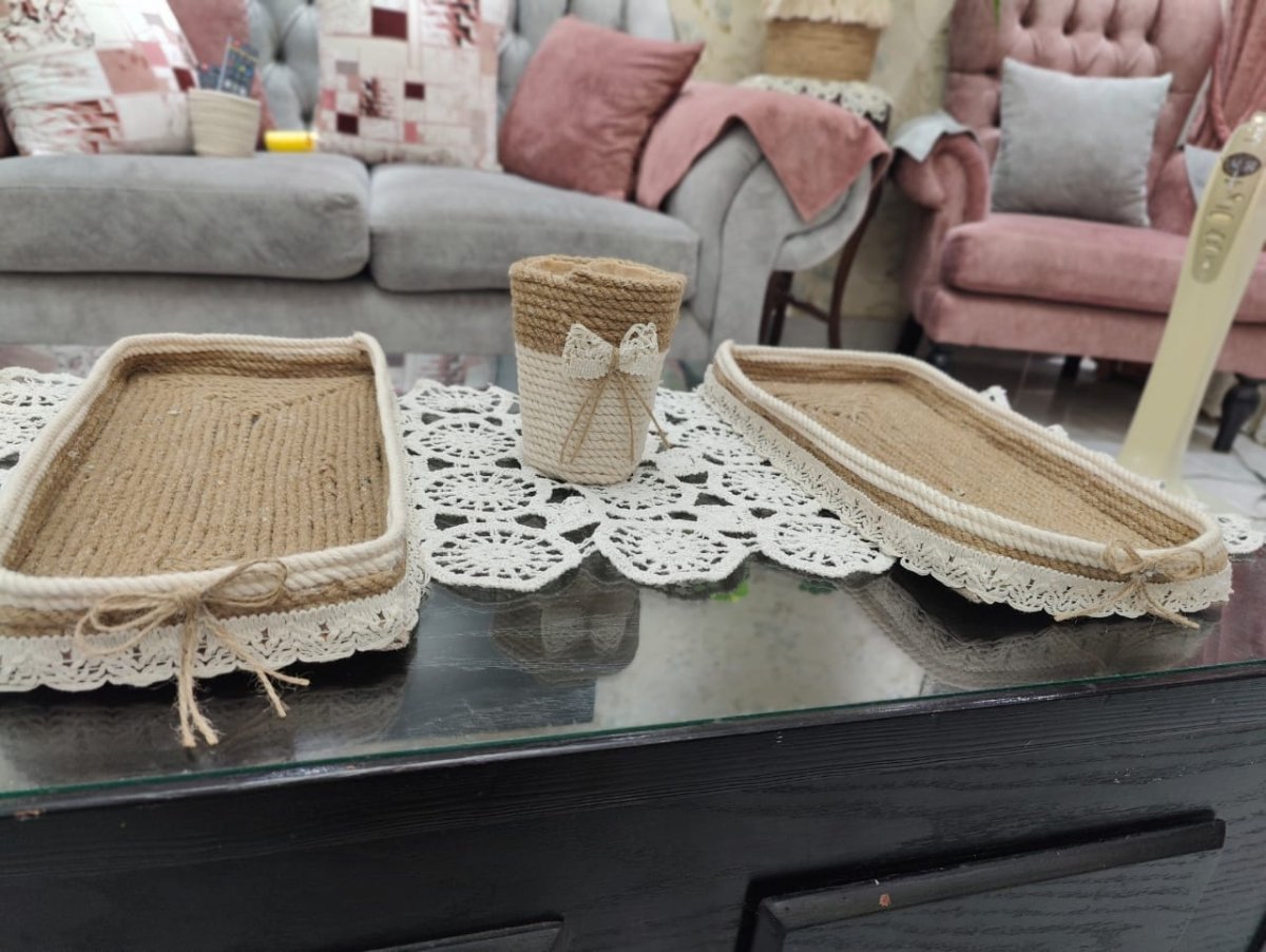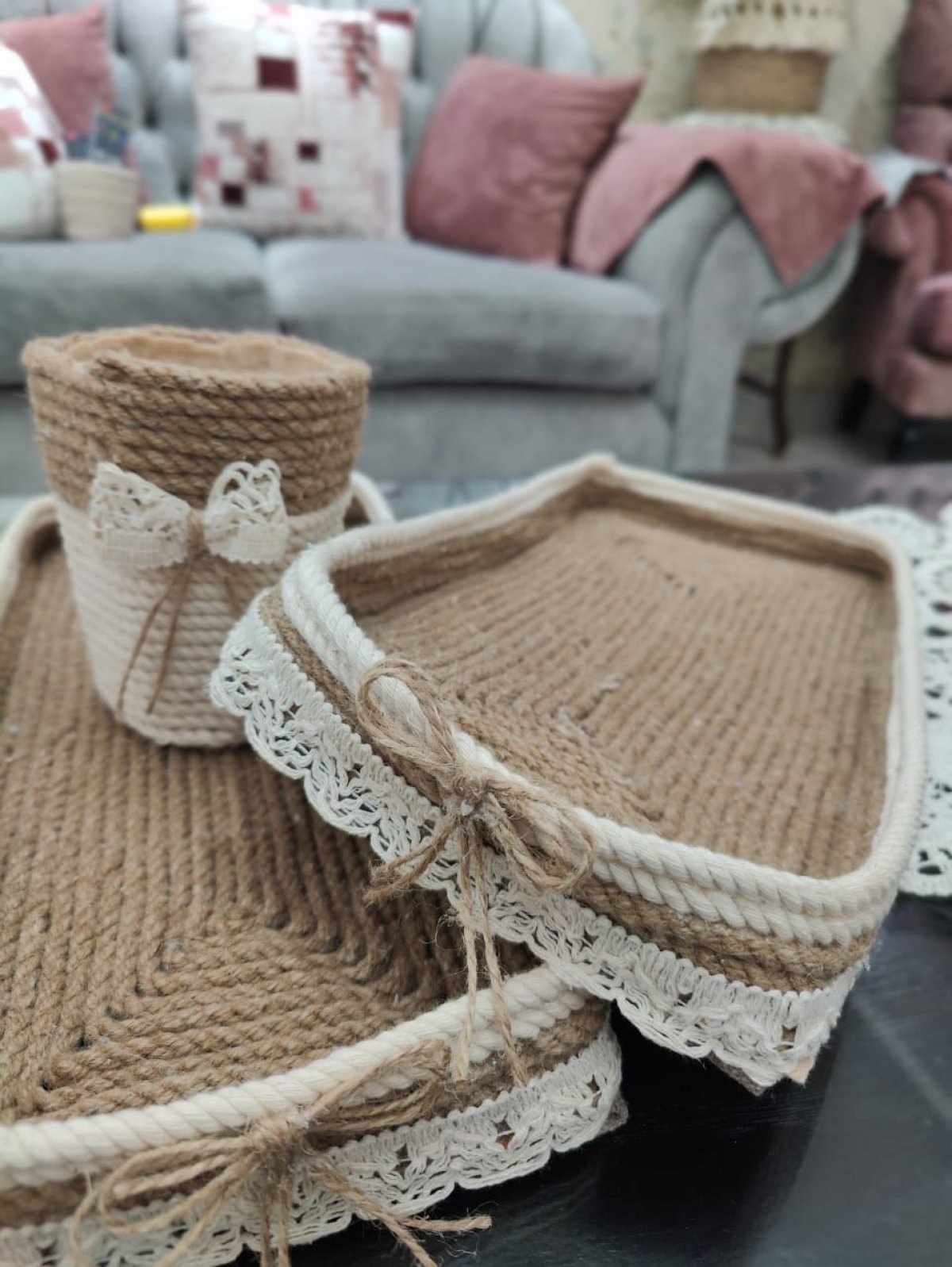 الوصف: أضف لمسة من الأناقة الريفية إلى منزلك مع طقم الصينية والمنظم المصنوع يدويًا من الجوت من العزيزة هاند ميد. ✔ صناعة يدوية 100% بخيوط الجوت الطبيعية ✔ مزين بالدانتيل لإطلالة أنيقة وكلاسيكية ✔ مثالي للتقديم، التنظيم، أو كقطعة ديكور مميزة ✔ متين، صديق للبيئة، وأنيق اختيار رائع لغرفة المعيشة أو المطبخ، كما يعد هدية مميزة ومختلفة لمن تحب. منظم التسريحة 35*15 البوت 15 سم