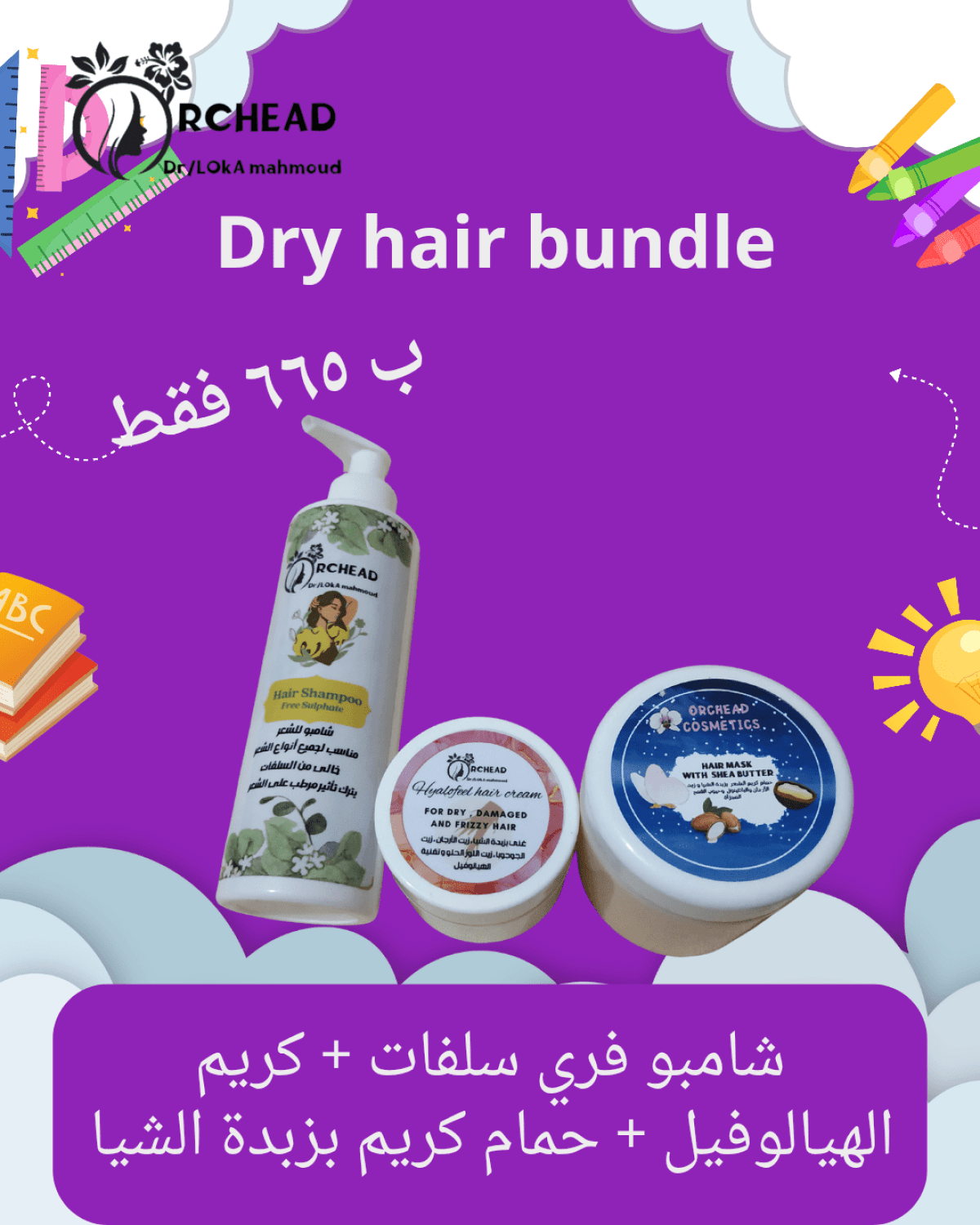 عرض مجموعة الشعر الجاف يتكون من شامبو خالي من السلفات ينظف الشعر بدون أن يسبب جفاف أو تقصف الشعر ، مع حمام كريم بزبدة الشيا حجم كبير وكريم الهيالوفيل لترطيب عميق للشعر .