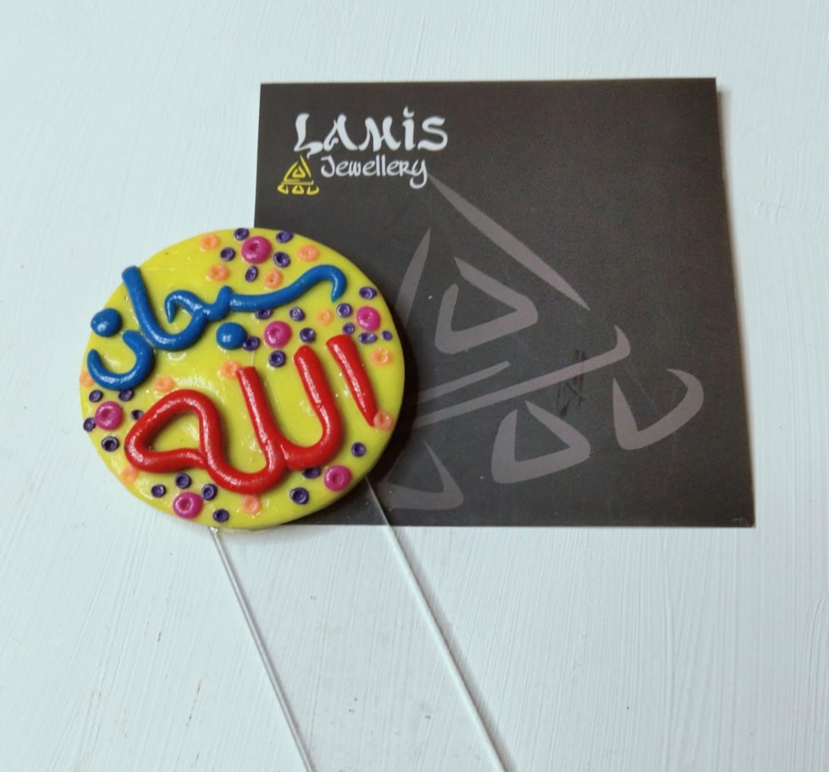 فاصل كتب (بوك مارك) يدوي من الصلصال الحراري، بتصميم دائري باللون الأصفر، مزين بعبارة "سبحان الله" بألوان بارزة (أزرق وأحمر) مع زخارف من النقاط الملوّنة. قطعة مميزة تضيف لمسة روحانية وجمالية إلى كتبك