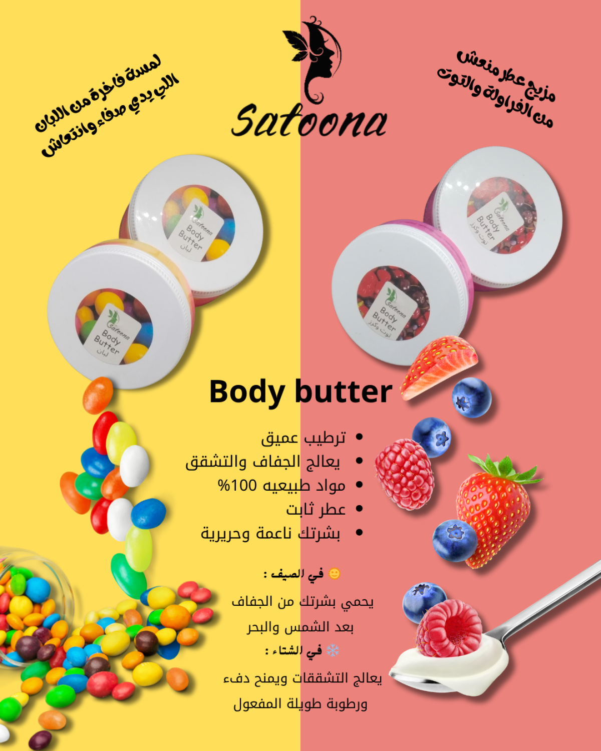 دلّعي ب🍓 مزيج عطر منعش من الفراولة والتوت بشرتك مع Body Butter الطبيعي ✨ 🌿 مع لمسة فاخرة من اللبان اللي يدي صفاء وانتعاش 💧 فوائد زبدة الجسم: ✔️ ترطيب عميق يعالج الجفاف والتشقق ✔️ تغذية من الزيوت والزبدات الطبيعية ✔️ تثبيت رائحة عطرية فريدة تدوم ✔️ يترك بشرتك ناعمة وحريرية 🌞 في الصيف: يحمي بشرتك من الجفاف بعد الشمس والبحر ❄️ في الشتاء: يعالج التشققات ويمنح دفء ورطوبة طويلة المفعول 💖 اختيارك المثالي للعناية ببشرتك طبيعي 100% طوال السنة
