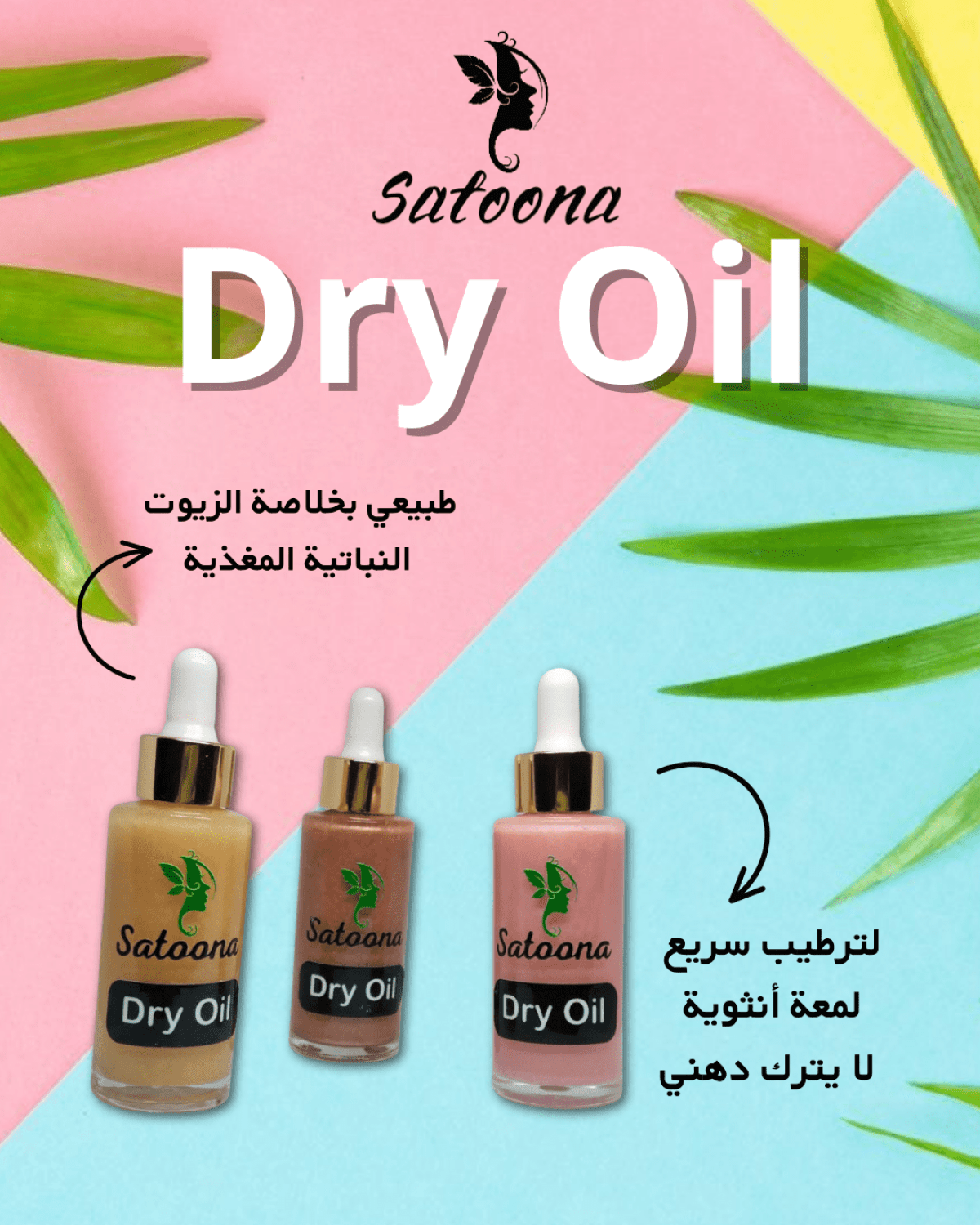 ✨ لمعة طبيعية... في ثانية! ✨ جديد من Satoona – دراي أويل dry oil طبيعي بخلاصة الزيوت النباتية المغذية لترطيب سريع ولمعة أنثوية بدون أي إحساس دهني! 💛 متوفر بـ ٤ اختيارات ساحرة: ذهبي شمري ✨ وردي شمري 🌸 برونزي شمري 🥥 بدون لون 🤍 للبشرة الحساسة ولمسة طبيعية ناعمة 💃 مناسب للجسم، الكتاف، الرجلين، وحتى أطراف الشعر