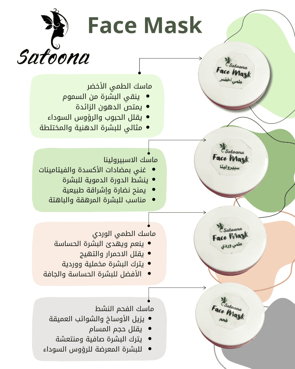 دلّلي بشرتك مع ماسكات الطبيعة ✨ اختاري الماسك اللي يناسب احتياجات بشرتك من مجموعة الماسكات الطبيعية الفعّالة: 🌿 ماسك الطمي الأخضر ✔ ينقي البشرة من السموم ✔ يمتص الدهون الزائدة ✔ يقلل الحبوب والرؤوس السوداء 💆♀️ مثالي للبشرة الدهنية والمختلطة 🌊 ماسك الاسبيرولينا ✔ غني بمضادات الأكسدة والفيتامينات ✔ ينشط الدورة الدموية للبشرة ✔ يمنح نضارة وإشراقة طبيعية 💆♀️ مناسب للبشرة المرهقة والباهتة 🌸 ماسك الطمي الوردي ✔ ينعم ويهدئ البشرة الحساسة ✔ يقلل الاحمرار والتهيج ✔ يترك البشرة مخملية ووردية 💆♀️ الخيار الأفضل للبشرة الحساسة والجافة 🖤 ماسك الفحم النشط ✔ يزيل الأوساخ والشوائب العميقة ✔ يقلل حجم المسام ✔ يترك البشرة صافية ومنتعشة 💆♀️ مثالي للبشرة المعرضة للرؤوس السوداء 💖 كل ماسك طبيعي 100%، آمن وفعّال لروتينك الجمالي. اختاري الماسك اللي يناسبك وعيشي تجربة سكين كير مختلفة ✨