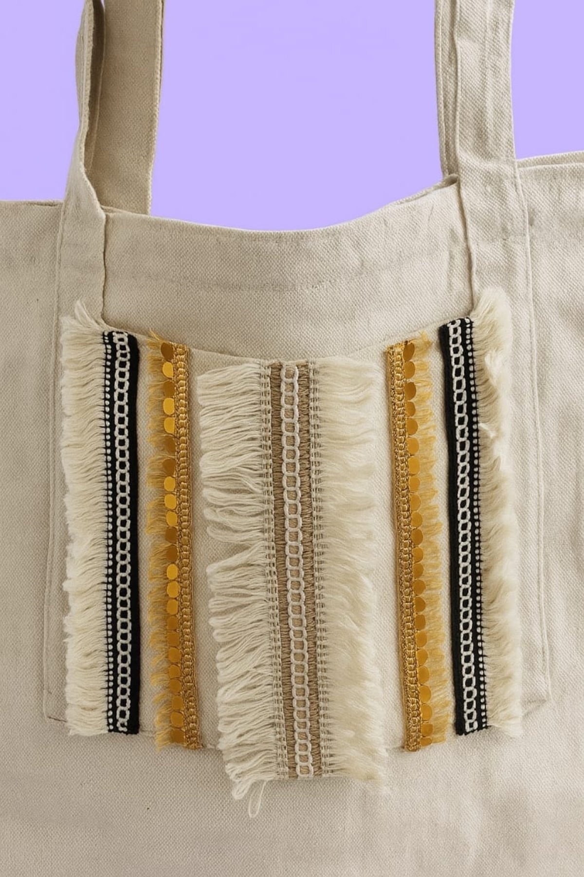 توتي باج قماش دك تقيل متقسمه من الداخل واسعه عليها شرايط لون اوف وايت