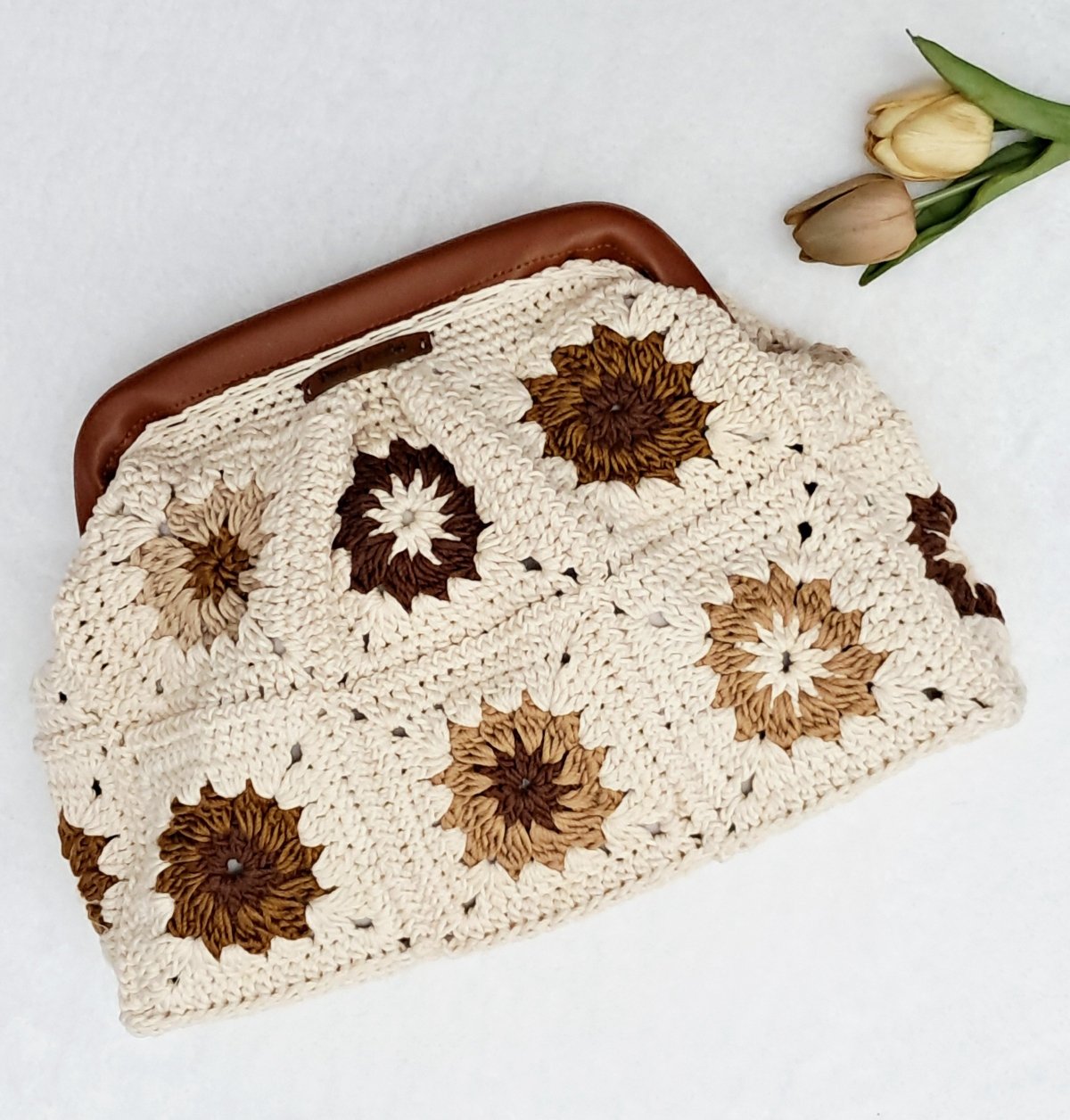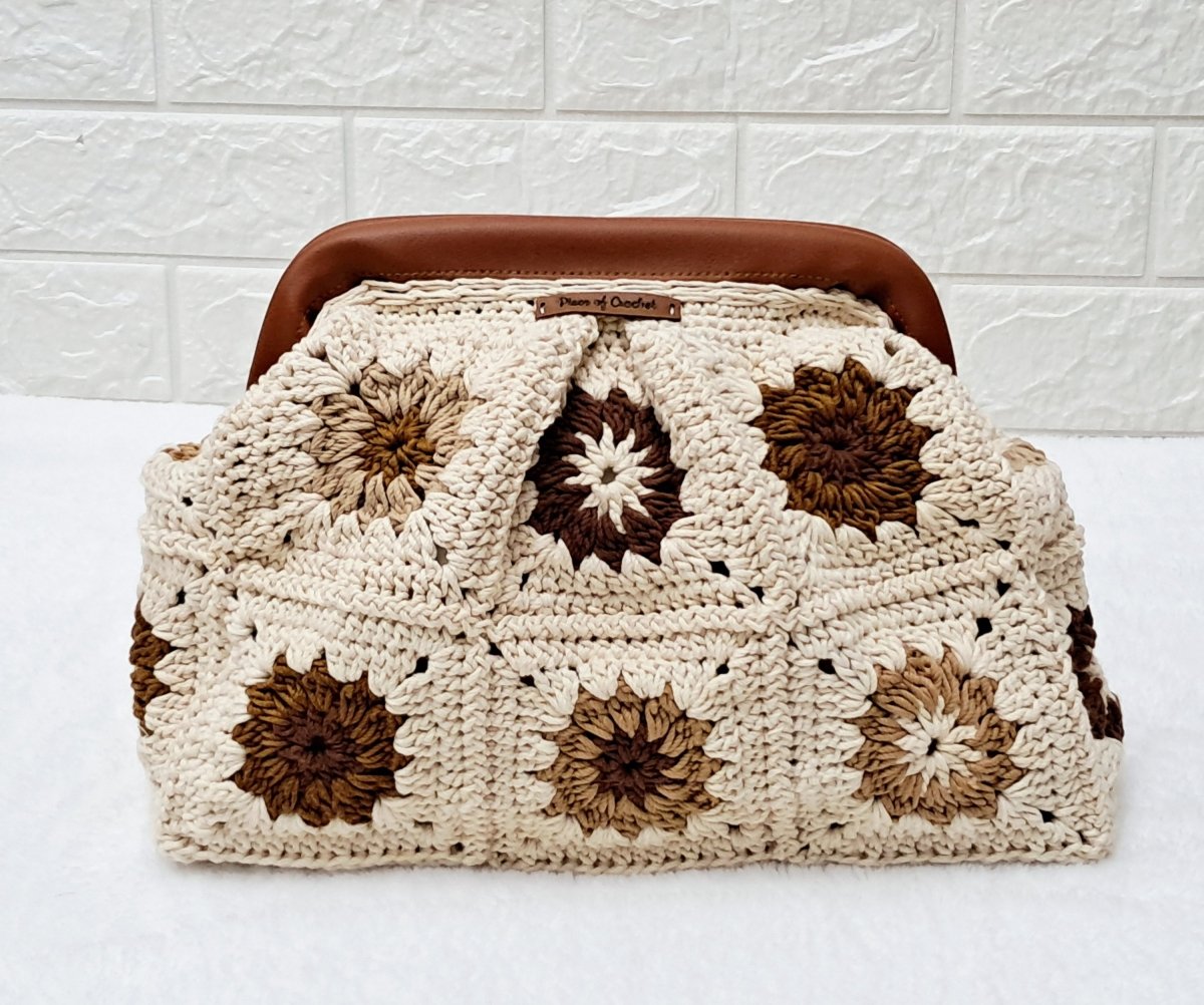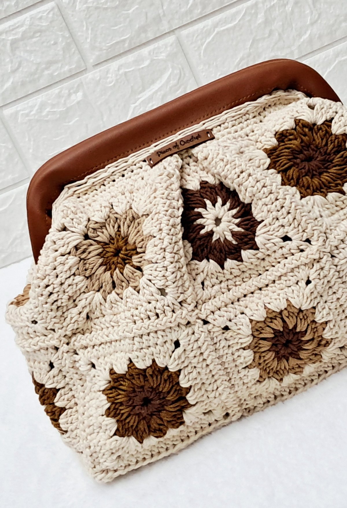 الكلاتش مشغول بمربعات الجرابي من خيوط قطنية عالية الجودة . وله فريم سحرى مبطن بجلد جودة ممتازة . الكلاتش مبطن من الداخل . ارتفاعه ٢٣ سم وعرضه من المنتصف ٣٨ سم . طول القاعدة ٣٥ سم وعرض القاعدة ١٢ سم . متاح تنفيذة بأى الوان مختلفه وكمان ممكن يتنفيذ بتصميم مختلف لمربعات الجرانى . متاح إضافة يد كروس او يد كتف سواء من الجلد أو الكروشية حسب الطلب .