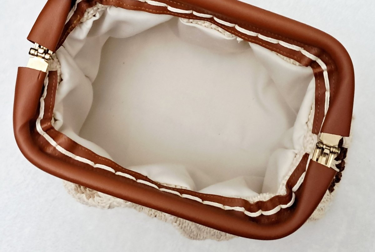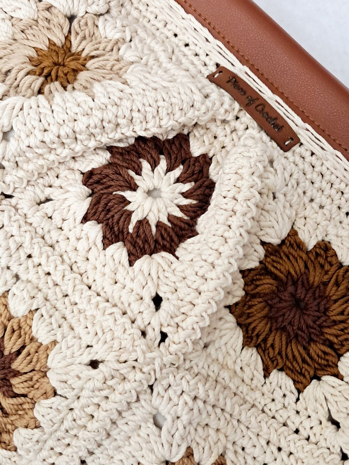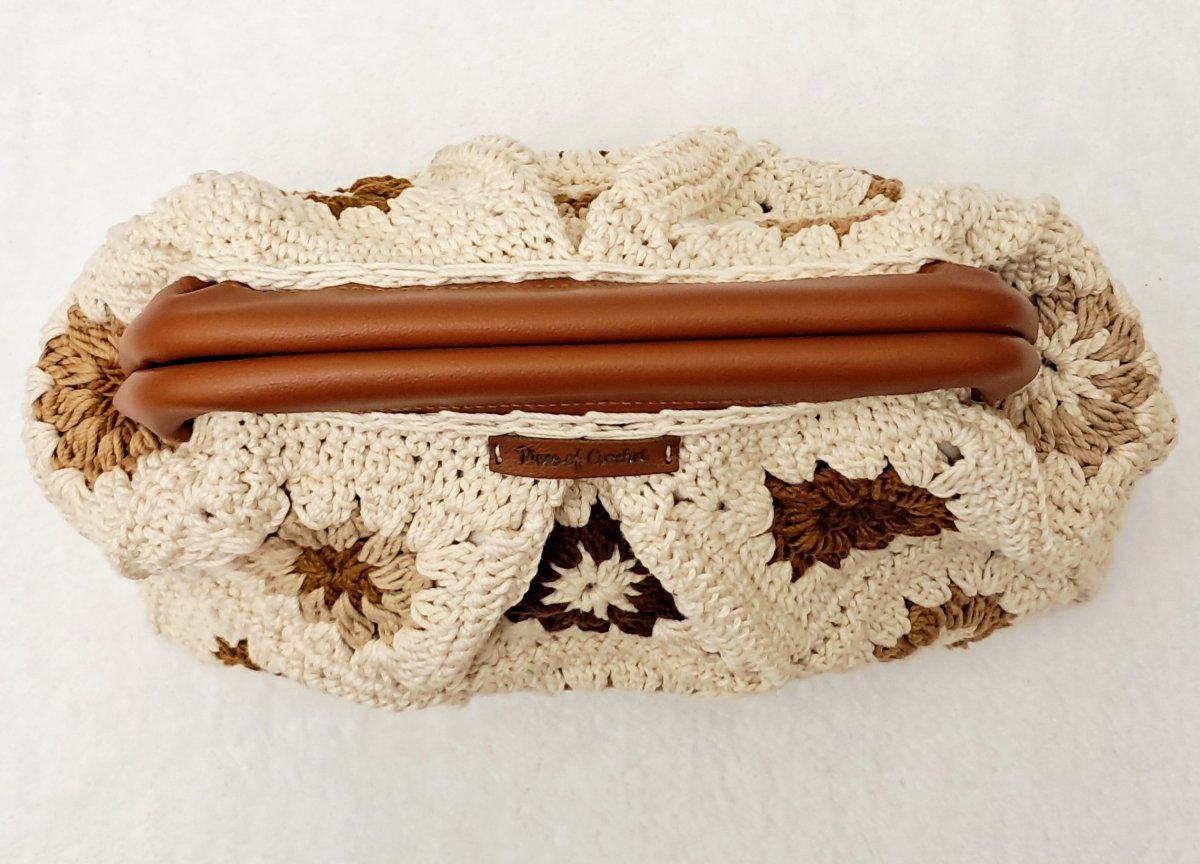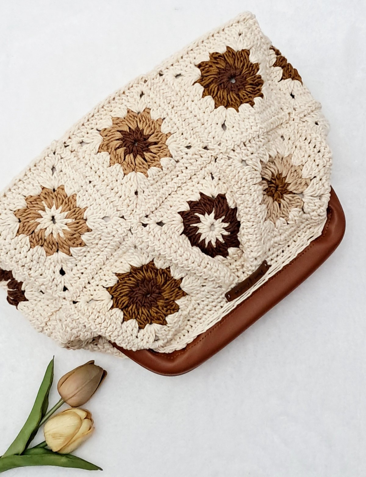 الكلاتش مشغول بمربعات الجرابي من خيوط قطنية عالية الجودة . وله فريم سحرى مبطن بجلد جودة ممتازة . الكلاتش مبطن من الداخل . ارتفاعه ٢٣ سم وعرضه من المنتصف ٣٨ سم . طول القاعدة ٣٥ سم وعرض القاعدة ١٢ سم . متاح تنفيذة بأى الوان مختلفه وكمان ممكن يتنفيذ بتصميم مختلف لمربعات الجرانى . متاح إضافة يد كروس او يد كتف سواء من الجلد أو الكروشية حسب الطلب .