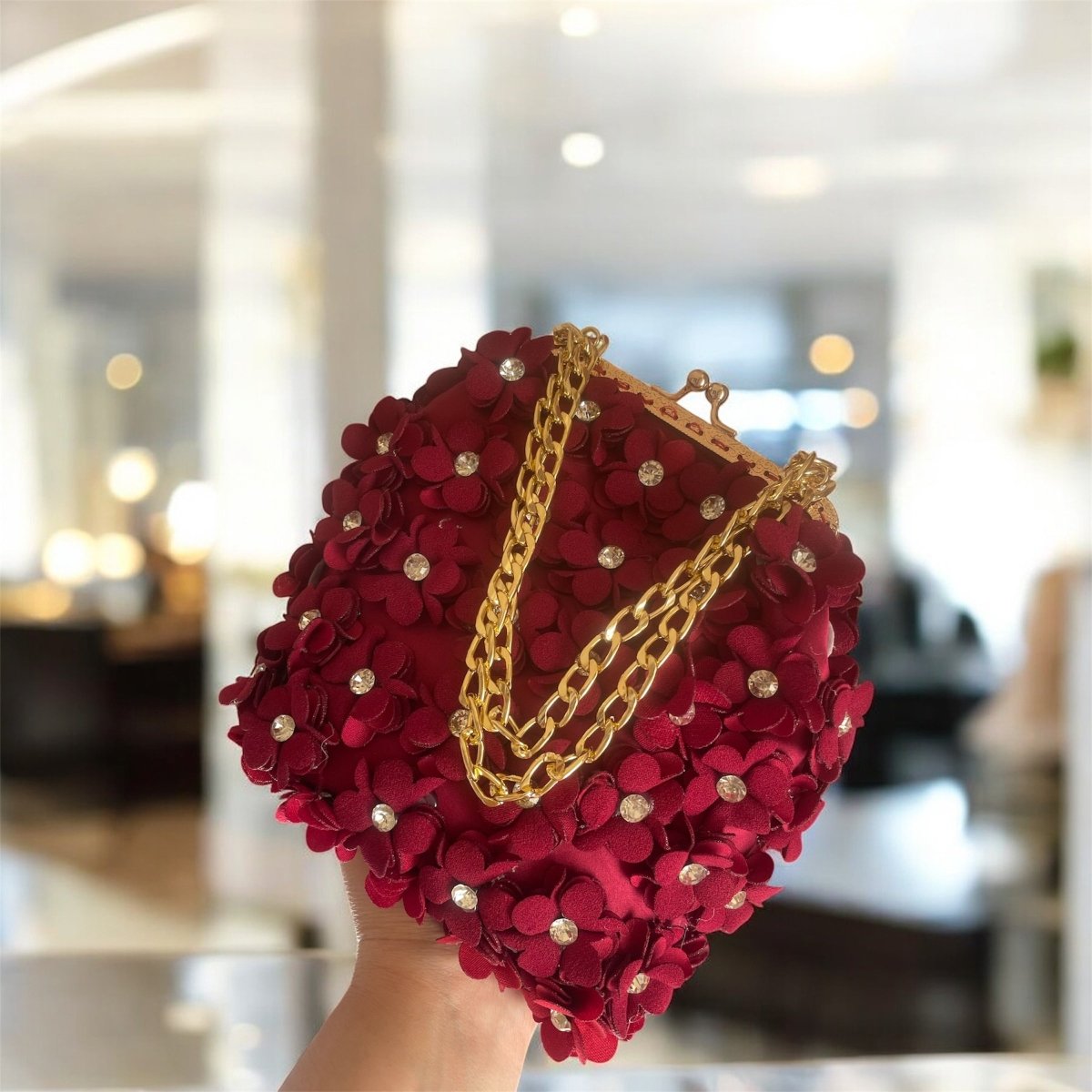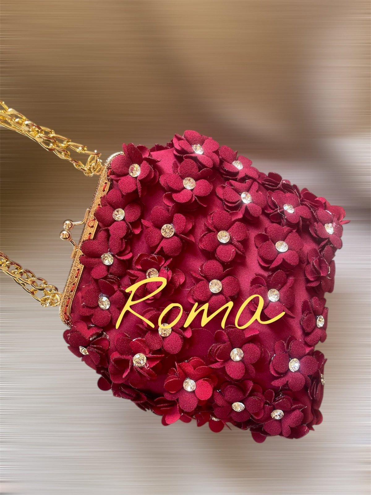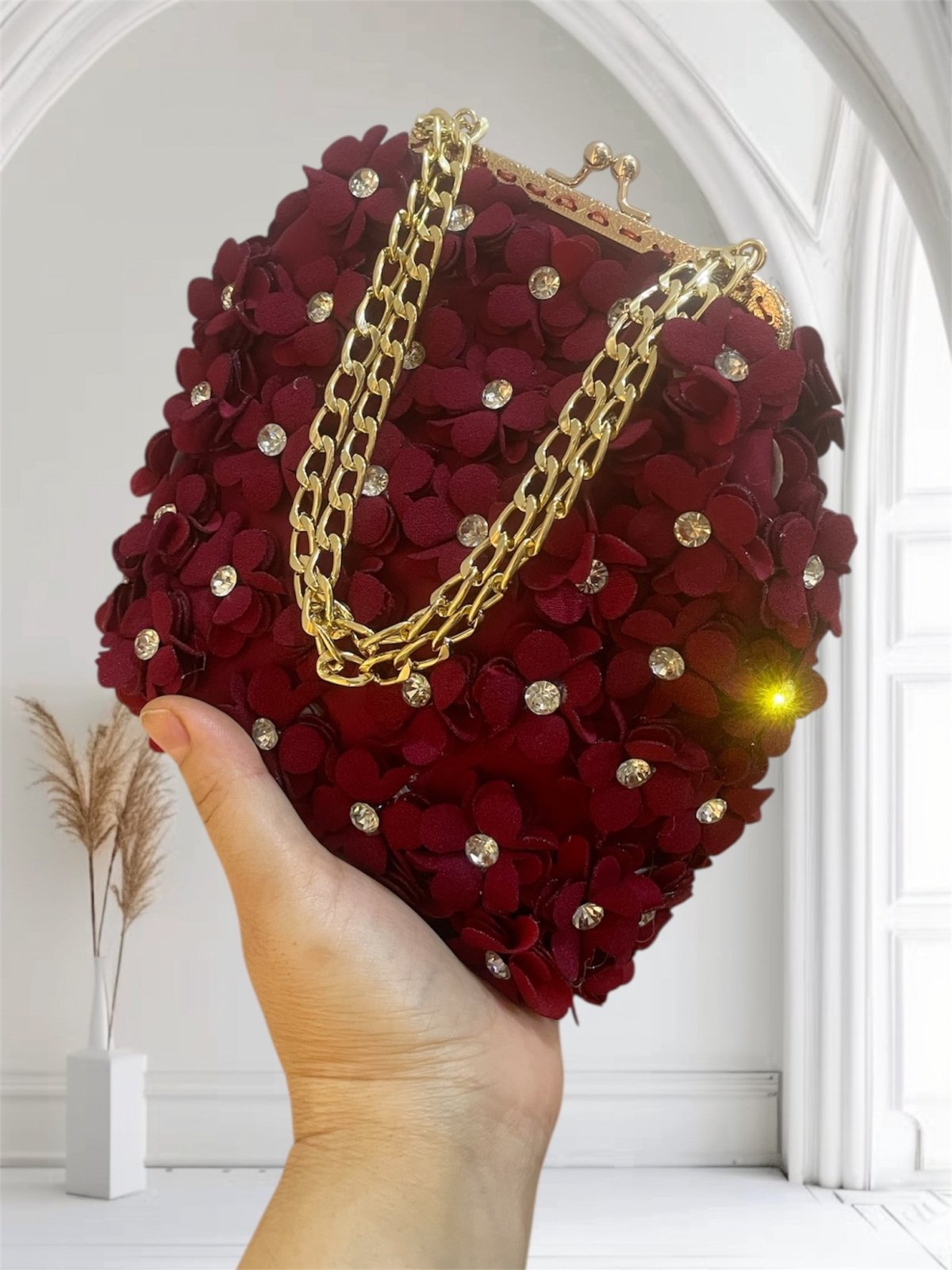 حقيبه من الورود صنعت يدويا من قماش ستان مزينه بالورود ذات اللون البرجاندي مقاس الفريم ١٢ تشيل فون لها دراع من السلسله