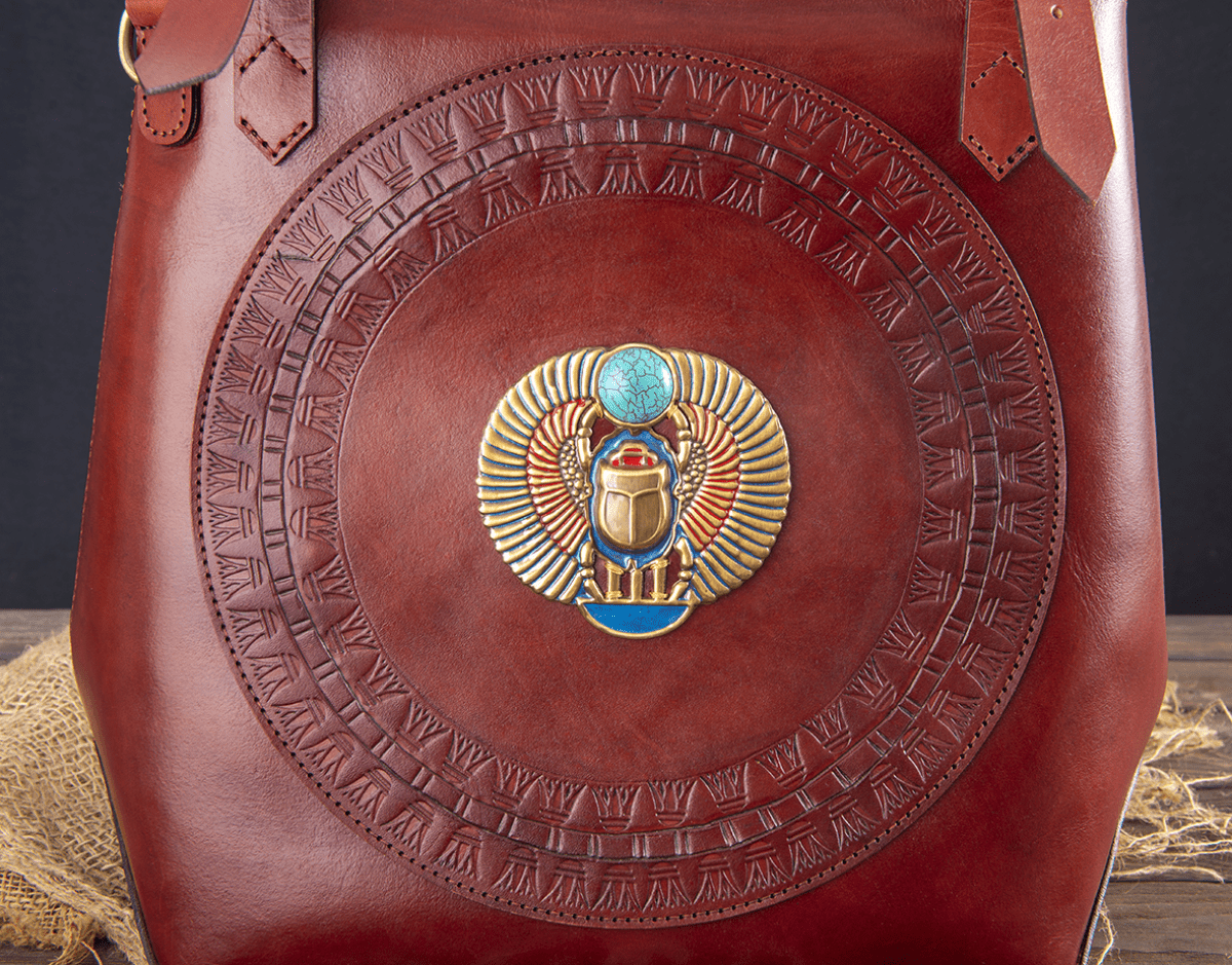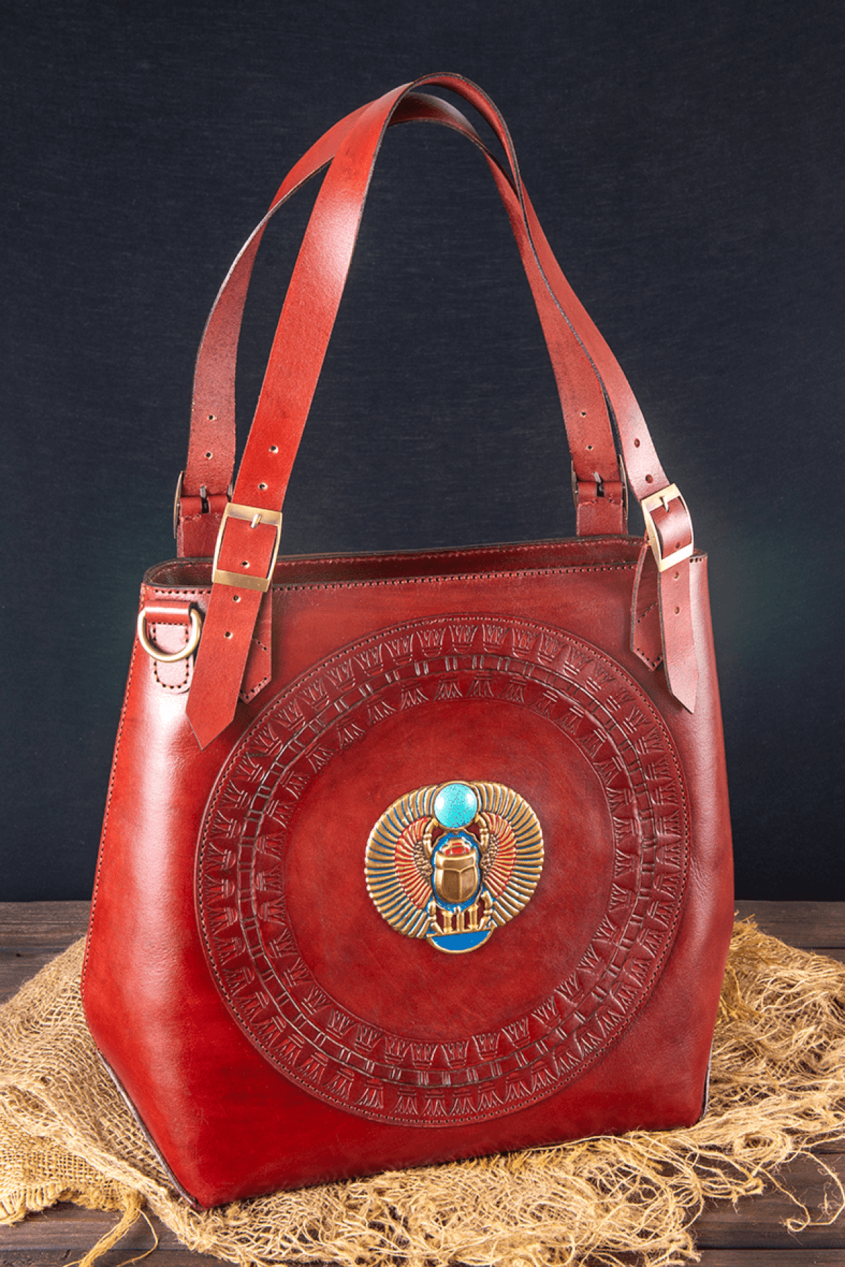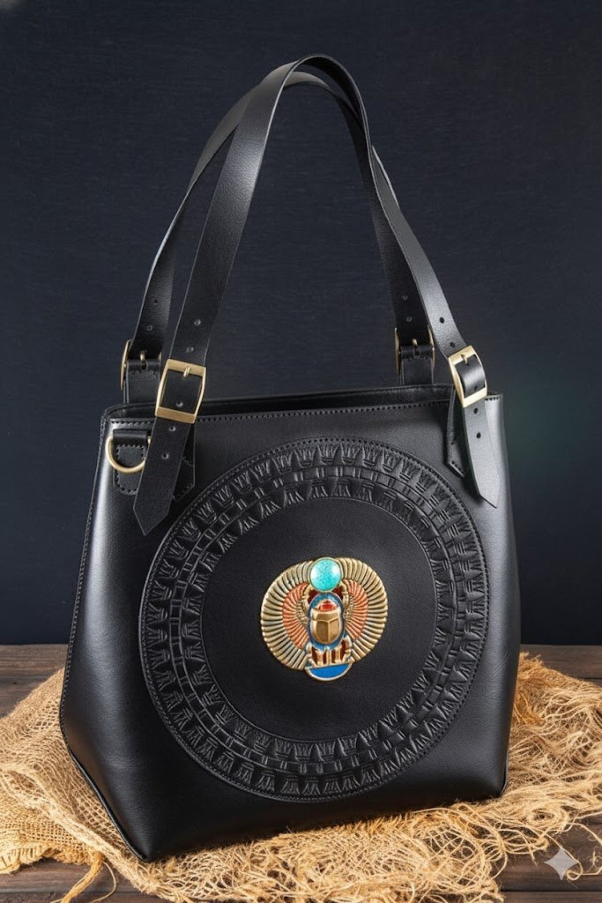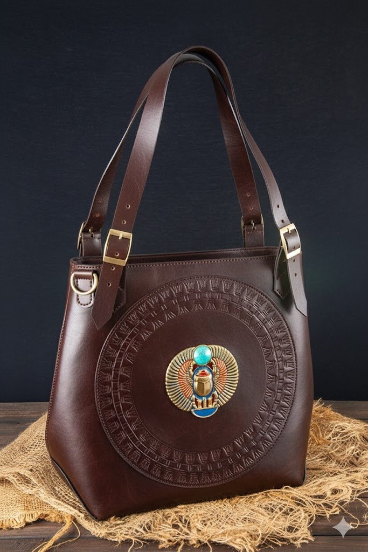 A luxurious handcrafted tote bag made from chrome-free full-grain leather, carefully hand-dyed with premium Italian dye and finished with an authentic Italian finish that gives a deep, natural shine. The front features hand-tooled Lotus Flower engravings, symbolizing rebirth and beauty in ancient Egyptian culture, and at the center sits a Pharaonic scarab ornament inlaid with genuine turquoise stone, a timeless emblem of protection and renewal. Inside, the bag is fully lined with soft velvet fabric, including one zip pocket, one open pocket, and a main top zipper for secure closure. It also comes with an adjustable crossbody strap, combining comfort, functionality, and timeless Egyptian artistry in one refined piece. 100% natural chrome-free leather. Hand-dyed and Italian-finished surface. Hand-embossed lotus pattern. Central scarab ornament with turquoise inlay. Velvet inner lining with zip and open pockets. Adjustable crossbody leather strap. A perfect fusion of Egyptian heritage and modern luxury. natural leather handbag, handmade leather bag, Egyptian scarab bag, Italian dyed leather tote, lotus embossed leather bag, turquoise scarab ornament, chrome-free leather purse, premium leather tote, handcrafted Egyptian bag, artisanal leather handbag, luxury leather accessories, pharaonic inspired design, RANO leather bag, heritage fashion Egypt.