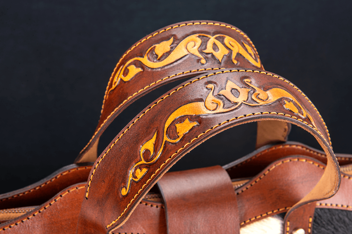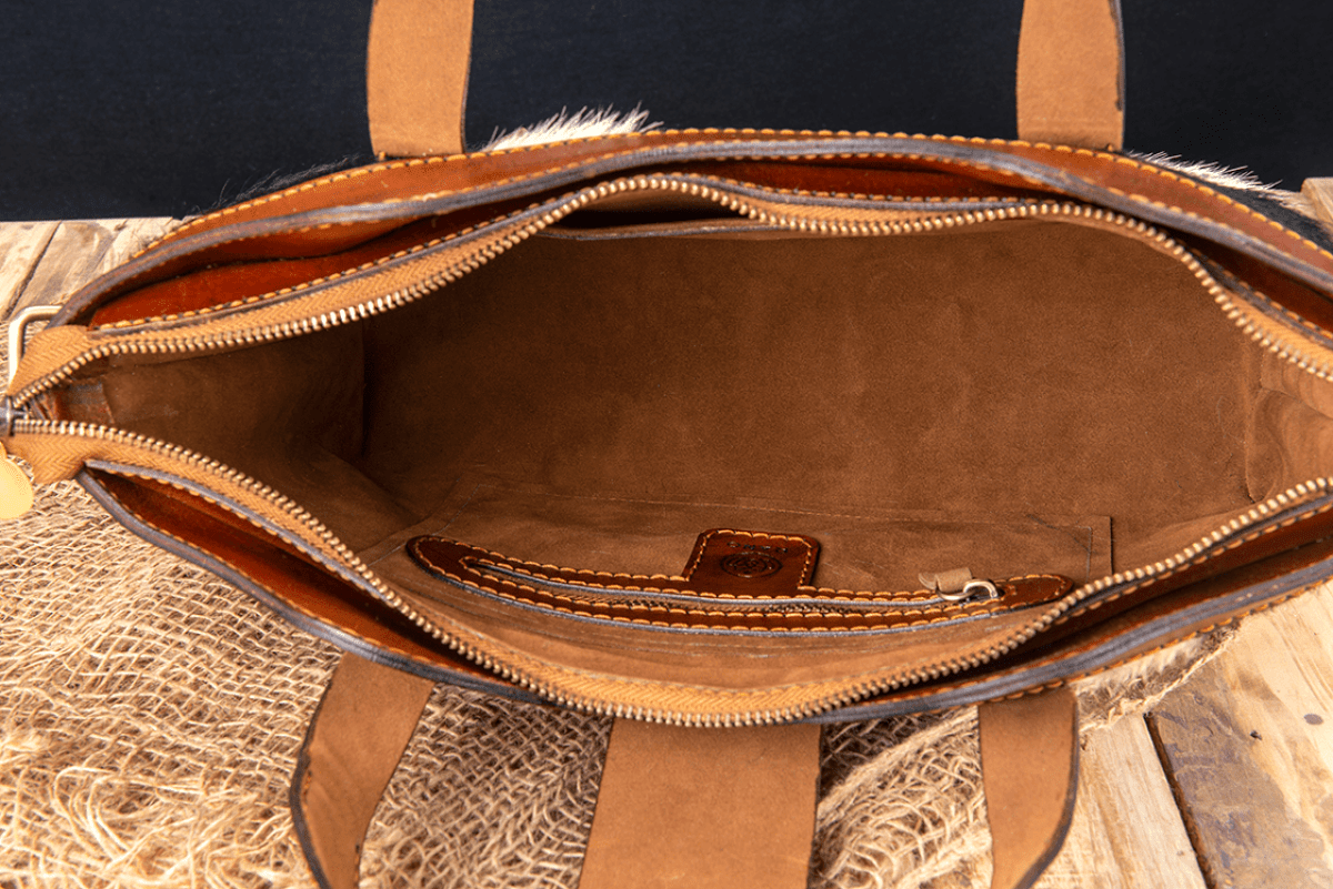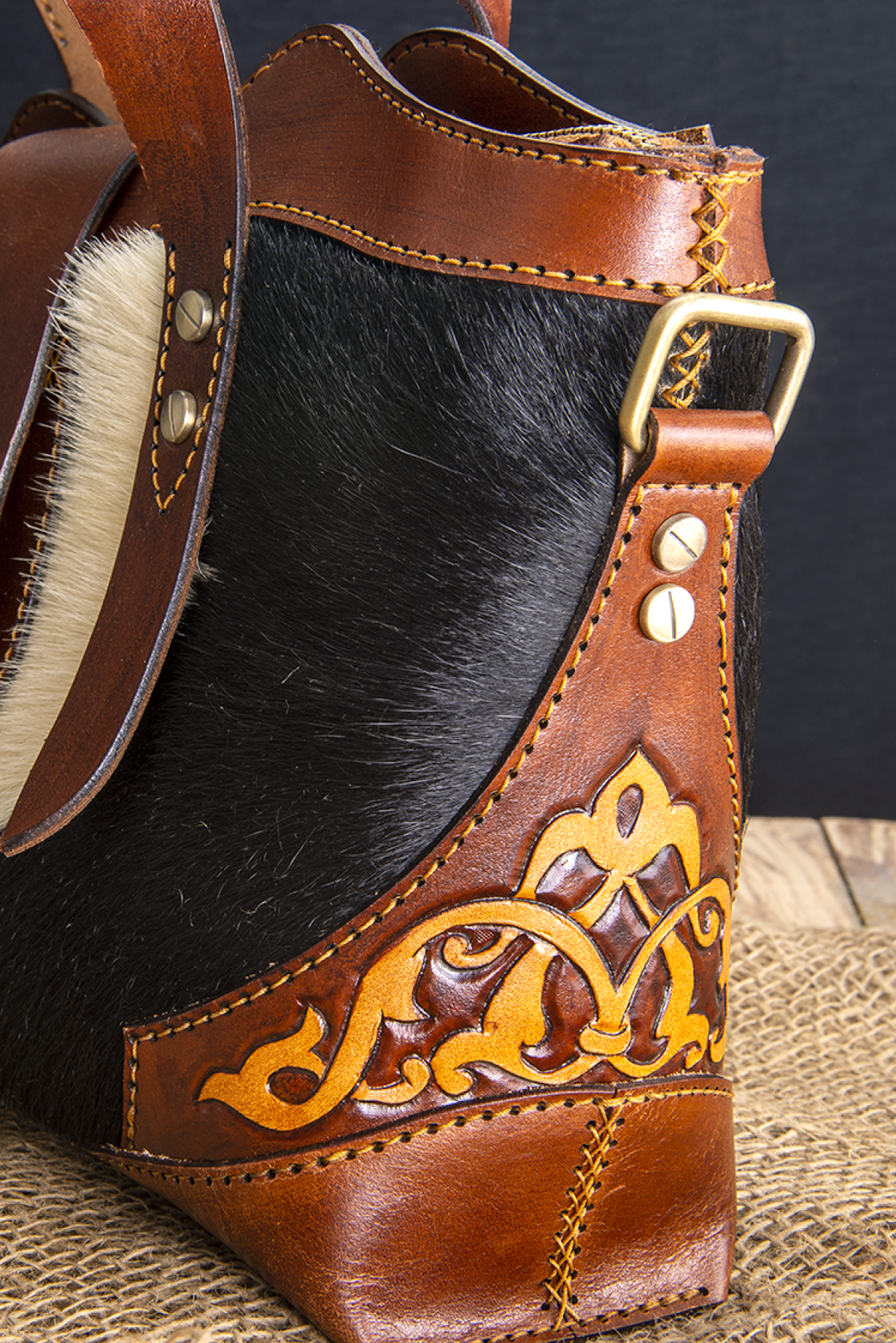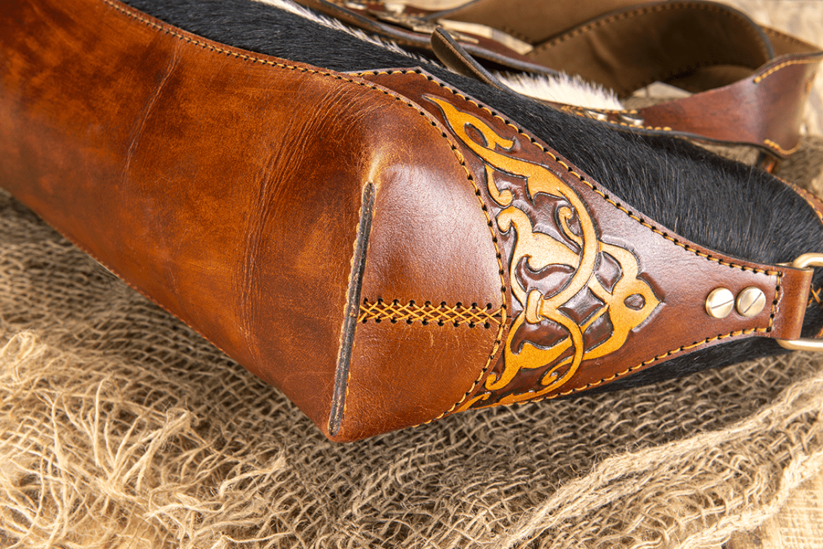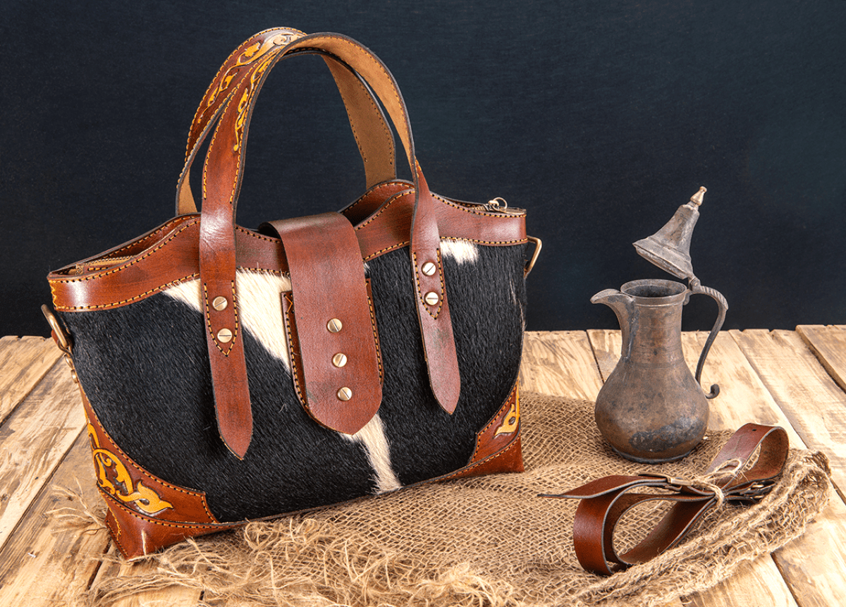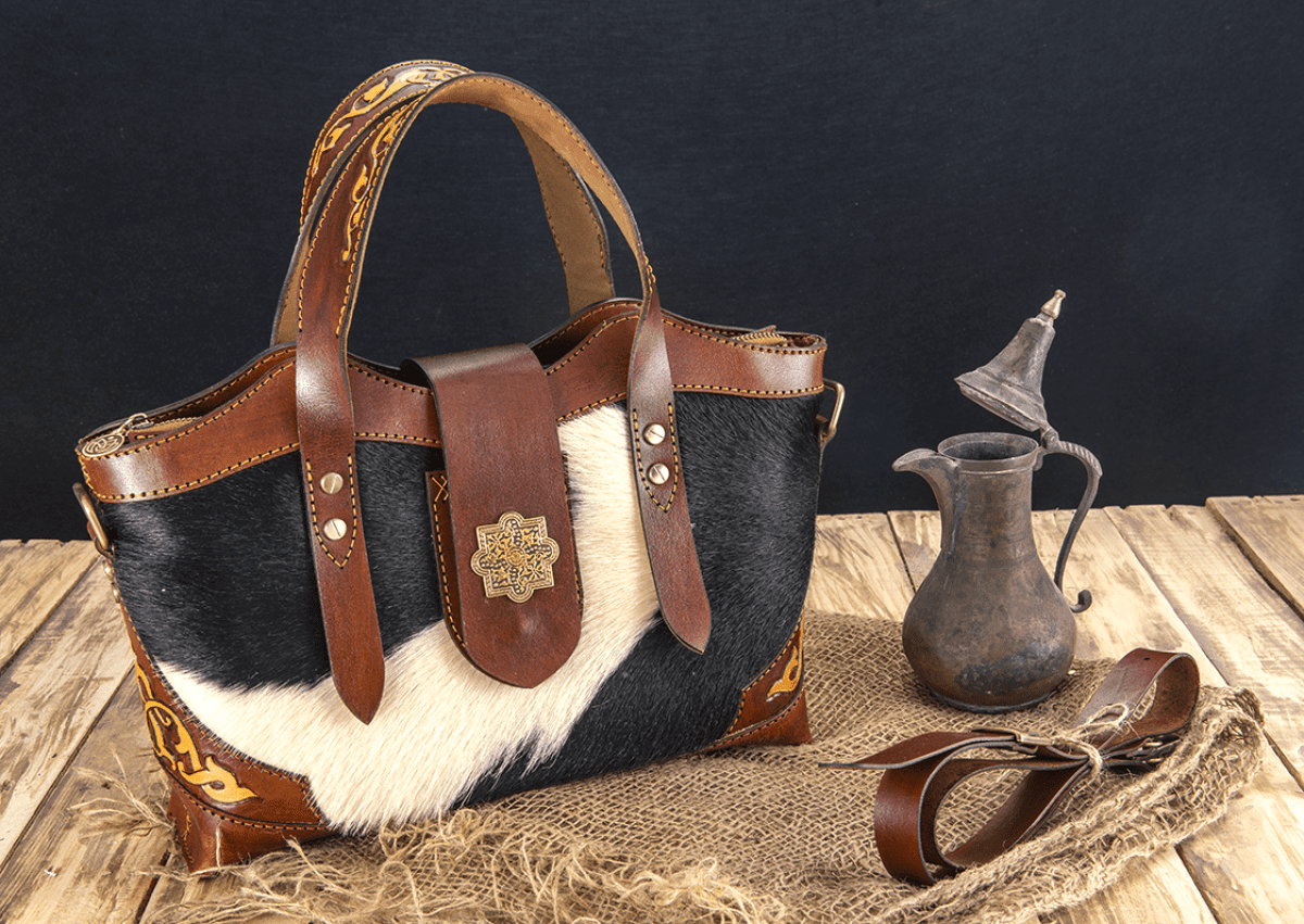 Women’s hair handbag Hairy cowhide with rawhide Hand-carved Islamic inscriptions Hand dyeing Copper ornament Hand stitching Colours: beige, black and dark havana Dimensions: 35*22*10 A unique piece that cannot be repeated When repeated, the color of the skin and hair changes