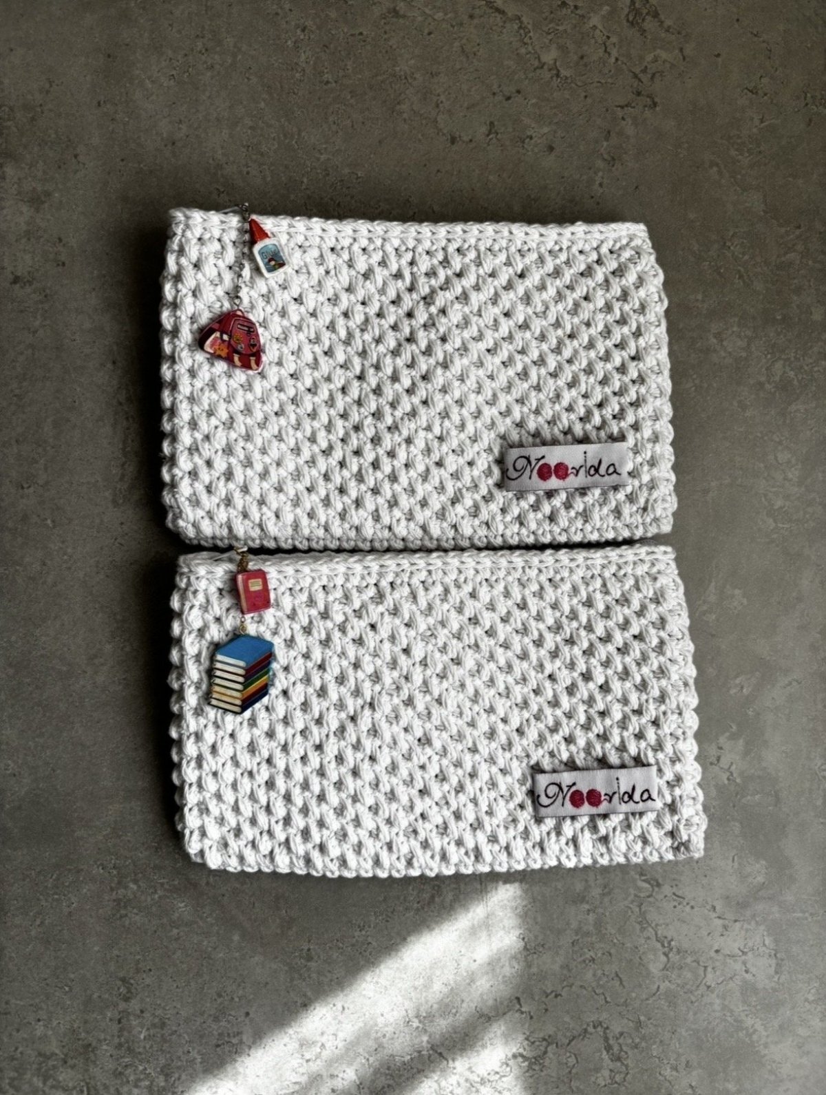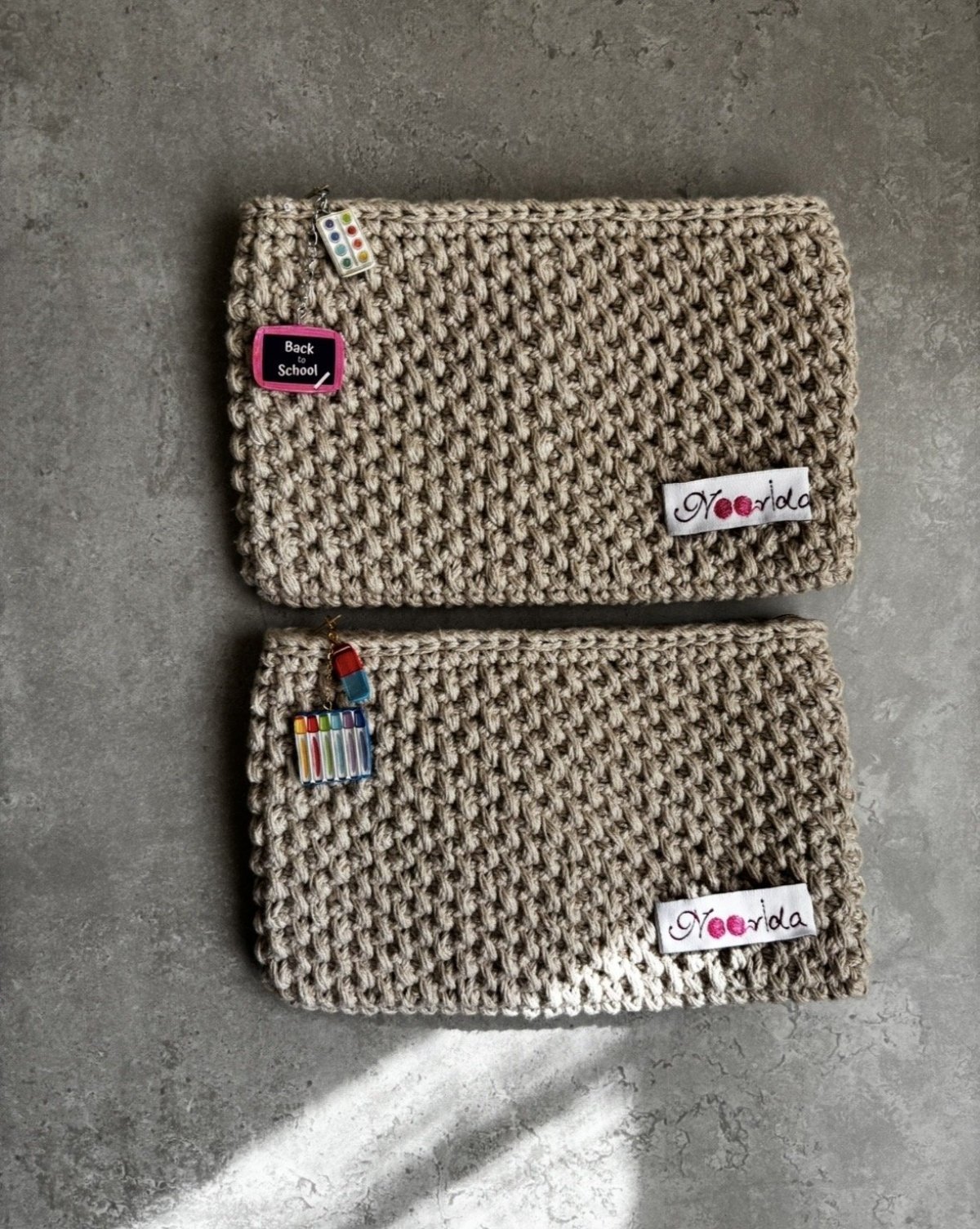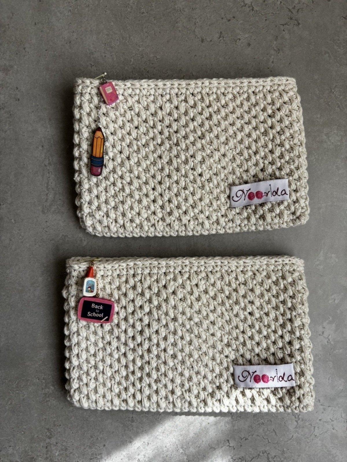 مقلمة مصنوعة من خيط قطن مصري مناسبة للطلبة والمدرسين ، بسوستة للحفاظ علي أدواتك مزينة بأشكال متوفرة فوري متاحة بثلاث ألوان [ أبيض ، أوف وايت ، بيج ]