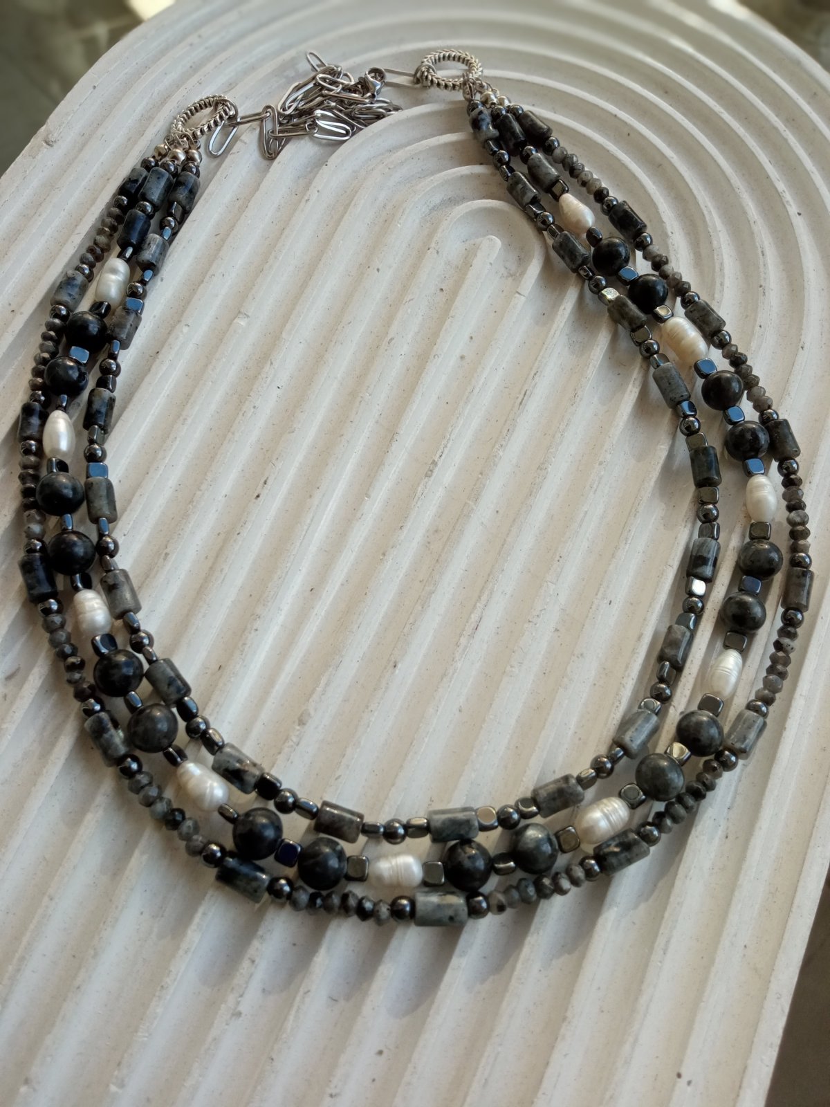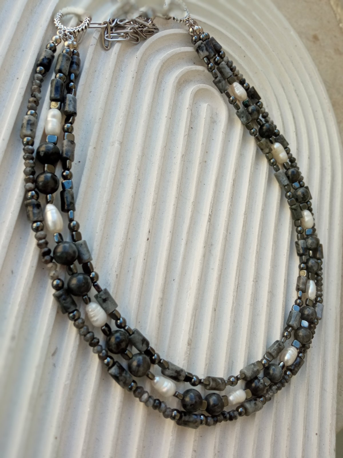 كوليه هاند ميد من حجر لابرادوريت مع فواصل هيماتيت جراي و مطعم ب اللؤلؤ الطبيعي طول الكوليه حوالي 51 سم مزود بسلسلة ستانلس للتحكم في الطول
