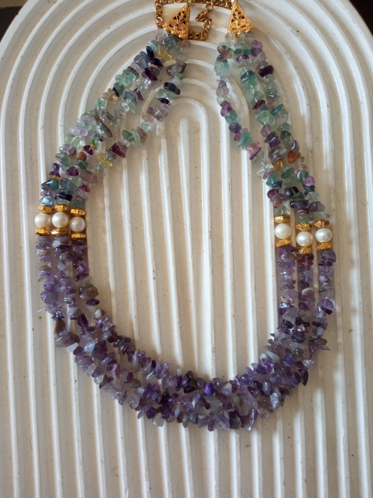 قلادة مصنوعة يدوياً تجمع بين حجر الأماتيست الأرجواني وفلوريت مطعم بلؤلؤ طبيعي، مع فواصل ذهب صيني لإضافة لمسة فاخرة. تناغم الألوان البنفسجي الهادئ مع اللمعان الطبيعي للؤلؤ واللمسات الذهبية يعطيان قطعة أنيقة مناسبة للاستخدام اليومي والمناسبات. طول الكوليه 51سم مزود بسلسلة خلفية للتحكم في الطول
