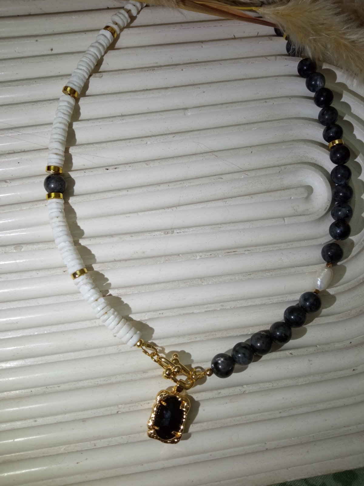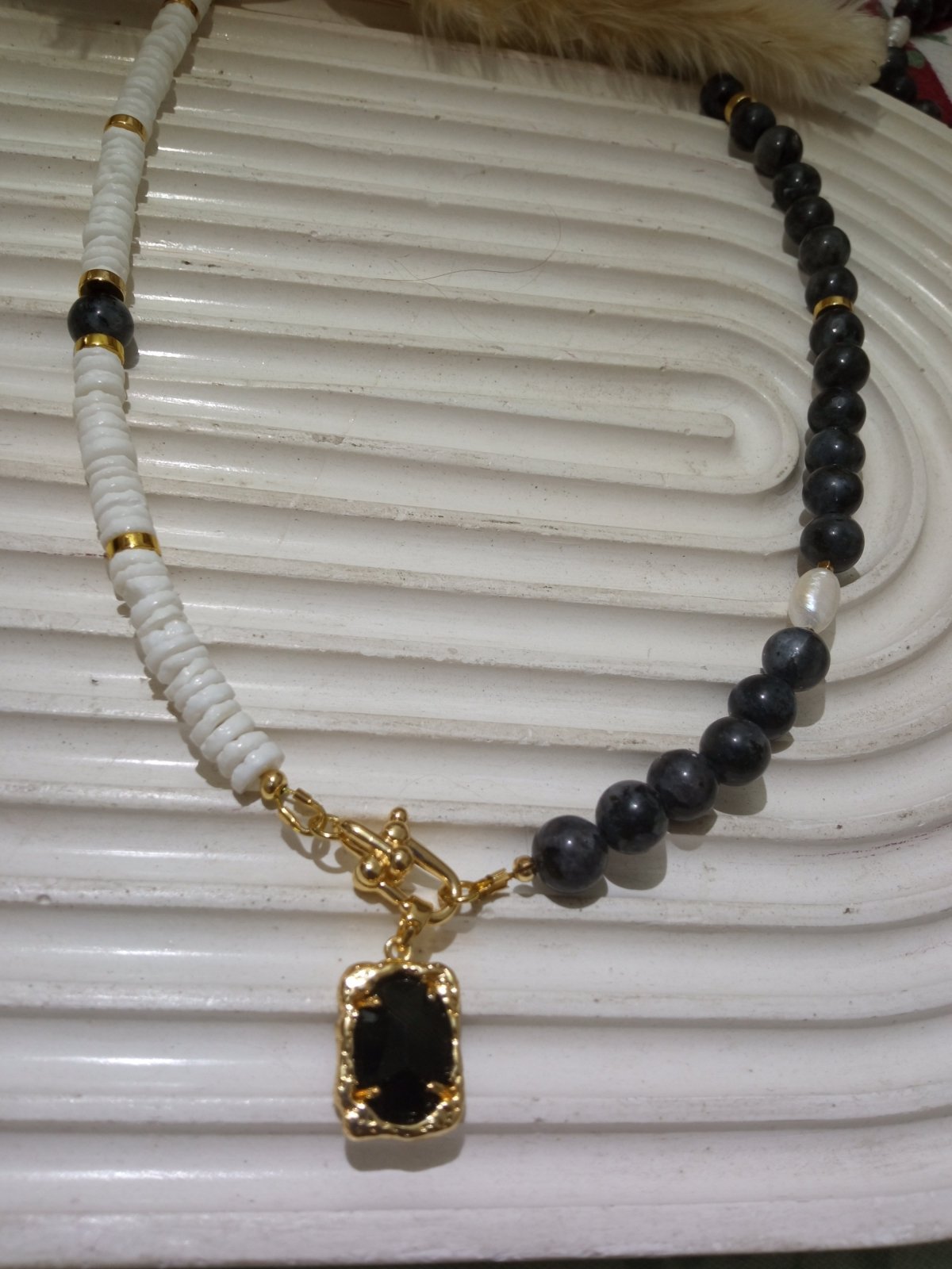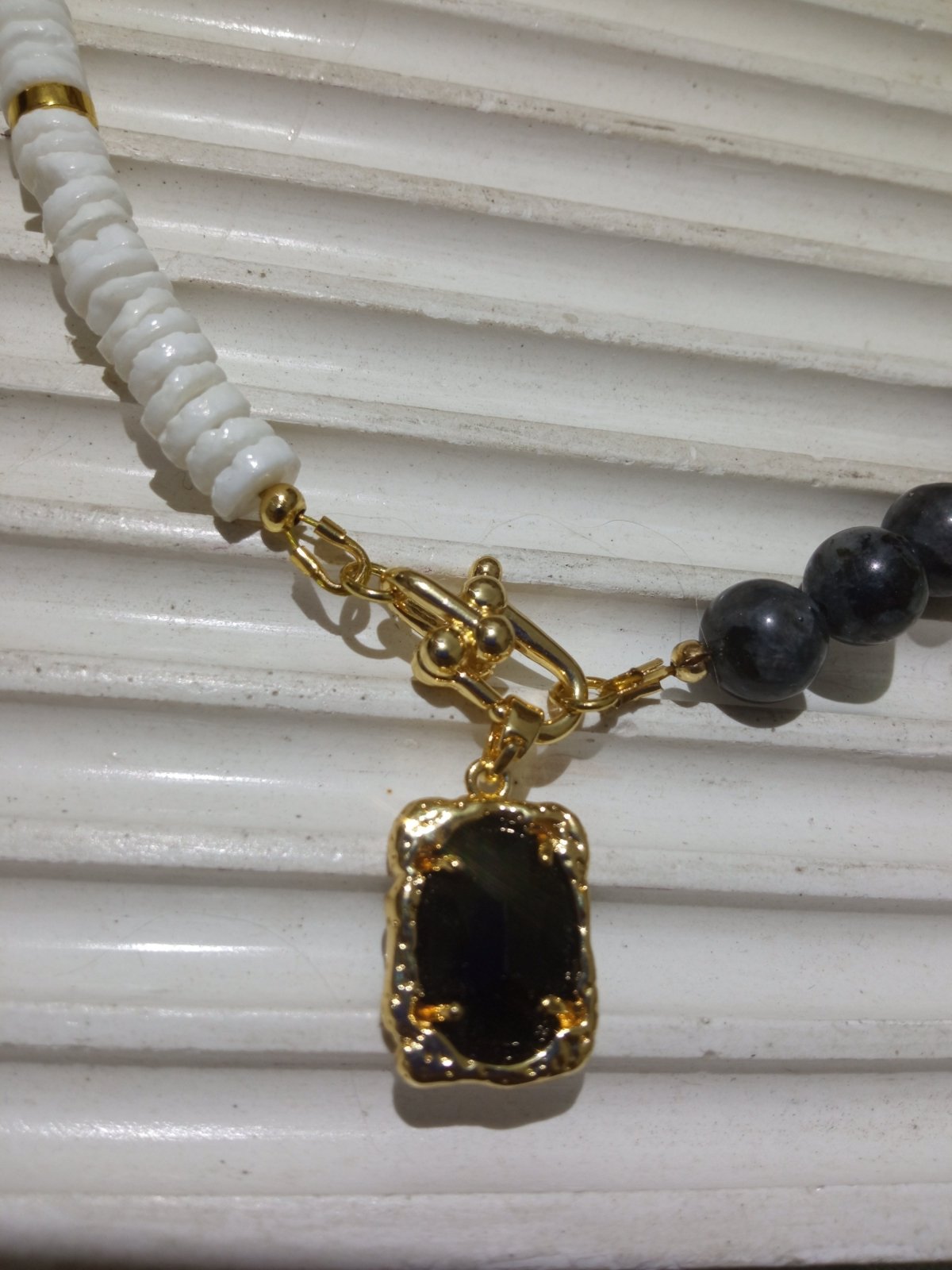 كوليه هاندميد من حجر اللابرادوريت مع صدف و فواصل دهب صيني و لولي طبيعي مع قفل مميز و دلاية دهب صيني طول الكوليه حوالي 51سم مزود ب اكستنشن للتحكم في الطول متوفرة في الجولد و السيلفر