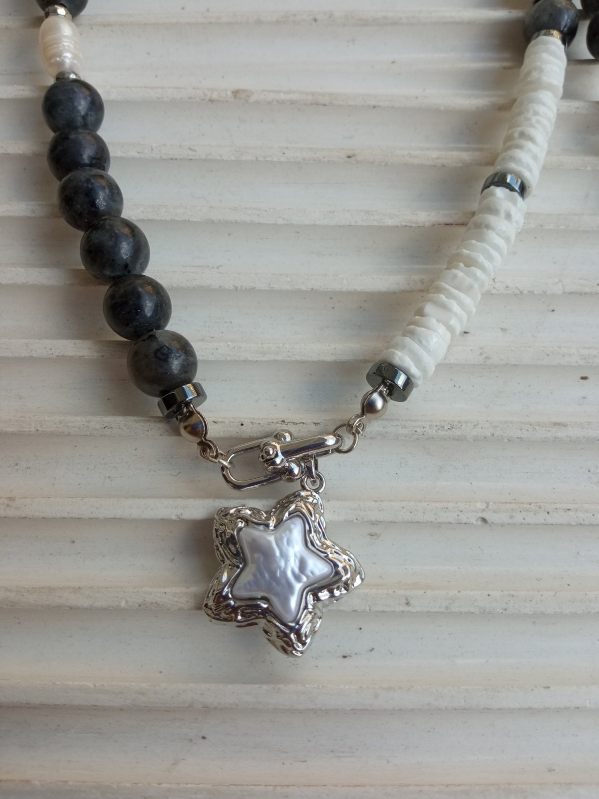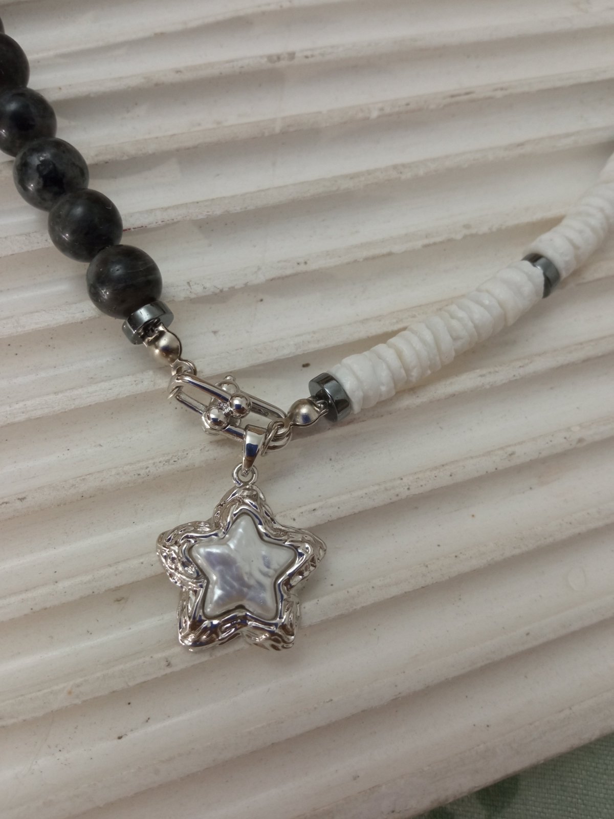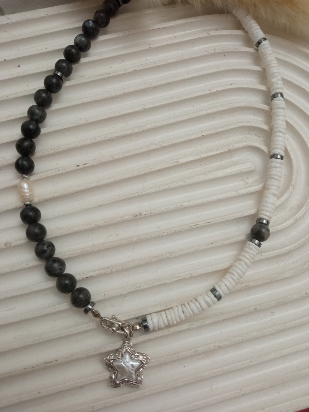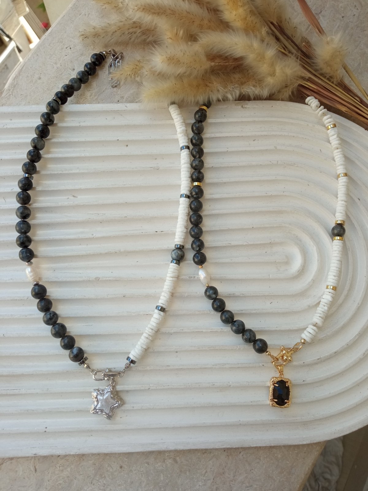 كوليه هاندميد من حجر اللابرادوريت مع صدف و فواصل دهب صيني و لولي طبيعي مع قفل مميز و دلاية دهب صيني طول الكوليه حوالي 51سم مزود ب اكستنشن للتحكم في الطول متوفرة في الجولد و السيلفر