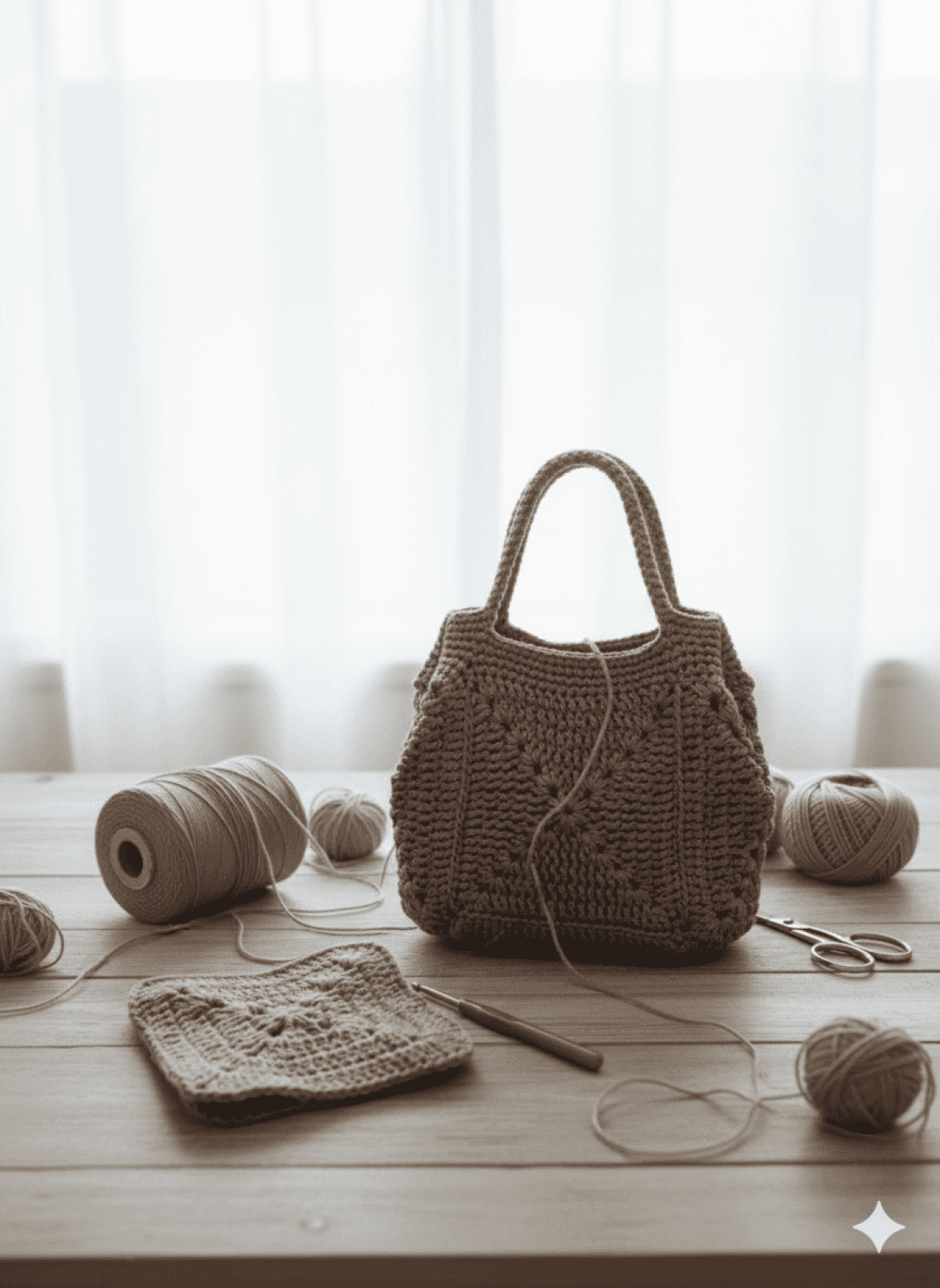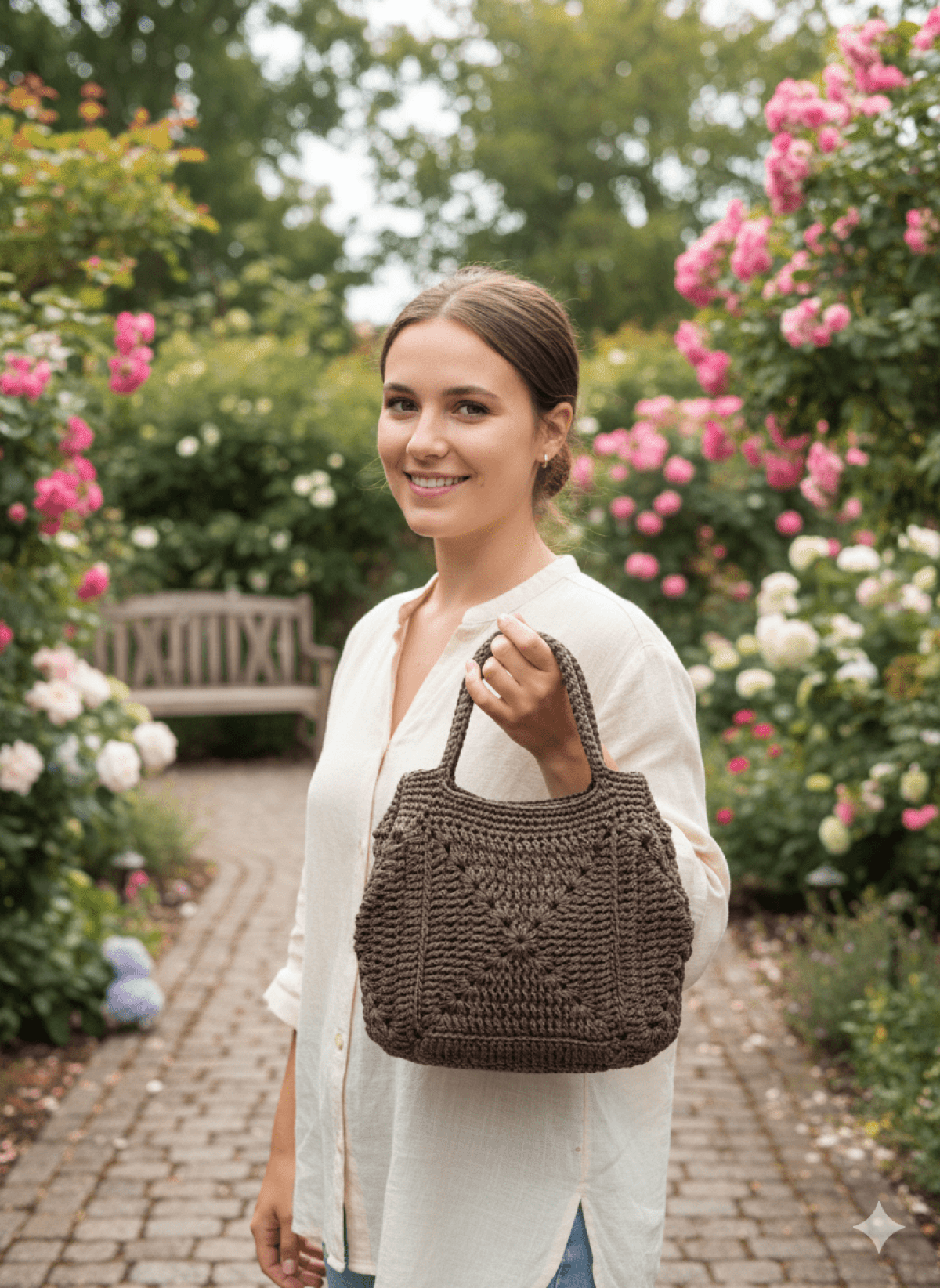 شنطه كروشيه عباره عن ٥ مربعات جرانى مقاس المربع ١٥سم مبطنه من الداخل وبقفل ومرتاح تنفيذها بحجم اكبر ويد طويله لونها بيج مائل للبنى وايضا يمكن تغيير اللون الخيط مكرمين قطن Acrochet square granny bag consisting of five15cmgranny squares,lined from the inside,with aclasp.its comfortable to make in a larger size with along handle,in a beige to brown color,also a thread color can be changed.the thread is cotton macrame.